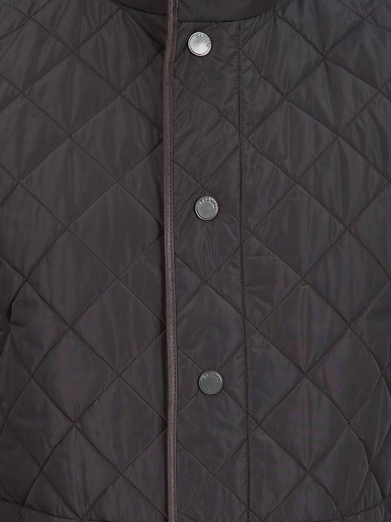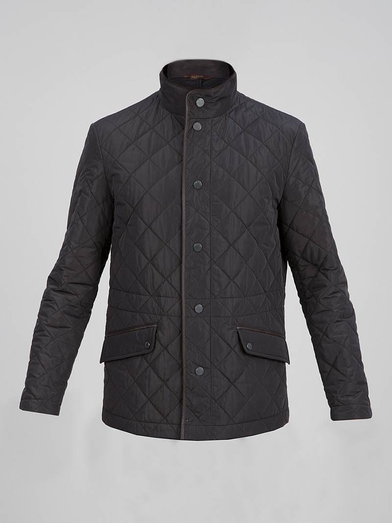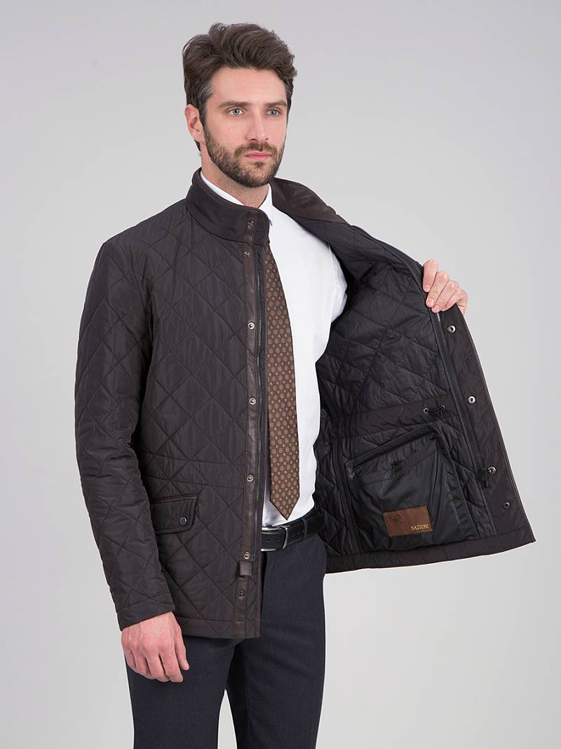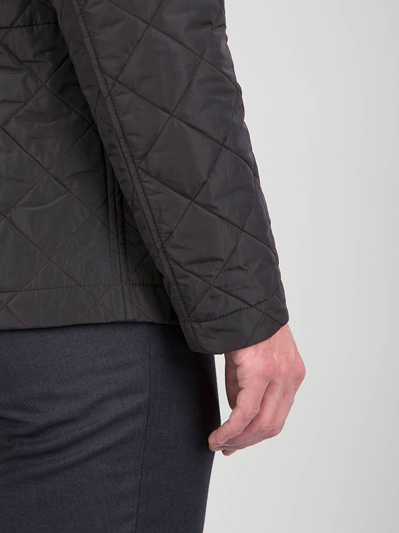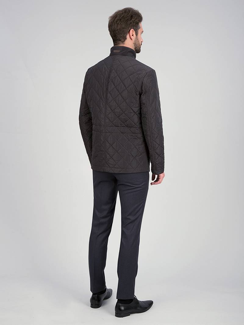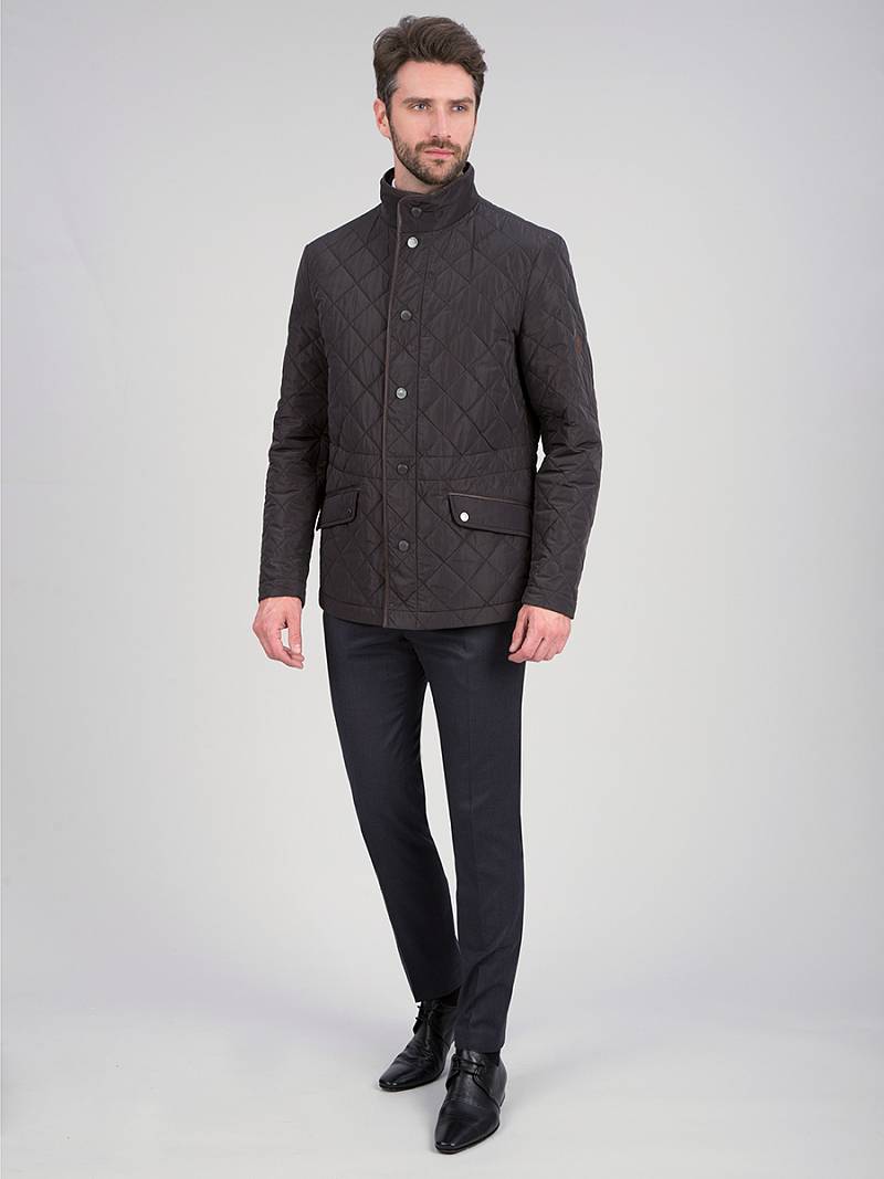 Куртка мужская из стеганой ткани, без подкладки. Все внутренние швы окантованы. Отделочная ткань-рамки карманов, окантовка борта и воротника, нижняя часть клапана, планка под нижние детали кнопки, Центральная застежка на молнию и кнопки. Воротник-стойка. Боковые карманы "в рамку" с клапаном, На линии талии кулиска, регулирующая обхват талии. Спинка со средним швом. Рукава втачные. На левом рукаве и на стойке - нашивки с логотипом. Два внутренних накладных кармана на пуговицах. Утеплитель- синтепон 100г.