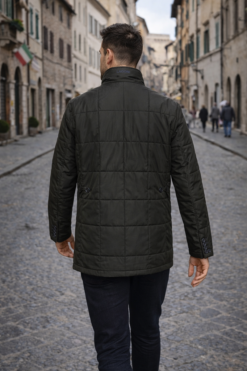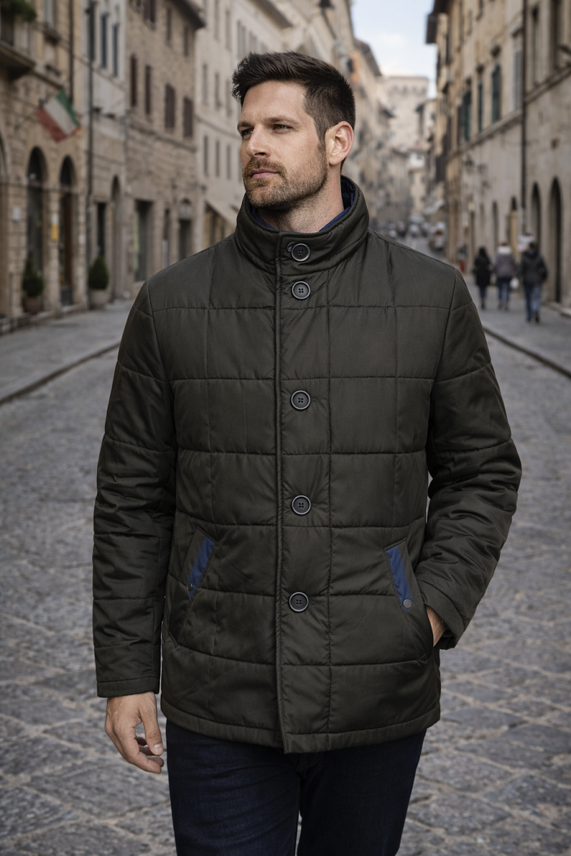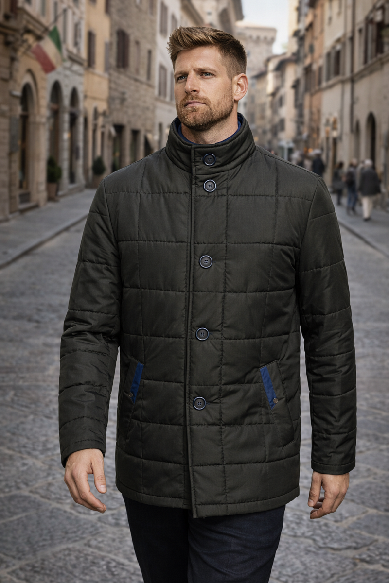 Куртка мужская из стеганой ткани, застёжка на пуговицы, воротник стойка, карманы листочки на магнитах. Вышивка. Длина изделия по спинке для роста 176 - 78см. Ткань верха: 100%полиэстер. Подкладка: 100%полиэстер. Утеплитель: термоплюс 100 гр.
