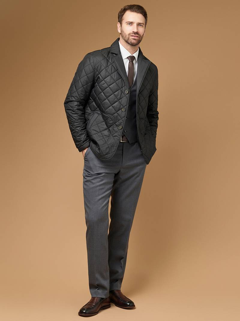 Куртка - пиджак мужской стёганый с утеплителем, Застёжка на три пуговицы, Карманы - с листочкой, Воротник - с лацканами. Длина изделия по спинке для роста 176 - 72см. Ткань верха: 100%полиэстер. Подкладка: 100%полиэстер. Утеплитель: термоплюс 100 гр./100гр.