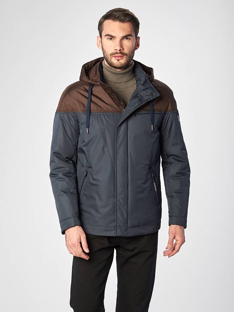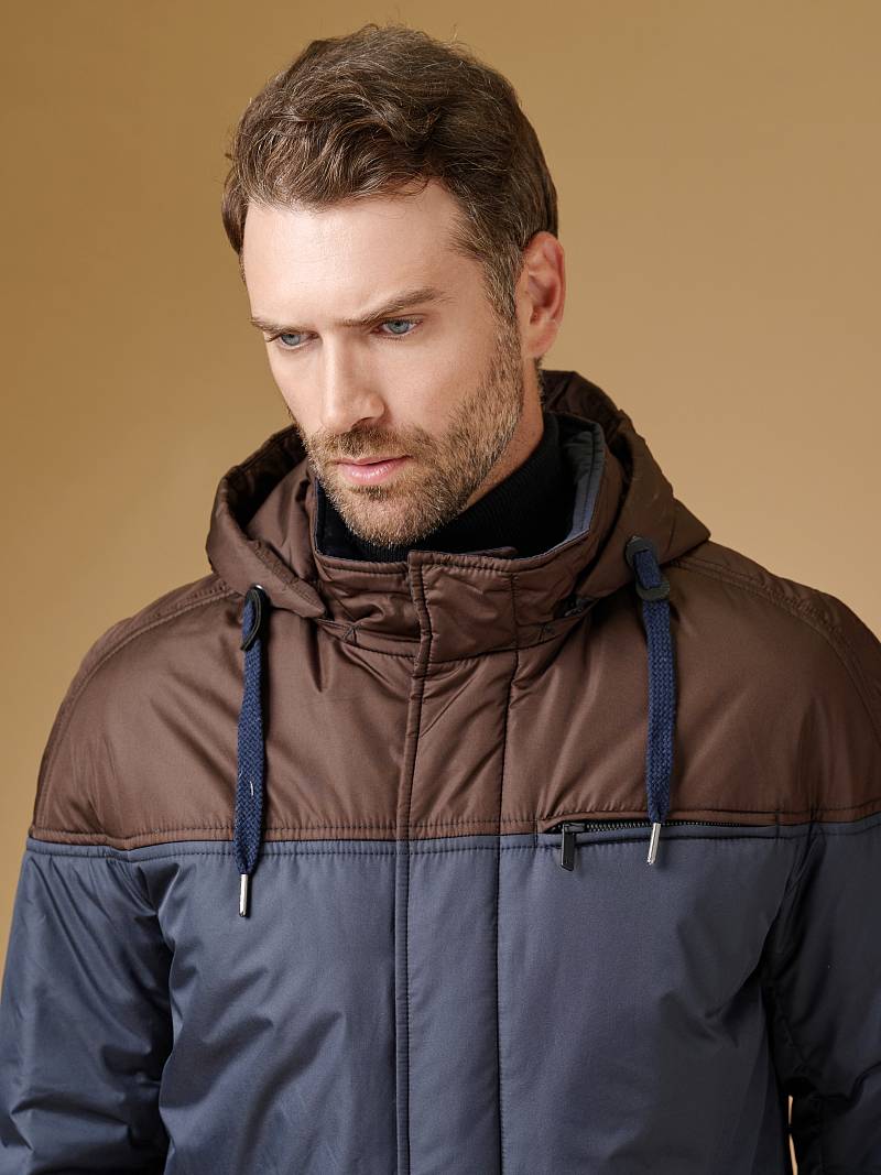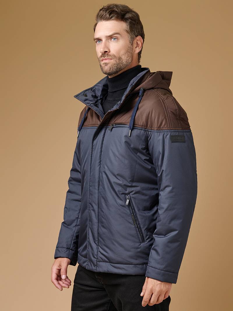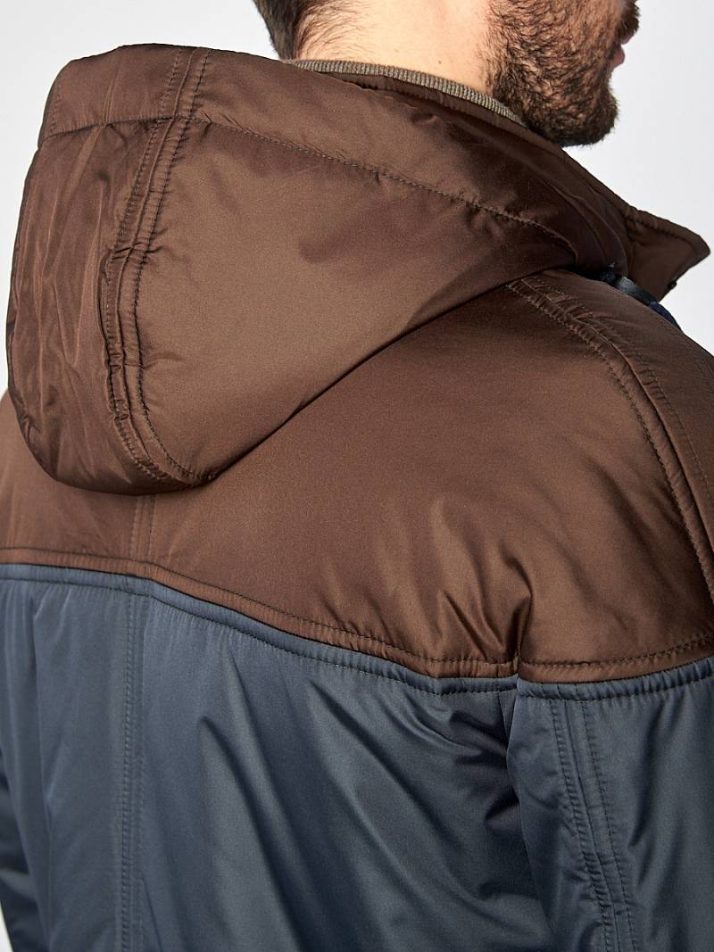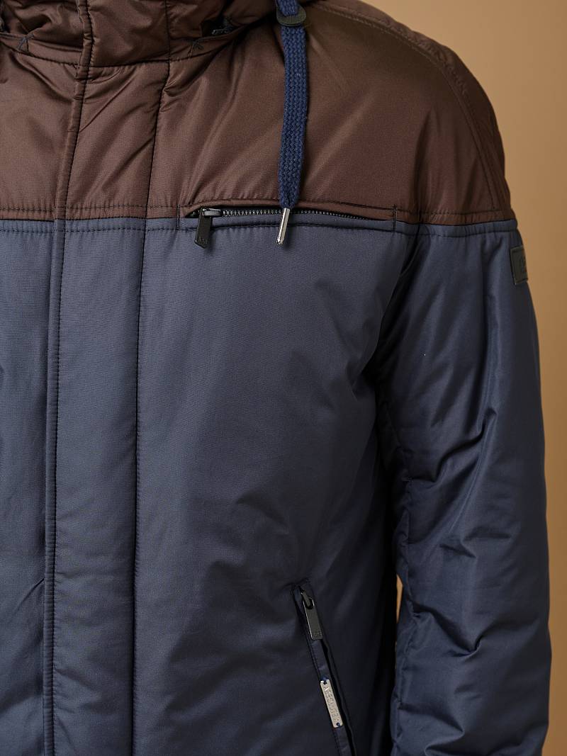 Куртка мужская утепленная с капюшоном из плащевой ткани на подкладке с центральной застежкой на молнию закрытую планкой на потайных кнопках. Воротник стойка. Съемный капюшон на молнии. Передний край капюшона - оформлен кулисой, которая затягивается двумя кожаными фиксаторами. Верхняя часть изделия(воротник, капюшон, кокетки полочек и спинки, верхние отрезные части рукавов) выполнены из основной ткани другого цвета. Боковые карманы "в рамку" на молниях. По центру левого бокового кармана, на обтачке -металлическая нашивка с логотипом. Нагрудный горизонтальный карман на левой полочке-"в шве" притачивания кокетки, на молнии . Рукава втачные состоят из двух частей, На верхней части левого рукава- фирменная нашивка. Подкладка состоит из верхней и нижней частей. Нижняя часть подкладки декорирована трикотажной "сеткой". На подкладке спинки в области талии - отделочная тесьма с фирменным логотипом , на полочках подкладки- 2 горизонтальных внутренних прорезных кармана с втачной листочкой на молнии. Длина изделия по спи