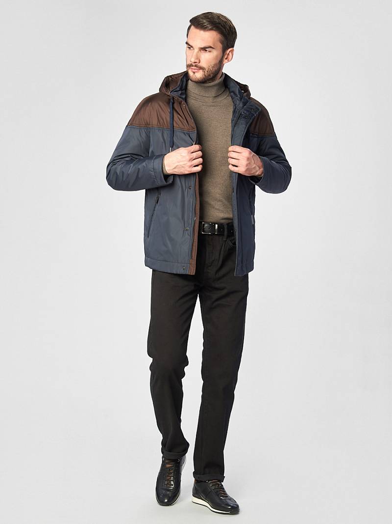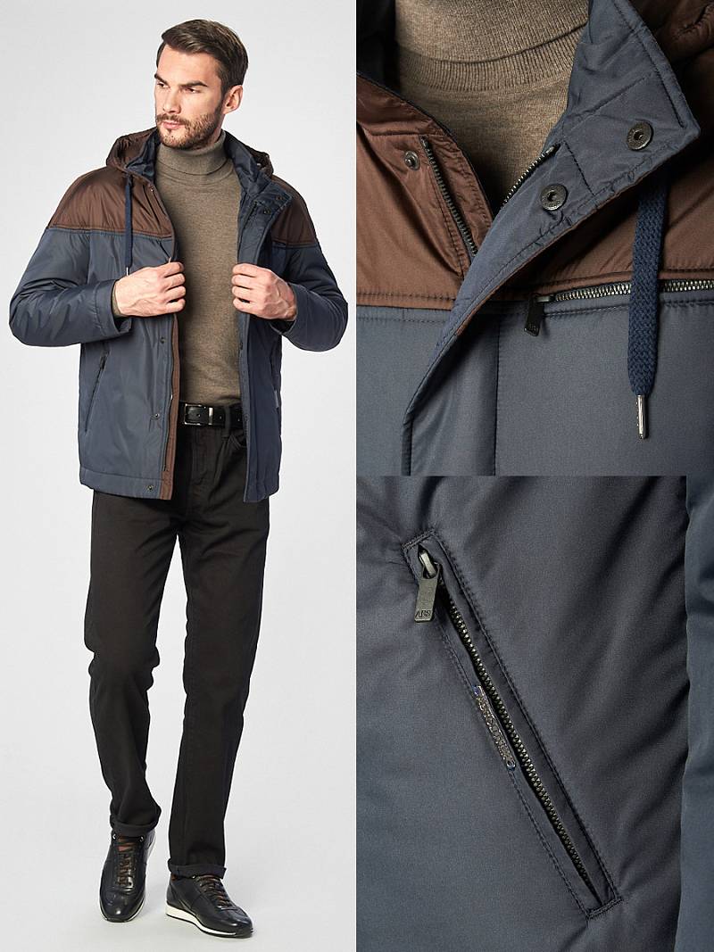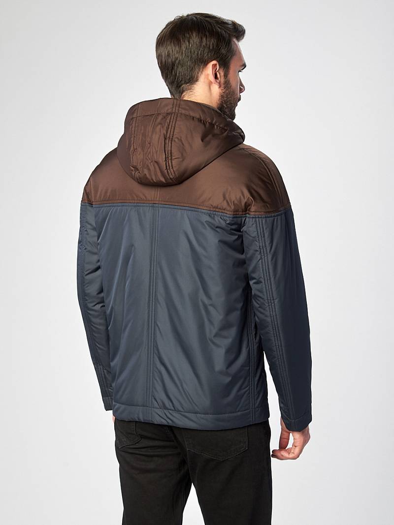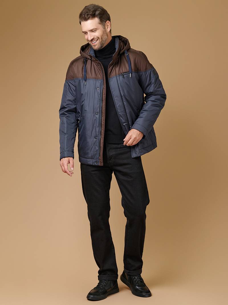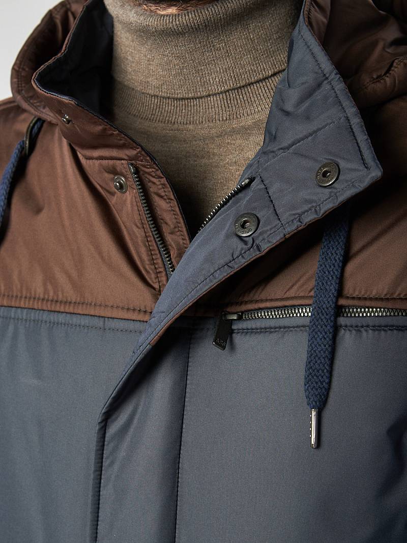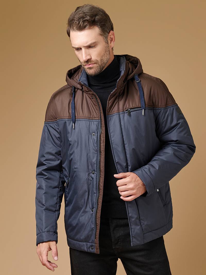 Куртка мужская утепленная с капюшоном из плащевой ткани на подкладке с центральной застежкой на молнию закрытую планкой на потайных кнопках. Воротник стойка. Съемный капюшон на молнии. Передний край капюшона - оформлен кулисой, которая затягивается двумя кожаными фиксаторами. Верхняя часть изделия(воротник, капюшон, кокетки полочек и спинки, верхние отрезные части рукавов) выполнены из основной ткани другого цвета. Боковые карманы "в рамку" на молниях. По центру левого бокового кармана, на обтачке -металлическая нашивка с логотипом. Нагрудный горизонтальный карман на левой полочке-"в шве" притачивания кокетки, на молнии . Рукава втачные состоят из двух частей, На верхней части левого рукава- фирменная нашивка. Подкладка состоит из верхней и нижней частей. Нижняя часть подкладки декорирована трикотажной "сеткой". На подкладке спинки в области талии - отделочная тесьма с фирменным логотипом , на полочках подкладки- 2 горизонтальных внутренних прорезных кармана с втачной листочкой на молнии. Длина изделия по спи