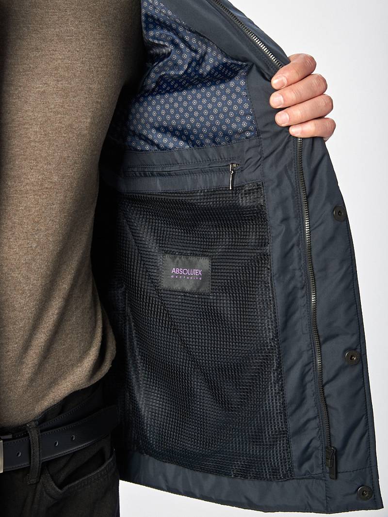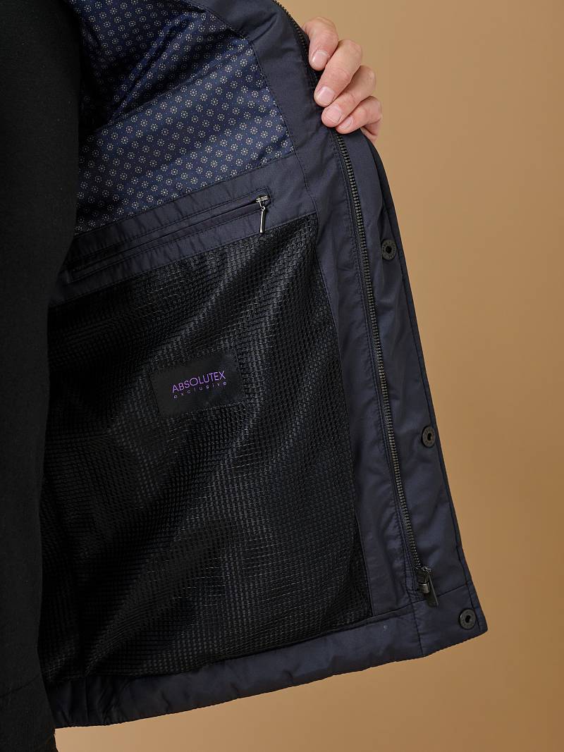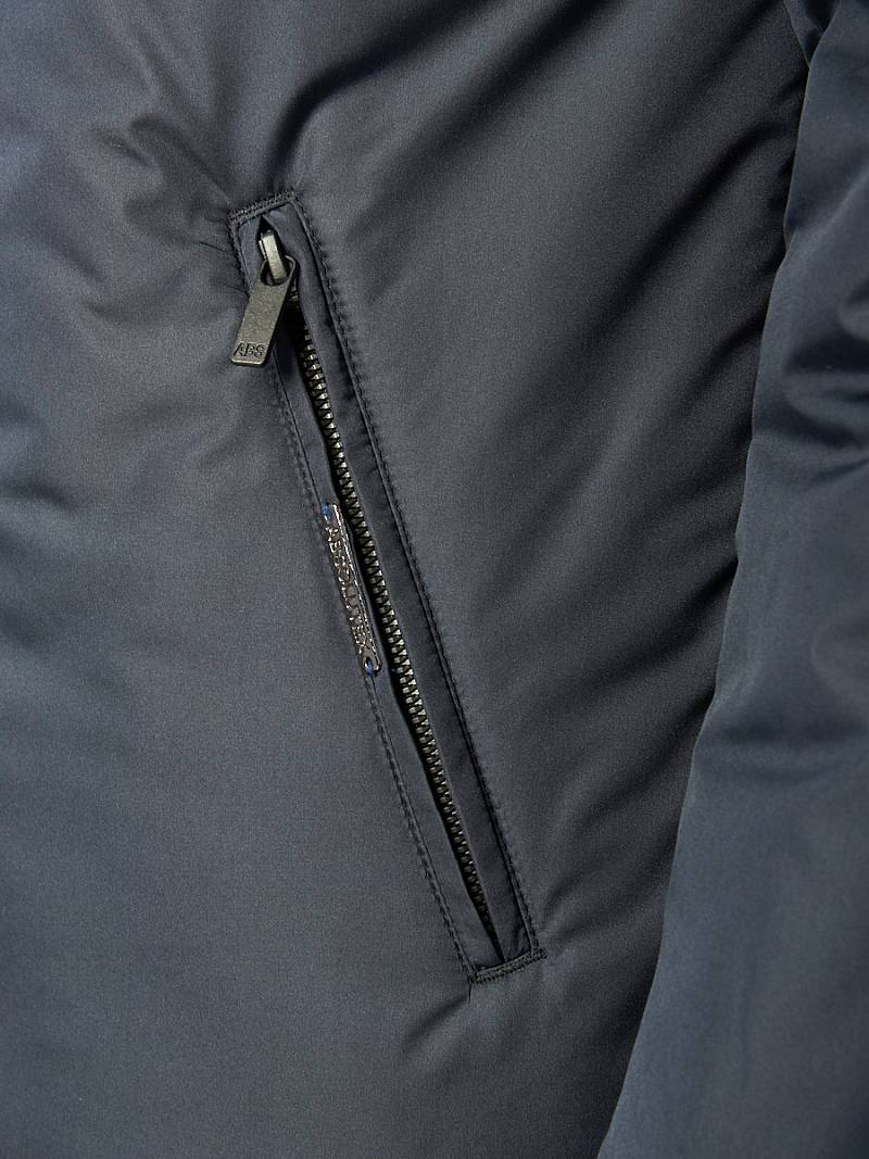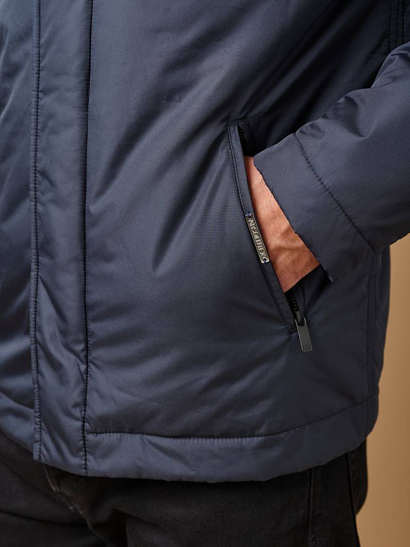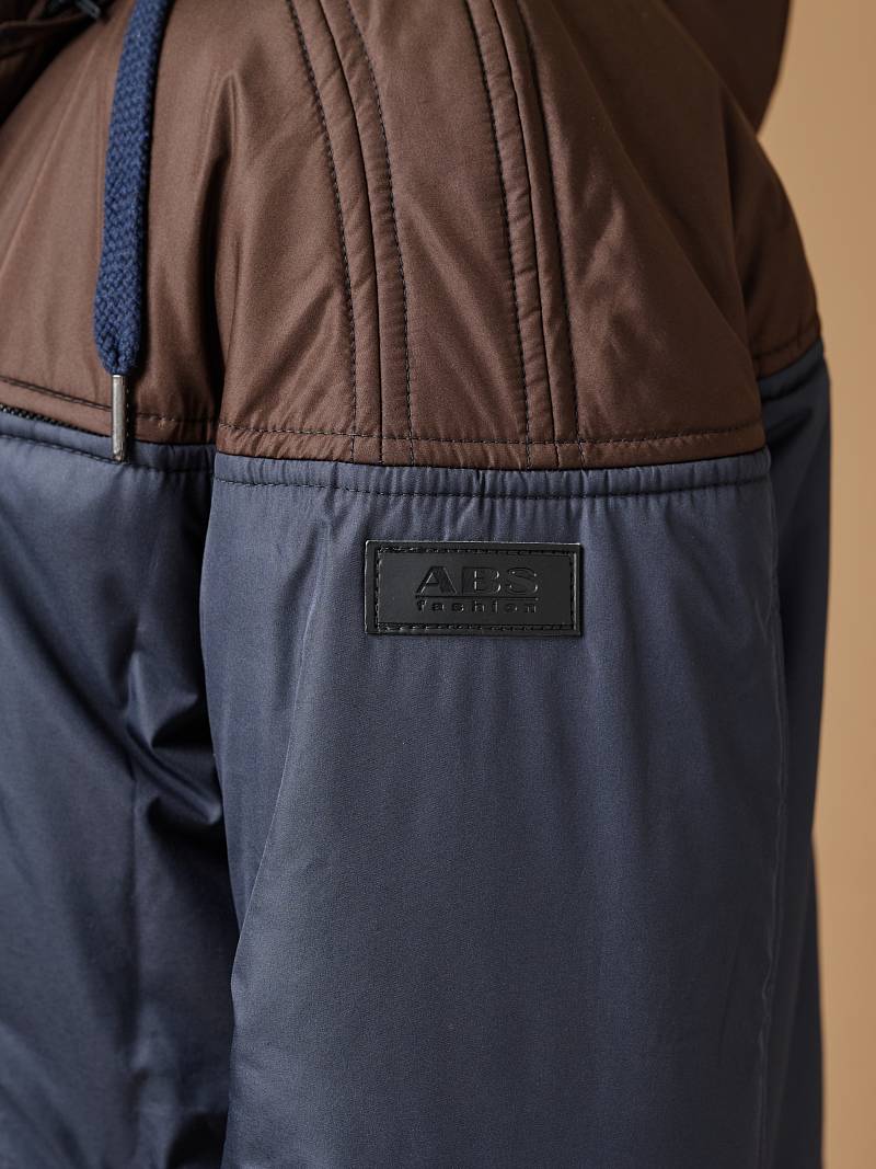 Куртка мужская утепленная с капюшоном из плащевой ткани на подкладке с центральной застежкой на молнию закрытую планкой на потайных кнопках. Воротник стойка. Съемный капюшон на молнии. Передний край капюшона - оформлен кулисой, которая затягивается двумя кожаными фиксаторами. Верхняя часть изделия(воротник, капюшон, кокетки полочек и спинки, верхние отрезные части рукавов) выполнены из основной ткани другого цвета. Боковые карманы "в рамку" на молниях. По центру левого бокового кармана, на обтачке -металлическая нашивка с логотипом. Нагрудный горизонтальный карман на левой полочке-"в шве" притачивания кокетки, на молнии . Рукава втачные состоят из двух частей, На верхней части левого рукава- фирменная нашивка. Подкладка состоит из верхней и нижней частей. Нижняя часть подкладки декорирована трикотажной "сеткой". На подкладке спинки в области талии - отделочная тесьма с фирменным логотипом , на полочках подкладки- 2 горизонтальных внутренних прорезных кармана с втачной листочкой на молнии. Длина изделия по спи