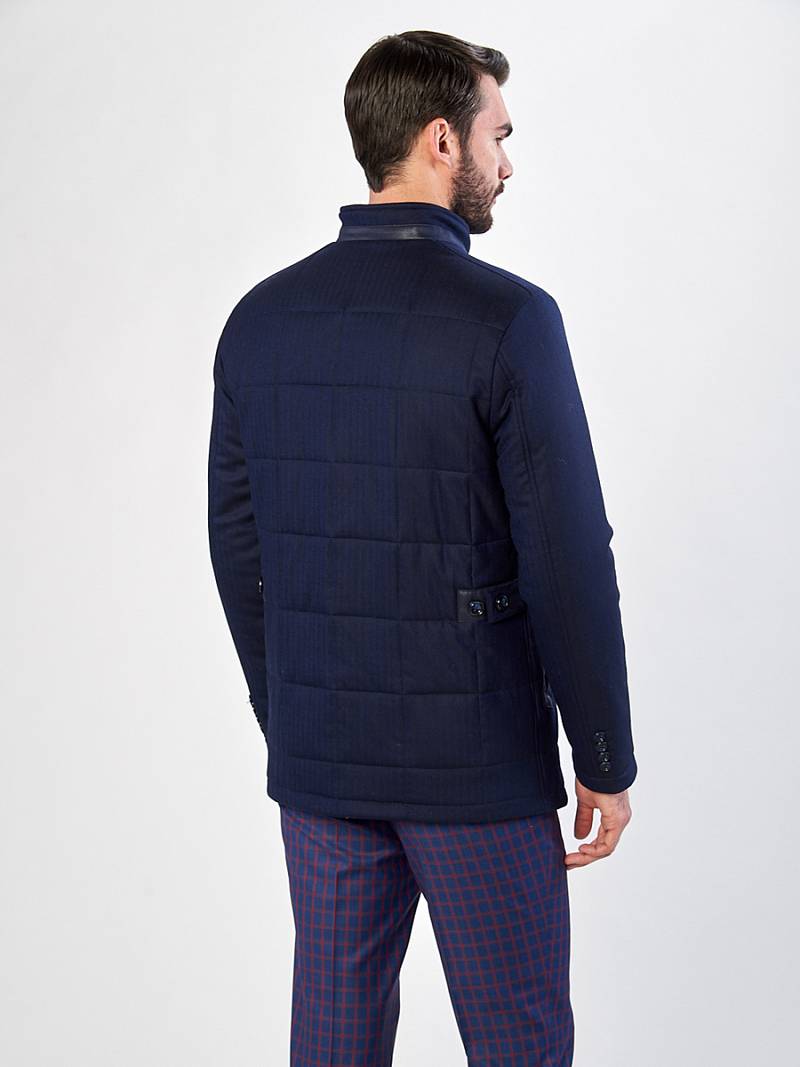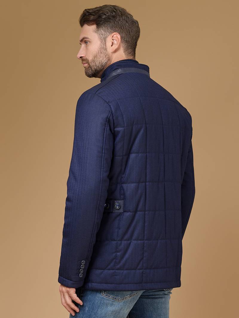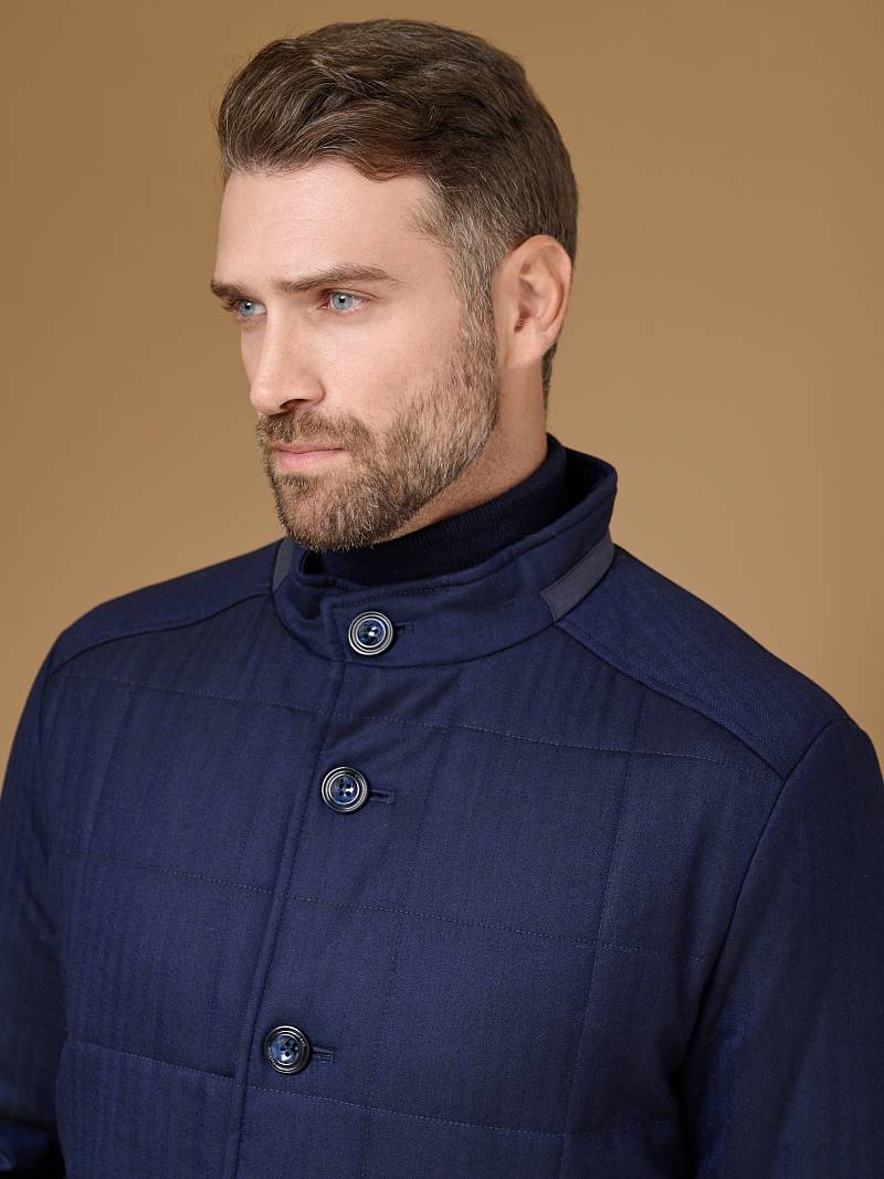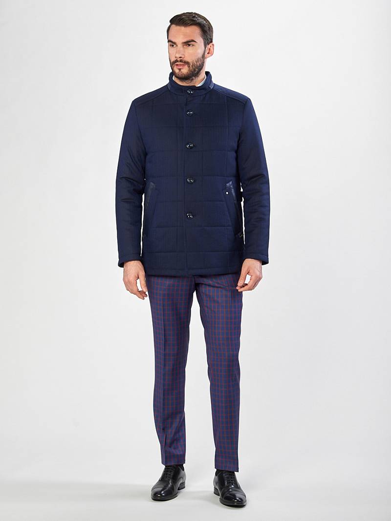 Куртка мужская из стеганой ткани, застёжка на пуговицы, Воротник стойка. Карманы листочки на магнитах. Вертикальная стежка на кокетках полочек и на рукавах в области налокотника. Нижняя деталь воротника, верхняя листочка и паты на спинке выполнены из отделочной ткани. Длина изделия по спинке для роста 50/176 - 78см. Ткань верха: 100%шерсть. Подкладка: 100%полиэстер. Утеплитель: 100гр