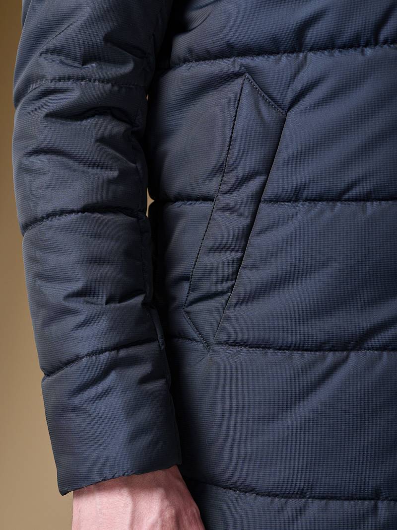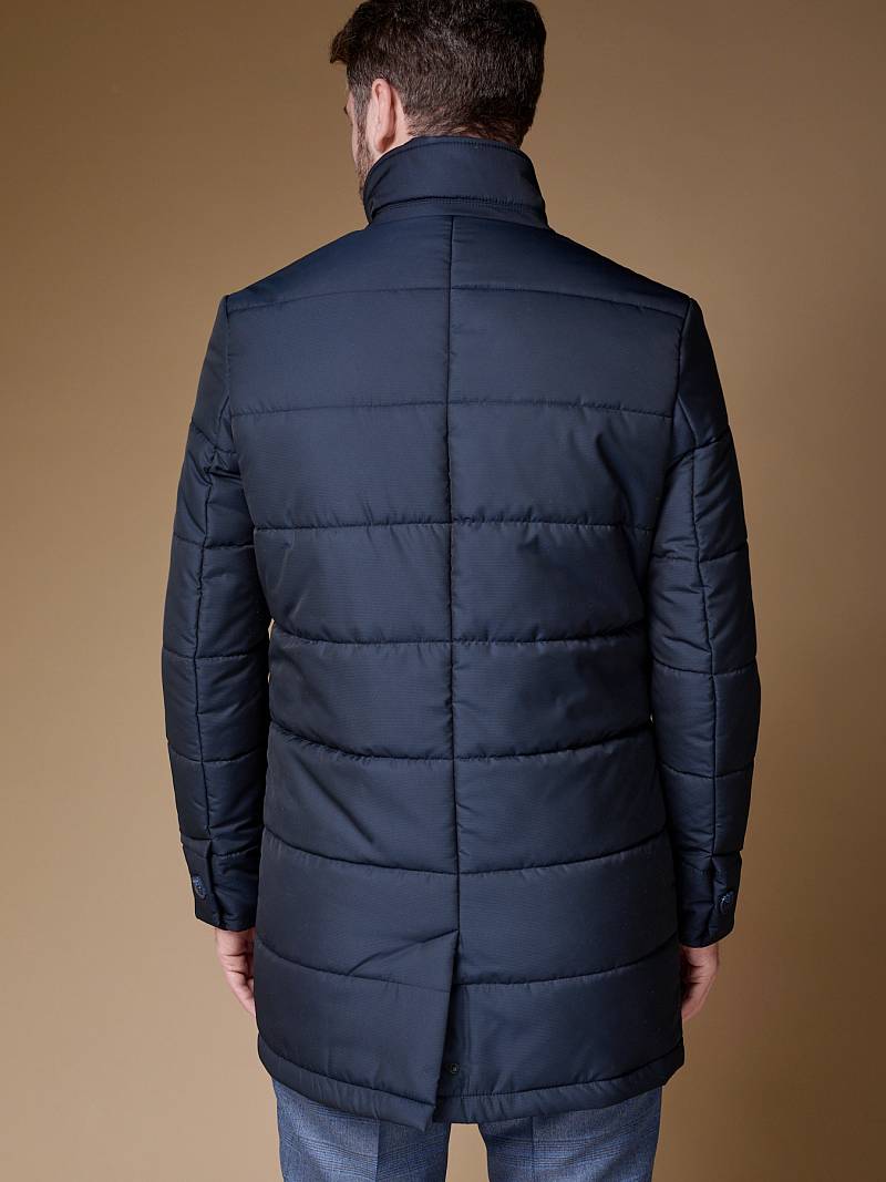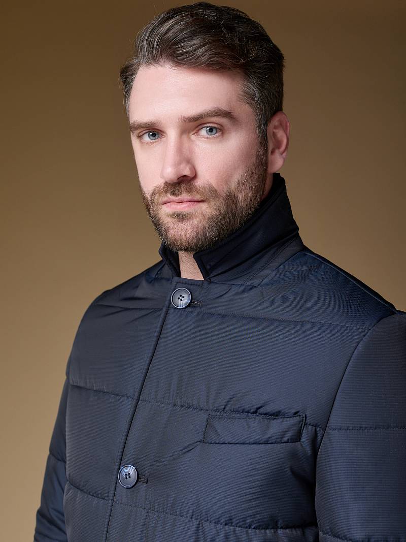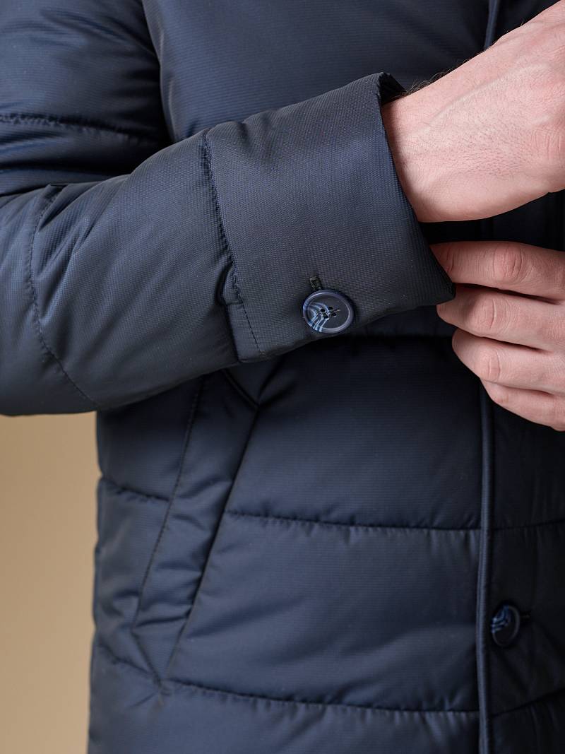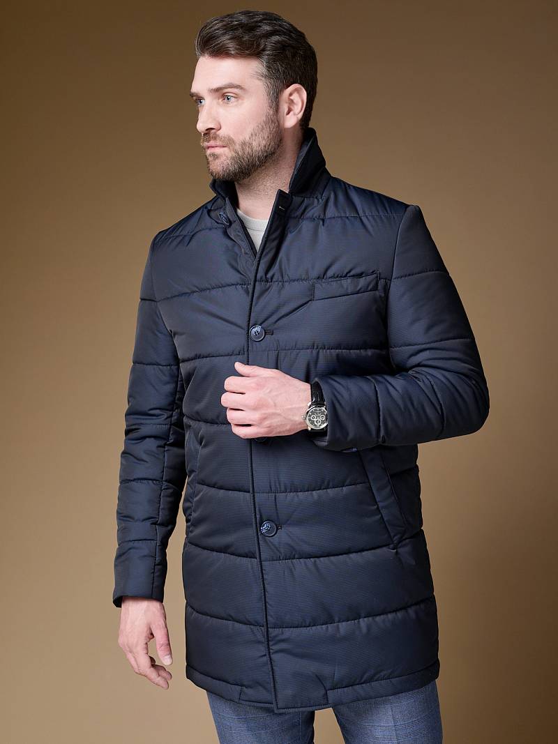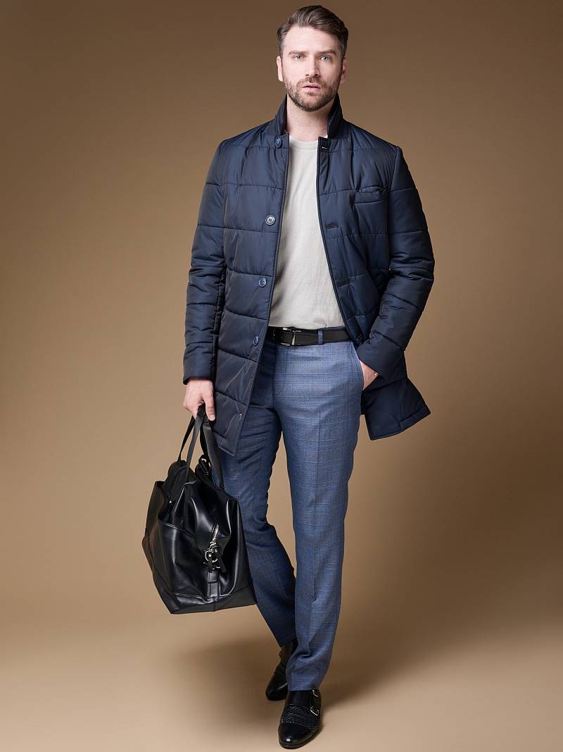 Мужская куртка - пальто утепленная с английским воротником - лацканами, из плащевой пуходержащей ткани c водоотталкивающей пропиткой, которая защищает от ветра, холода и дождя. Ткань верха плотная, практичная, не мнется. Застежка изделия на пуговицы. Полочки и спинка простеганы, на полочках - два кармана с листочками на скрытых магнитах. Спинка со шлицей. Рукава втачные с локтевыми швами. На подкладке - два внутренних кармана на молнии для удобного хранения документов. Утеплитель в изделии характеризуется легким весом, гигиеничностью и гипоаллергенностью, высокими теплоизоляционными качествами, экологичностью и безопасностью. Эластичный материал позволяет комфортно двигаться. Он отталкивает воду и не промокает, сохраняет тепло. Изделие подходит для ежедневного пользования. Длина по спинке - 90см. Ткань верха: 100%полиэстер. Подкладка: 100%полиэстер. Утеплитель: термоплюс 150гр/150гр.