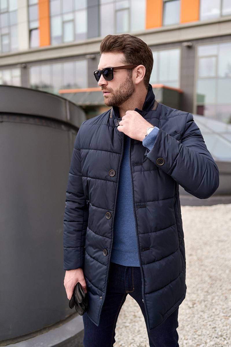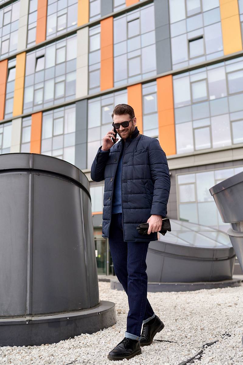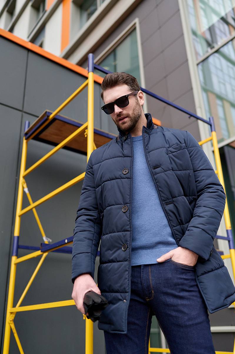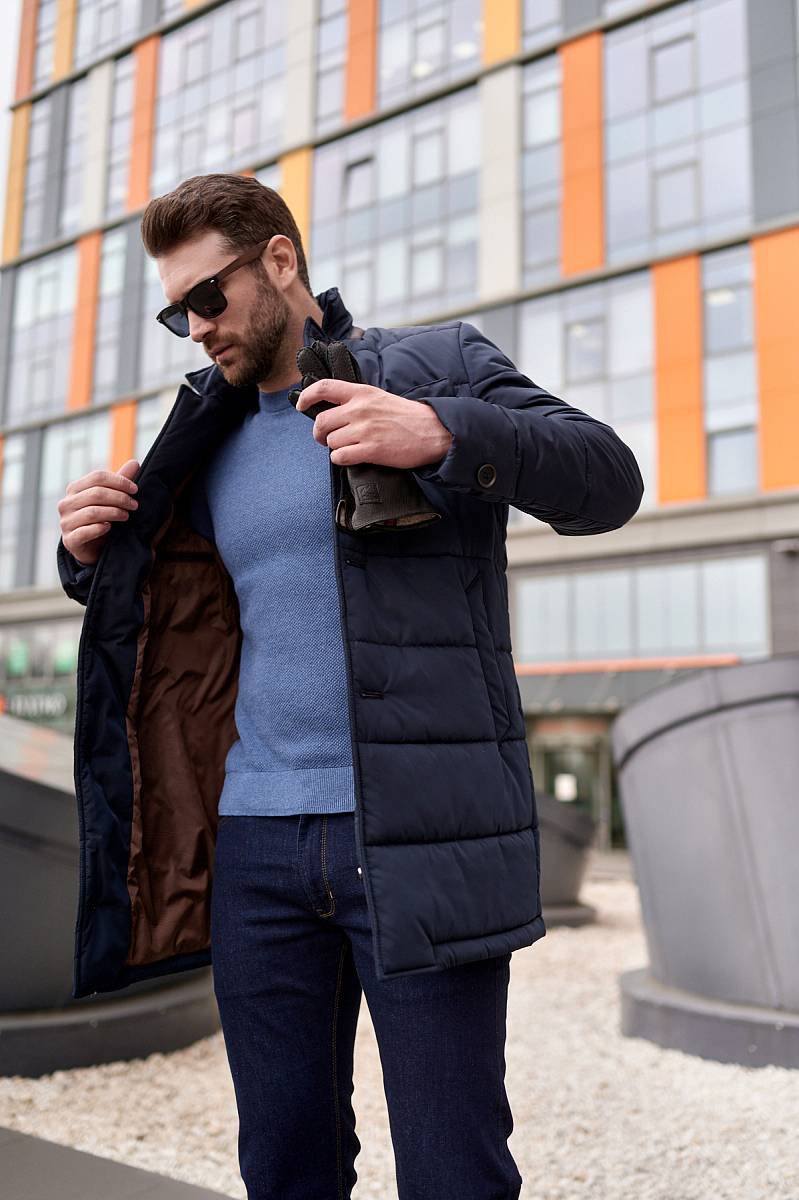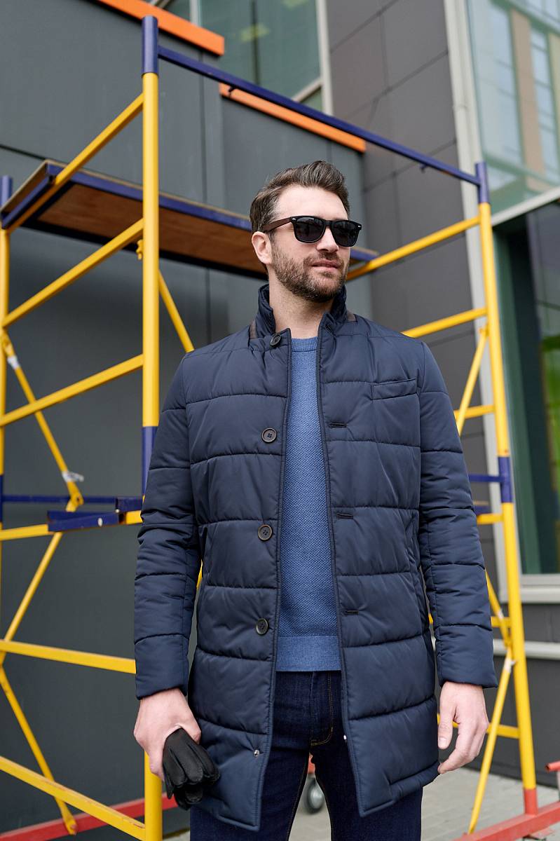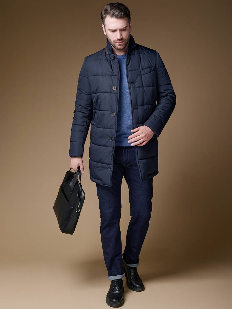Мужская куртка - пальто утепленная с английским воротником - лацканами, из плащевой пуходержащей ткани c водоотталкивающей пропиткой, которая защищает от ветра, холода и дождя. Ткань верха плотная, практичная, не мнется. Застежка изделия на пуговицы. Полочки и спинка простеганы, на полочках - два кармана с листочками на скрытых магнитах. Спинка со шлицей. Рукава втачные с локтевыми швами. На подкладке - два внутренних кармана на молнии для удобного хранения документов. Утеплитель в изделии характеризуется легким весом, гигиеничностью и гипоаллергенностью, высокими теплоизоляционными качествами, экологичностью и безопасностью. Эластичный материал позволяет комфортно двигаться. Он отталкивает воду и не промокает, сохраняет тепло. Изделие подходит для ежедневного пользования. Длина по спинке - 90см. Ткань верха: 100%полиэстер. Подкладка: 100%полиэстер. Утеплитель: термоплюс 150гр/150гр.
