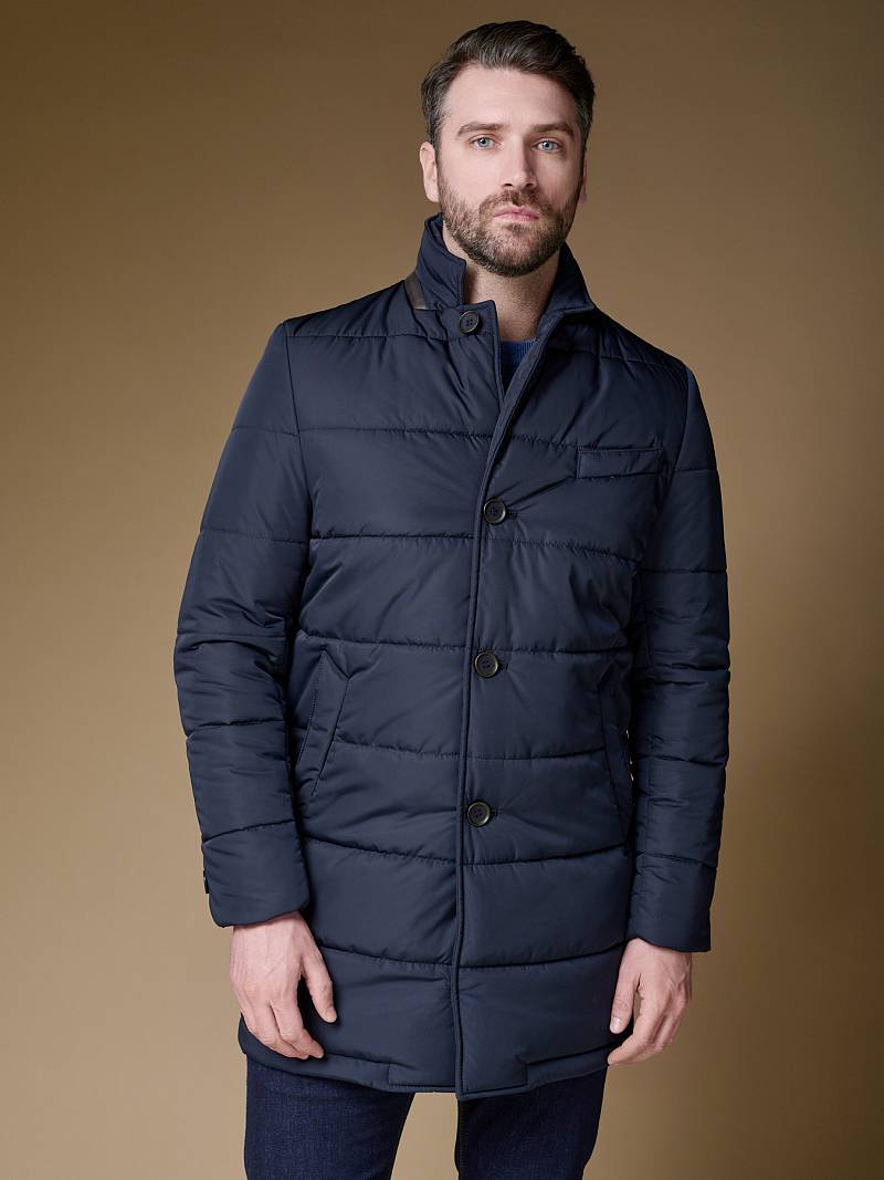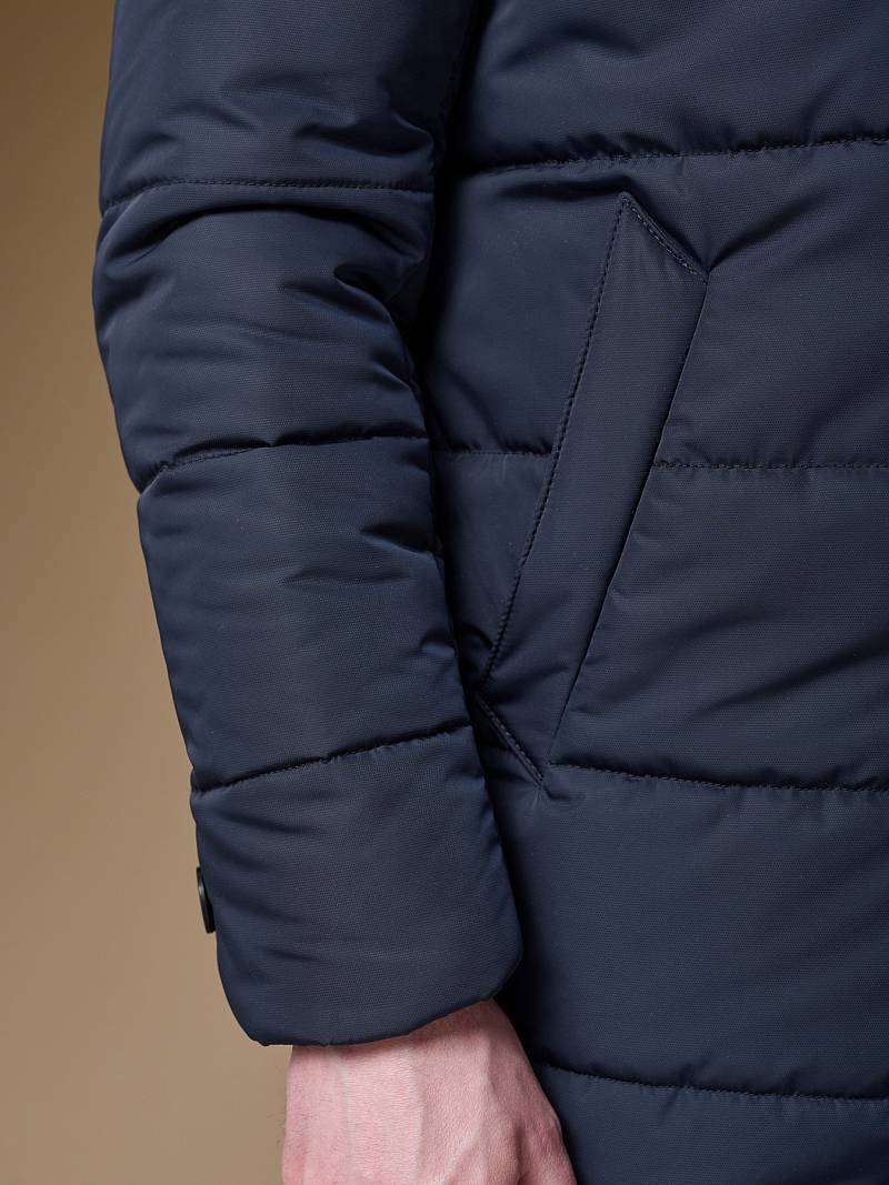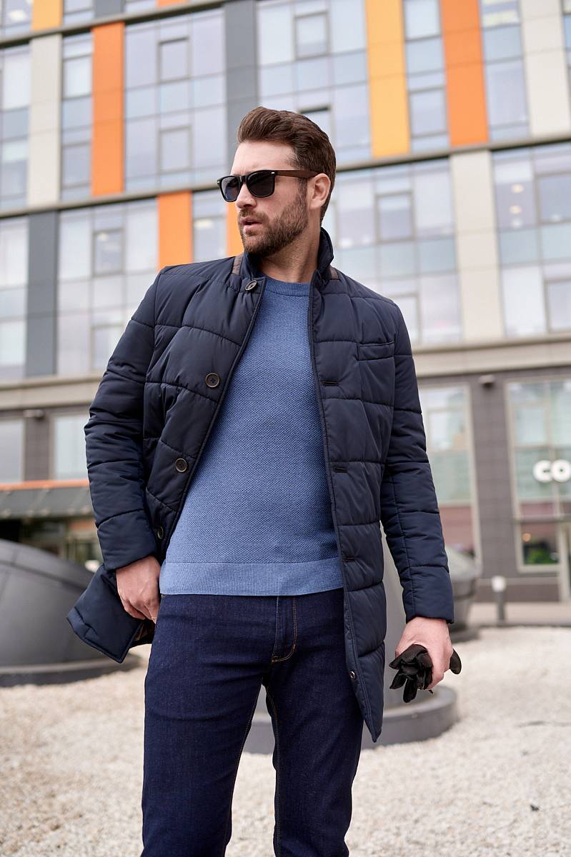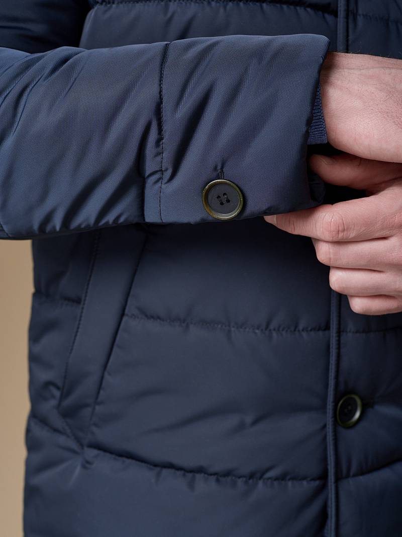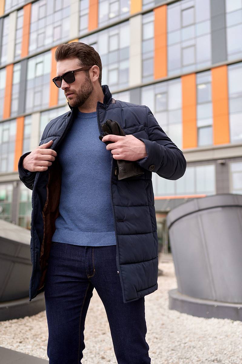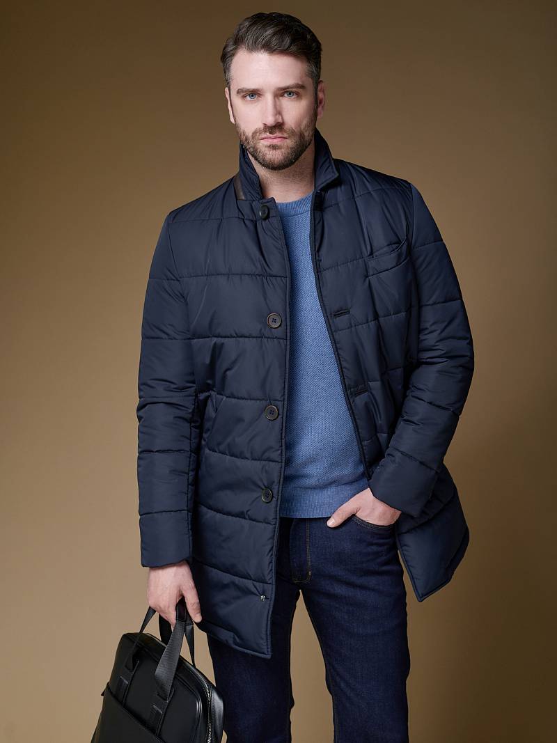 Мужская куртка - пальто утепленная с английским воротником - лацканами, из плащевой пуходержащей ткани c водоотталкивающей пропиткой, которая защищает от ветра, холода и дождя. Ткань верха плотная, практичная, не мнется. Застежка изделия на пуговицы. Полочки и спинка простеганы, на полочках - два кармана с листочками на скрытых магнитах. Спинка со шлицей. Рукава втачные с локтевыми швами. На подкладке - два внутренних кармана на молнии для удобного хранения документов. Утеплитель в изделии характеризуется легким весом, гигиеничностью и гипоаллергенностью, высокими теплоизоляционными качествами, экологичностью и безопасностью. Эластичный материал позволяет комфортно двигаться. Он отталкивает воду и не промокает, сохраняет тепло. Изделие подходит для ежедневного пользования. Длина по спинке - 90см. Ткань верха: 100%полиэстер. Подкладка: 100%полиэстер. Утеплитель: термоплюс 150гр/150гр.