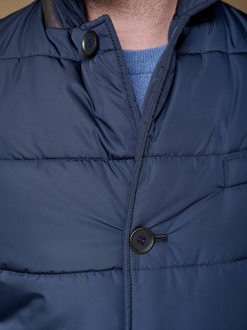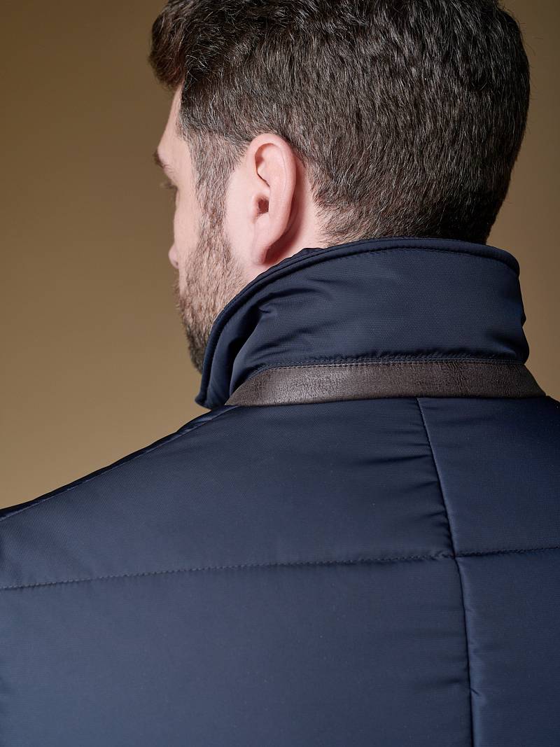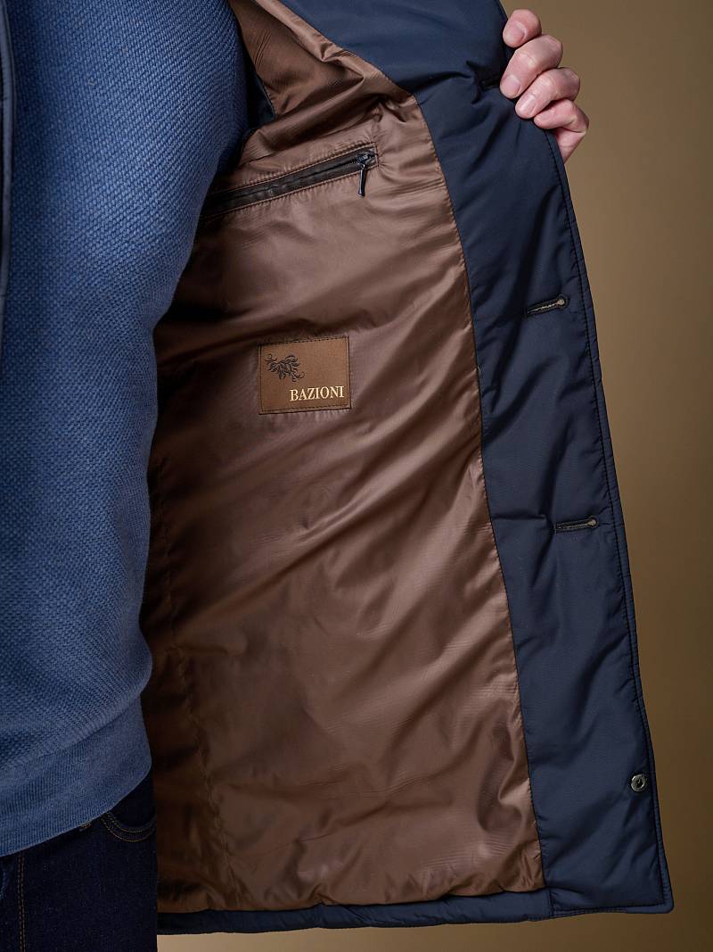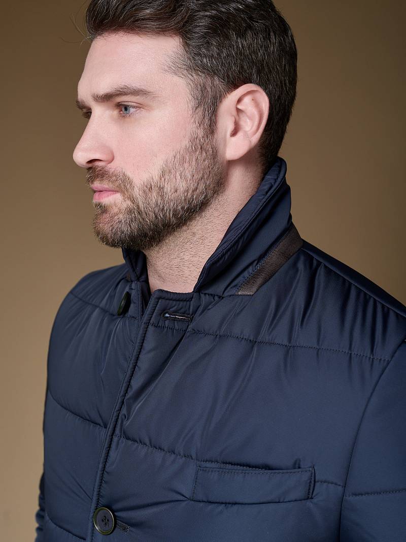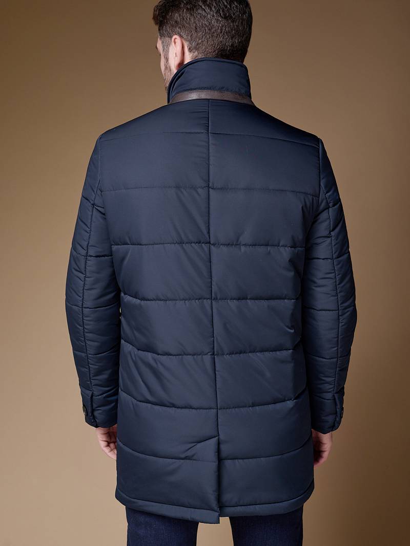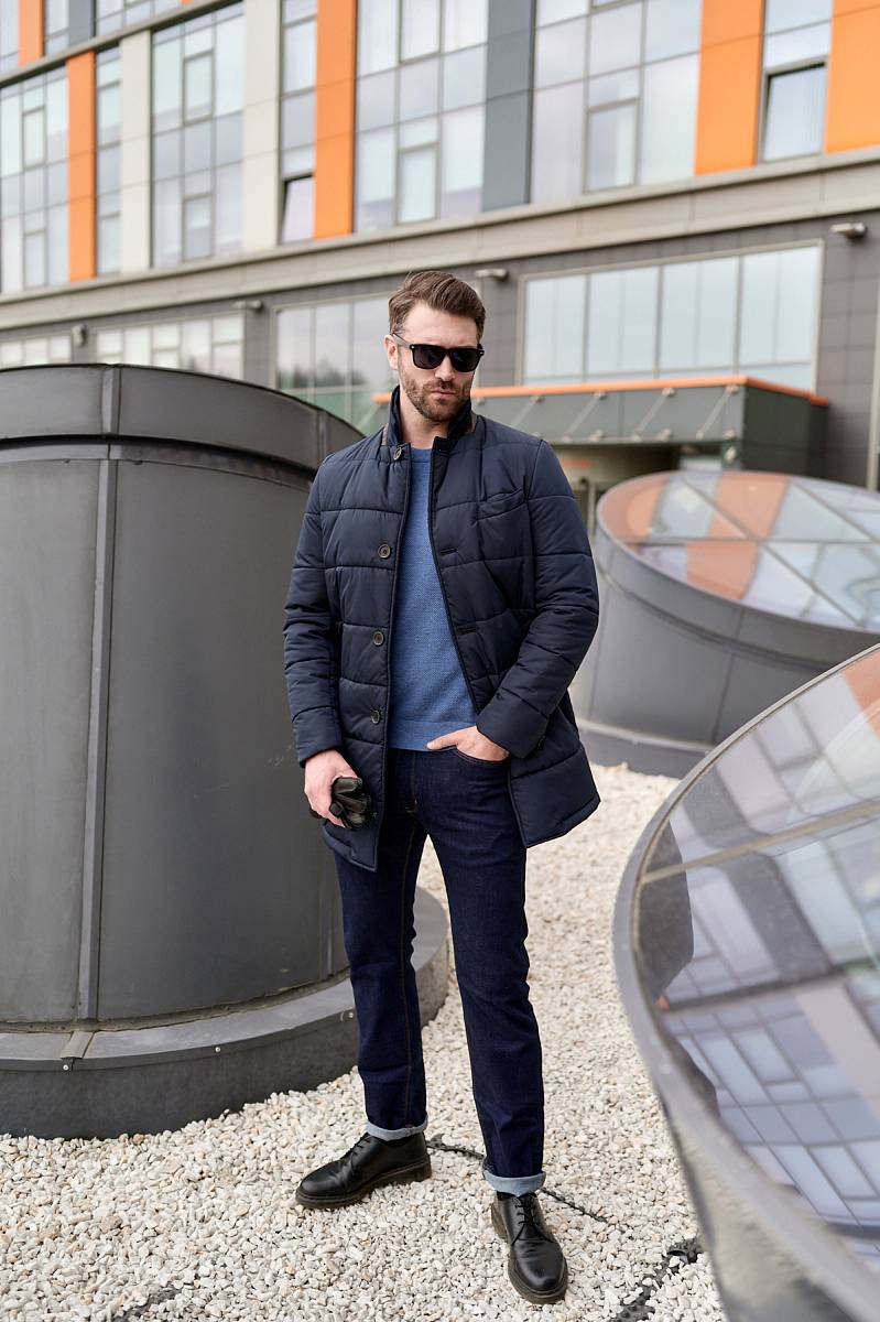 Мужская куртка - пальто утепленная с английским воротником - лацканами, из плащевой пуходержащей ткани c водоотталкивающей пропиткой, которая защищает от ветра, холода и дождя. Ткань верха плотная, практичная, не мнется. Застежка изделия на пуговицы. Полочки и спинка простеганы, на полочках - два кармана с листочками на скрытых магнитах. Спинка со шлицей. Рукава втачные с локтевыми швами. На подкладке - два внутренних кармана на молнии для удобного хранения документов. Утеплитель в изделии характеризуется легким весом, гигиеничностью и гипоаллергенностью, высокими теплоизоляционными качествами, экологичностью и безопасностью. Эластичный материал позволяет комфортно двигаться. Он отталкивает воду и не промокает, сохраняет тепло. Изделие подходит для ежедневного пользования. Длина по спинке - 90см. Ткань верха: 100%полиэстер. Подкладка: 100%полиэстер. Утеплитель: термоплюс 150гр/150гр.
