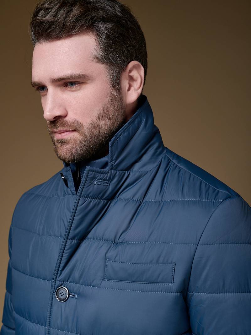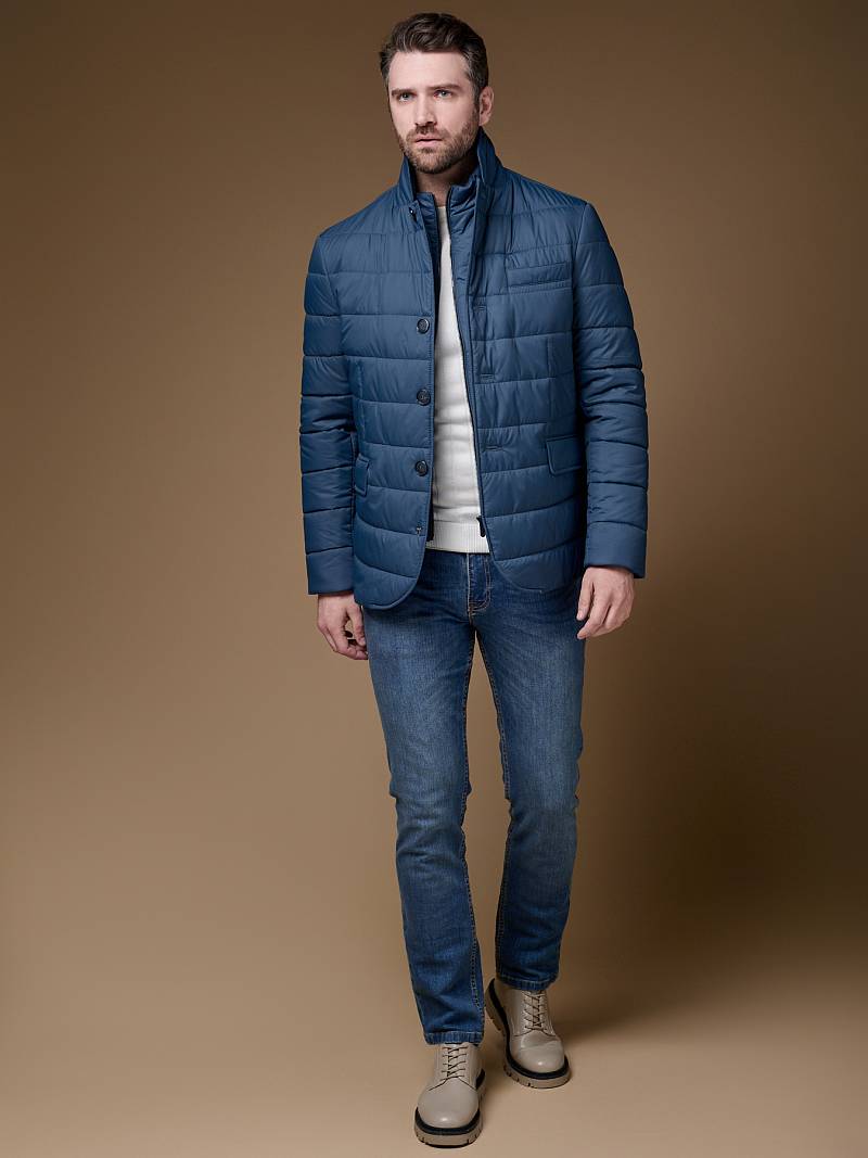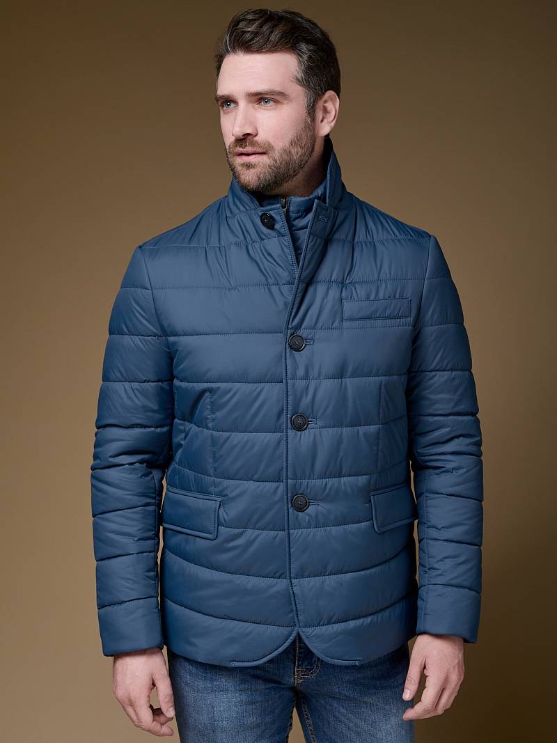 Куртка мужская утепленная с английским воротником и со съемной манишкой из курточной пуходержащей ткани c водоотталкивающей пропиткой. Ткань верха легкая, практичная, не мнется. Манишка защищает от ветра, холода и дождя. Застежка изделия на пуговицы. Полочки и спинка простеганы, на полочках - два кармана с клапанами на скрытых магнитах. Рукава втачные с локтевыми швами. На подкладке - два внутренних кармана на молнии для удобного хранения документов. Утеплитель в изделии характеризуется легким весом, гигиеничностью и гипоаллергенностью, высокими теплоизоляционными качествами, экологичностью и безопасностью. Он отталкивает воду и не промокает, сохраняет тепло. Изделие подходит для ежедневного пользования. Длина по спинке - 74см. Ткань верха: 100%полиэстер. Подкладка: 100%полиэстер. Утеплитель: термоплюс 150гр/150гр.