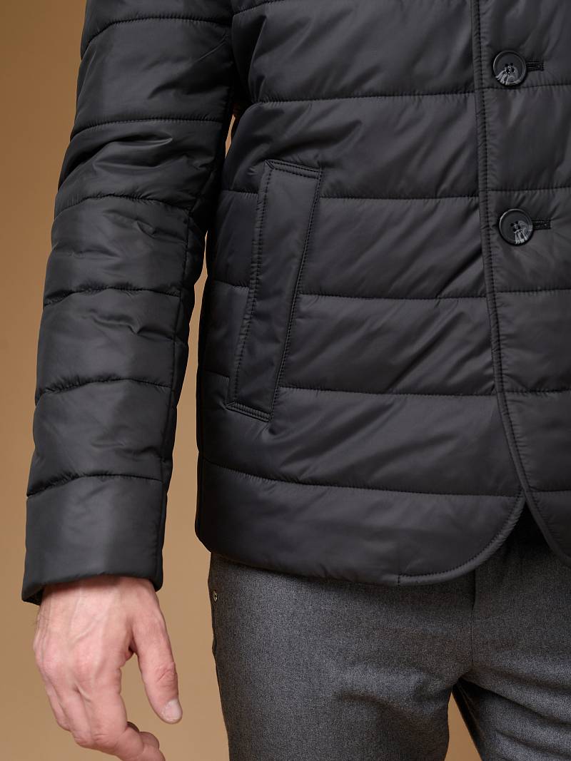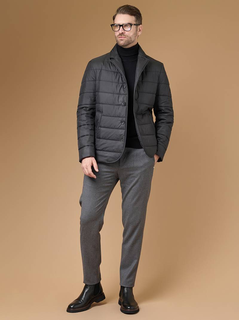 Куртка-пиджак мужская простеганая из курточной ткани. Инновационная пуходержащая ткань верха с обработкой wr, cire (ветро и влаго защита). - мягкая, легкая, практичная, не мнется. Изделие с отложным воротником пиджачного типа с лацканами. Застежка куртки -пиджака на пуговицы. На полочках - прорезные боковые карманы с листочками на скрытых магнитах. Спинка без среднего шва. Рукава с локтевыми швами. Инновационная внутренняя подкладка с защитой от миграции волокон, на подкладке - два вместительных кармана для документов. Утеплитель антиаллергенный термоплюс 150гр /150гр. не теряет своих свойств после химчистки и стирки. Длина по спинке для размера 50/176 - 90см. Ткань верха: 100%по