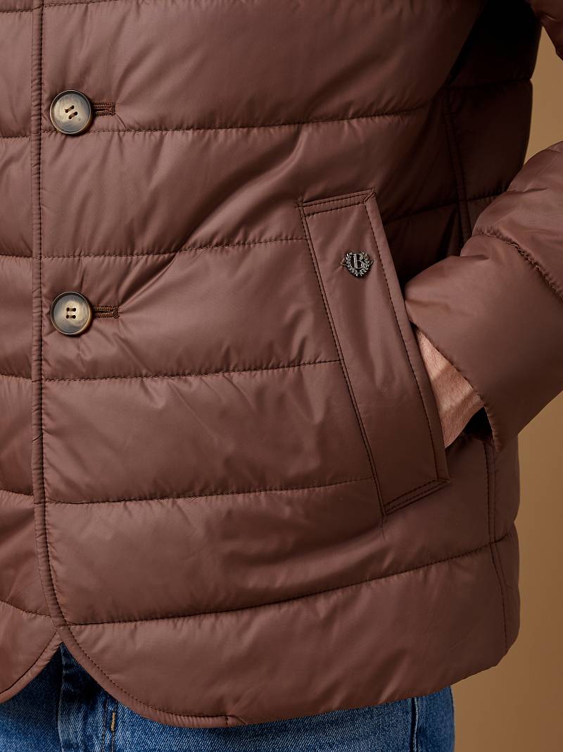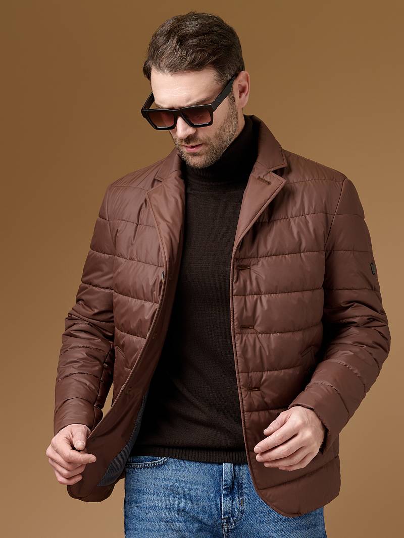 Куртка-пиджак мужская простеганая из курточной ткани. Инновационная пуходержащая ткань верха с обработкой wr, cire (ветро и влаго защита). - мягкая, легкая, практичная, не мнется. Изделие с отложным воротником пиджачного типа с лацканами. Застежка куртки -пиджака на пуговицы. На полочках - прорезные боковые карманы с листочками на скрытых магнитах. Спинка без среднего шва. Рукава с локтевыми швами. Инновационная внутренняя подкладка с защитой от миграции волокон, на подкладке - два вместительных кармана для документов. Утеплитель антиаллергенный термоплюс 150гр /150гр. не теряет своих свойств после химчистки и стирки. Длина по спинке для размера 50/176 - 90см. Ткань верха: 100%по