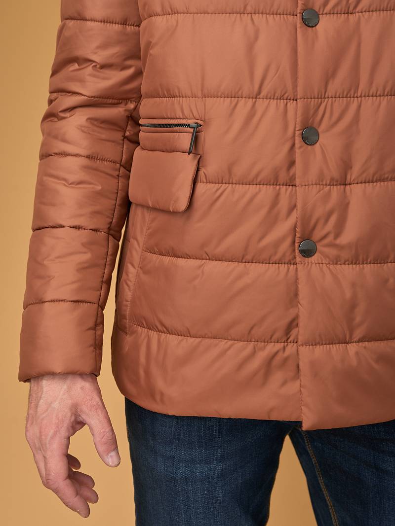 Куртка мужская простеганая из курточной ткани. Инновационная пуходержащая ткань верха с обработкой wr, cire (ветро и влаго защита). - мягкая, легкая, практичная, не мнется. Застежка на молнию и пуговицы. На полочках пять карманов - два прорезные боковые карманы с клапанами на скрытых магнитах, верхний один карман на молнии, и два нижних наклонных кармана с боковым входом. Спинка без среднего шва. Рукава с локтевыми швами. Внутренняя подкладка с защитой от миграции волокон, на подкладке - два вместительных кармана для документов. Утеплитель антиаллергенный термоплюс 150гр /150гр