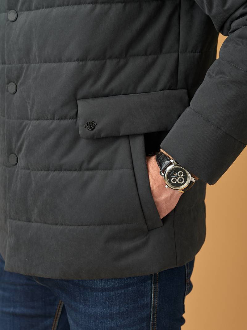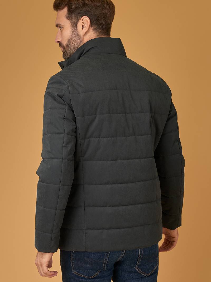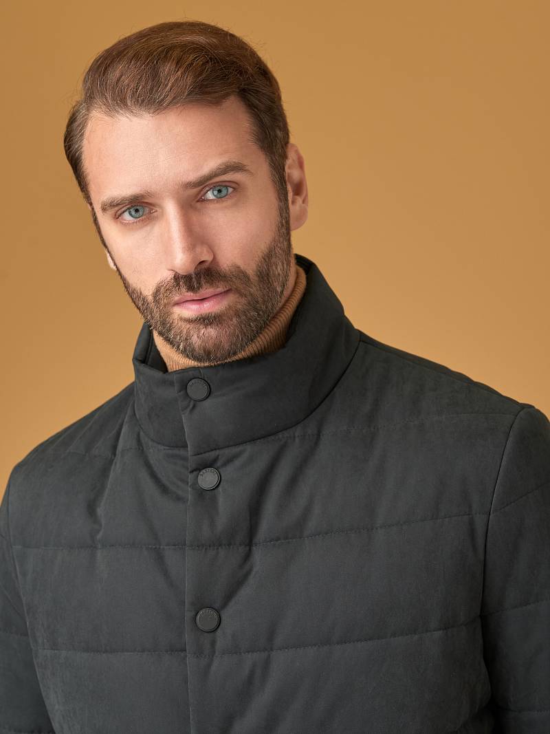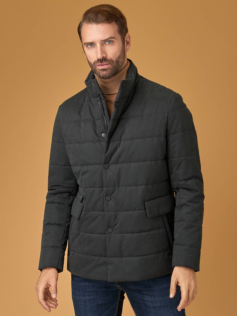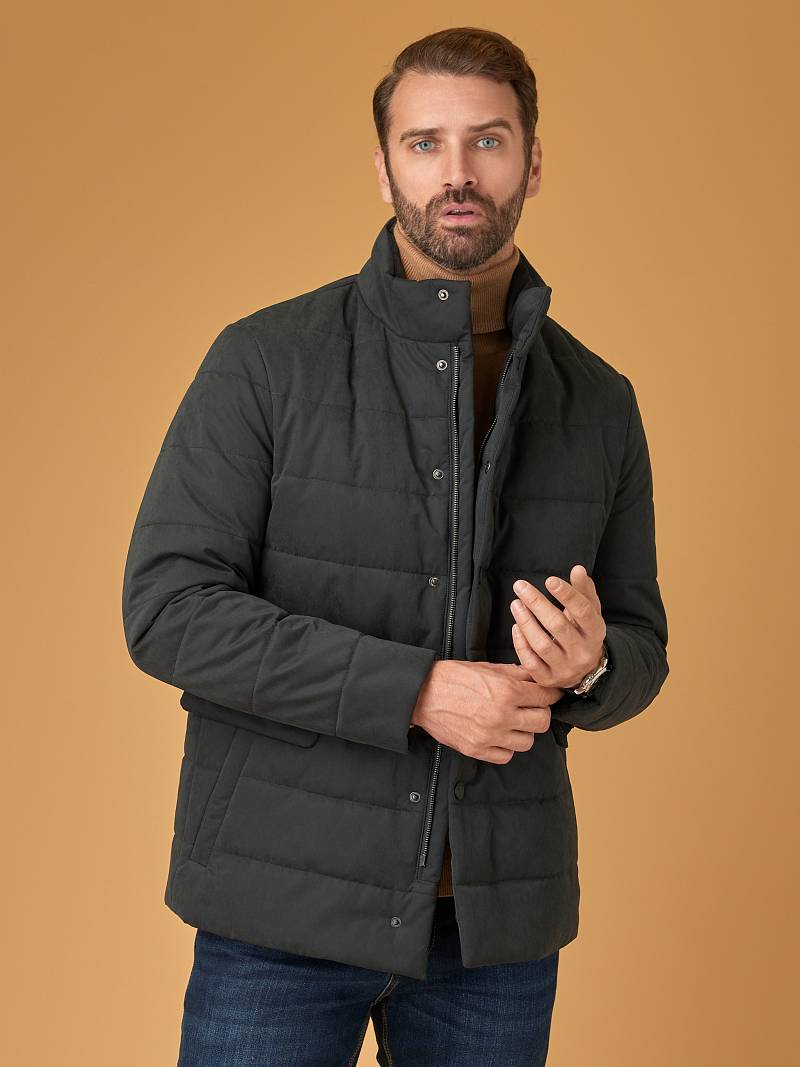 Куртка мужская простеганая из курточной ткани. Инновационная пуходержащая ткань верха с обработкой wr, cire (ветро и влаго защита). - мягкая, легкая, практичная, не мнется. Застежка на молнию и пуговицы. На полочках пять карманов - два прорезные боковые карманы с клапанами на скрытых магнитах, верхний один карман на молнии, и два нижних наклонных кармана с боковым входом. Спинка без среднего шва. Рукава с локтевыми швами. Внутренняя подкладка с защитой от миграции волокон, на подкладке - два вместительных кармана для документов. Утеплитель антиаллергенный термоплюс 150гр /150гр