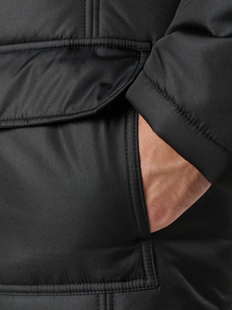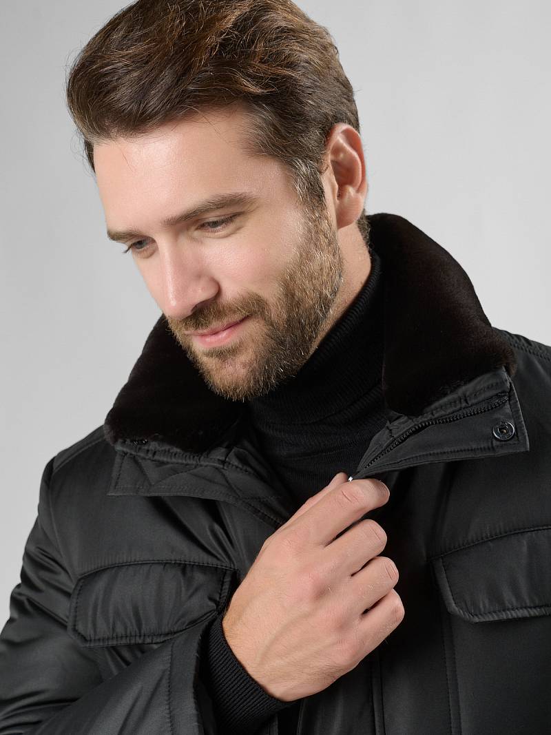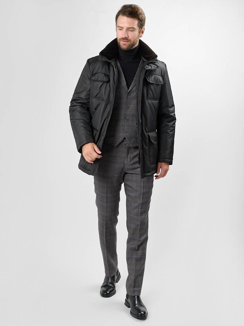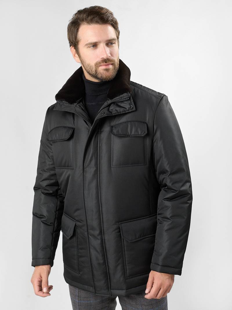 Куртка мужская утепленная с отстегивающимся меховым воротником-стойка, застежка на молнию и 5 потайных кнопок. На полочке - два верхних кармана с клапанами- имитирующих накладные и два нижних накладных кармана с клапанами. Спинка со средним швом. Рукава втачные с локтевыми швами. Длина по спинке-80см. Ткань верха: 100%полиэстер. Подкладка: 100%полиэстер. Утеплитель: термоплюс 260гр/200гр. Воротник: мех.