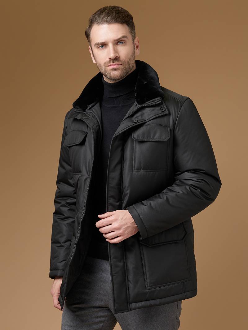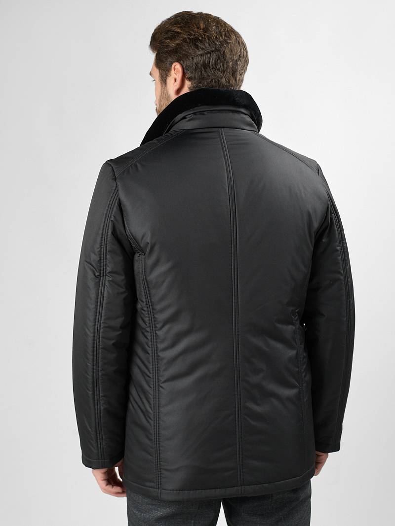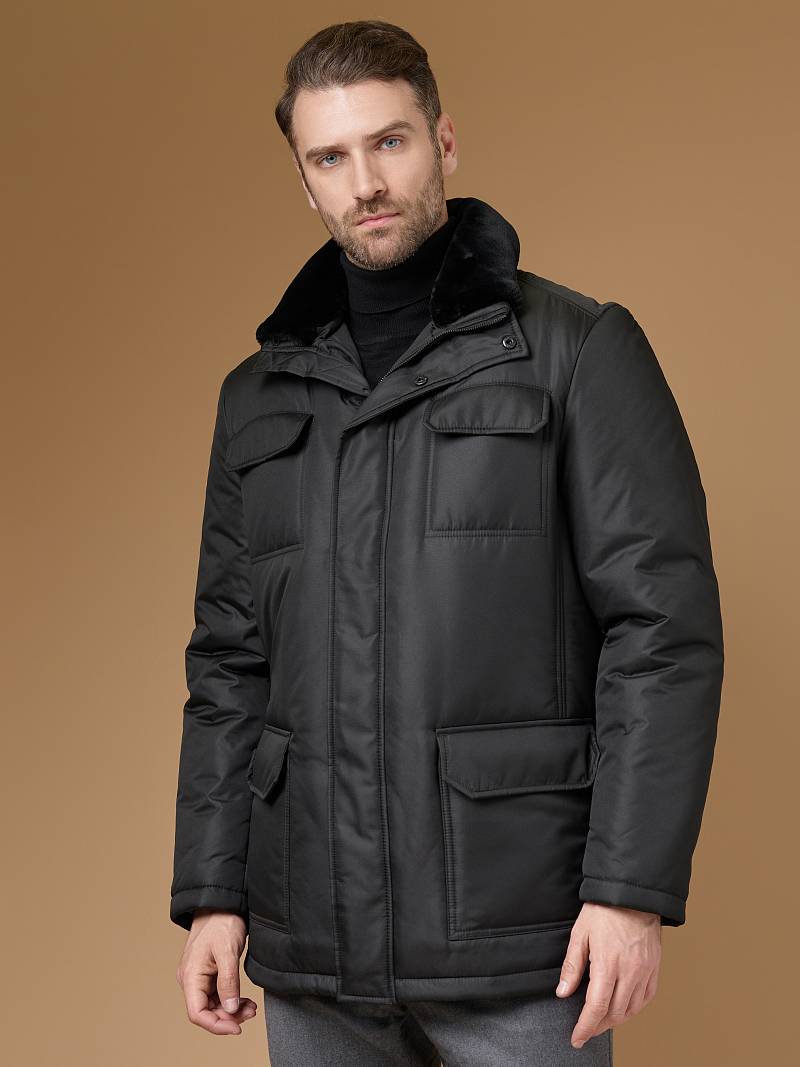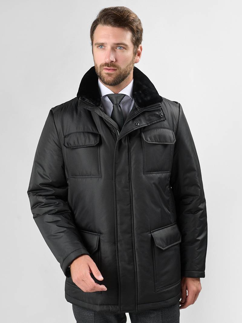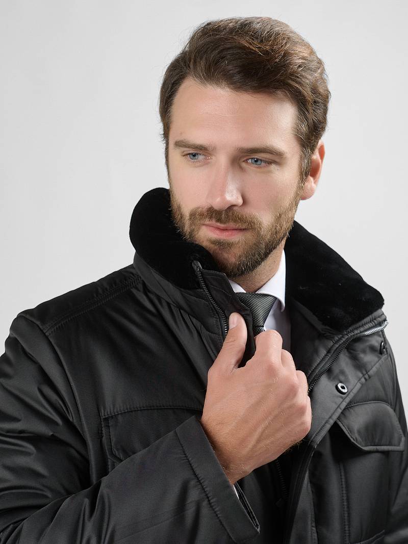 Куртка мужская утепленная с отстегивающимся меховым воротником-стойка, застежка на молнию и 5 потайных кнопок. На полочке - два верхних кармана с клапанами- имитирующих накладные и два нижних накладных кармана с клапанами. Спинка со средним швом. Рукава втачные с локтевыми швами. Длина по спинке-80см. Ткань верха: 100%полиэстер. Подкладка: 100%полиэстер. Утеплитель: термоплюс 260гр/200гр. Воротник: мех.