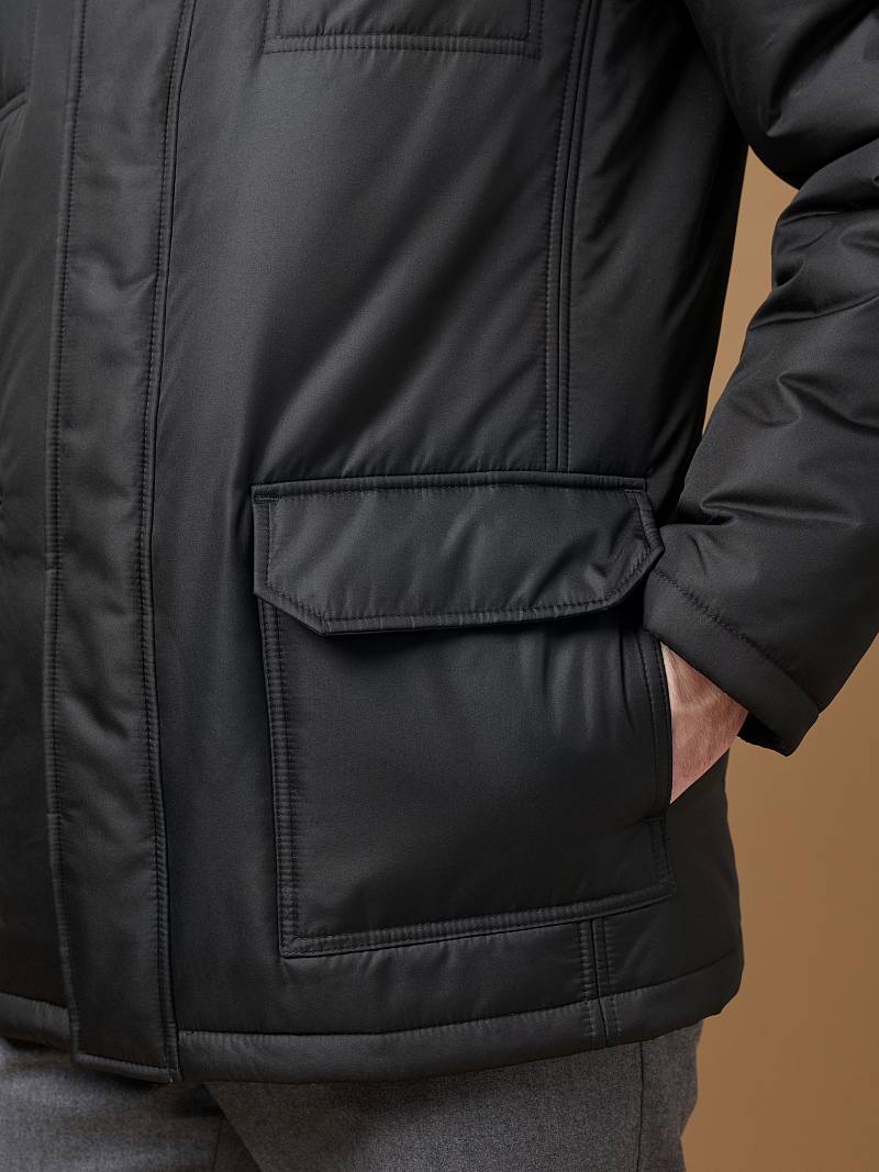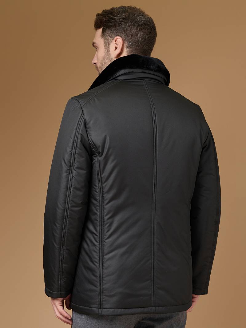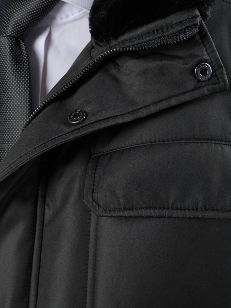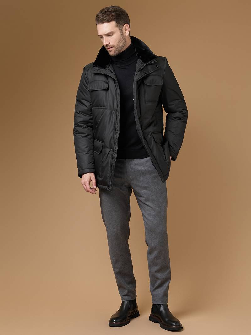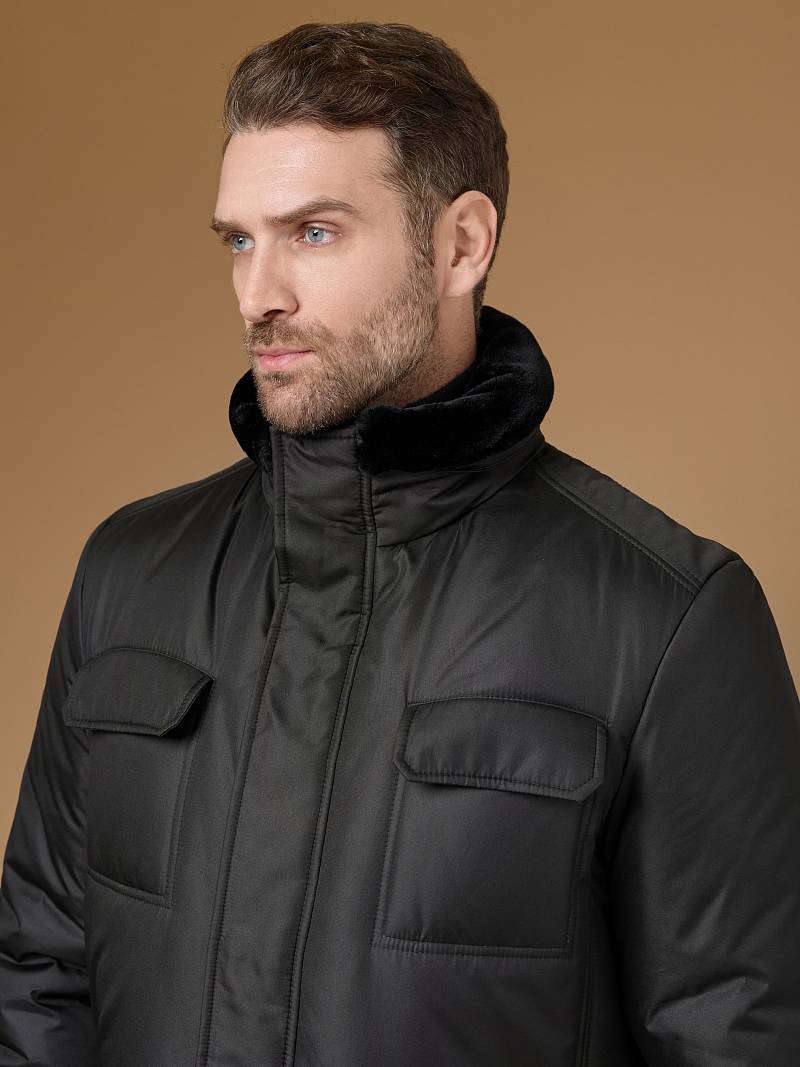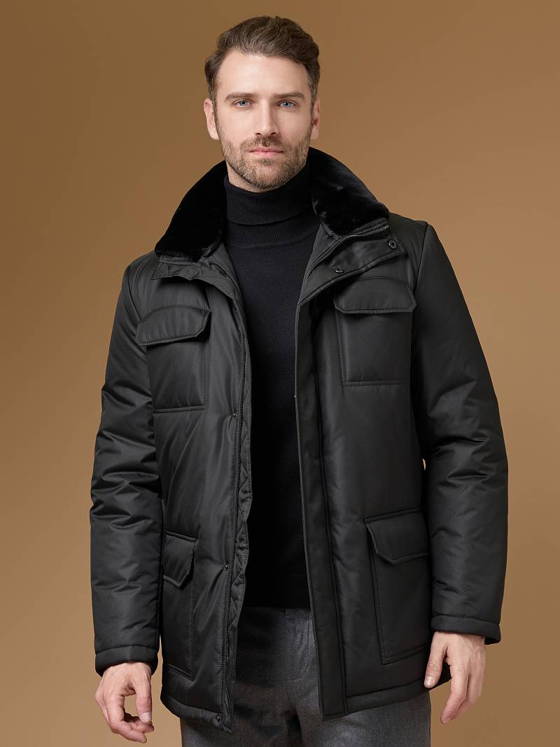 Куртка мужская утепленная с отстегивающимся меховым воротником-стойка, застежка на молнию и 5 потайных кнопок. На полочке - два верхних кармана с клапанами- имитирующих накладные и два нижних накладных кармана с клапанами. Спинка со средним швом. Рукава втачные с локтевыми швами. Длина по спинке-80см. Ткань верха: 100%полиэстер. Подкладка: 100%полиэстер. Утеплитель: термоплюс 260гр/200гр. Воротник: мех.