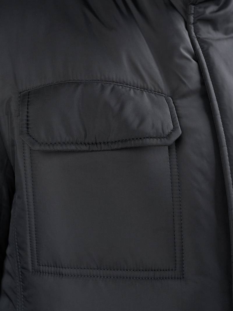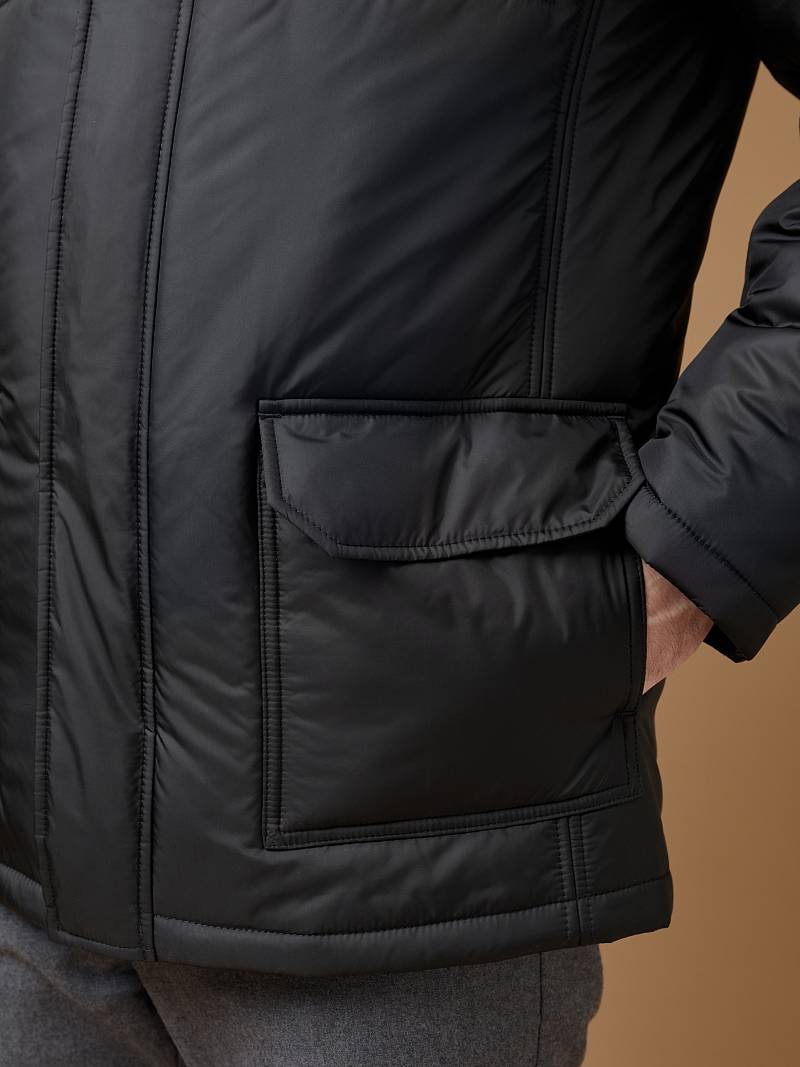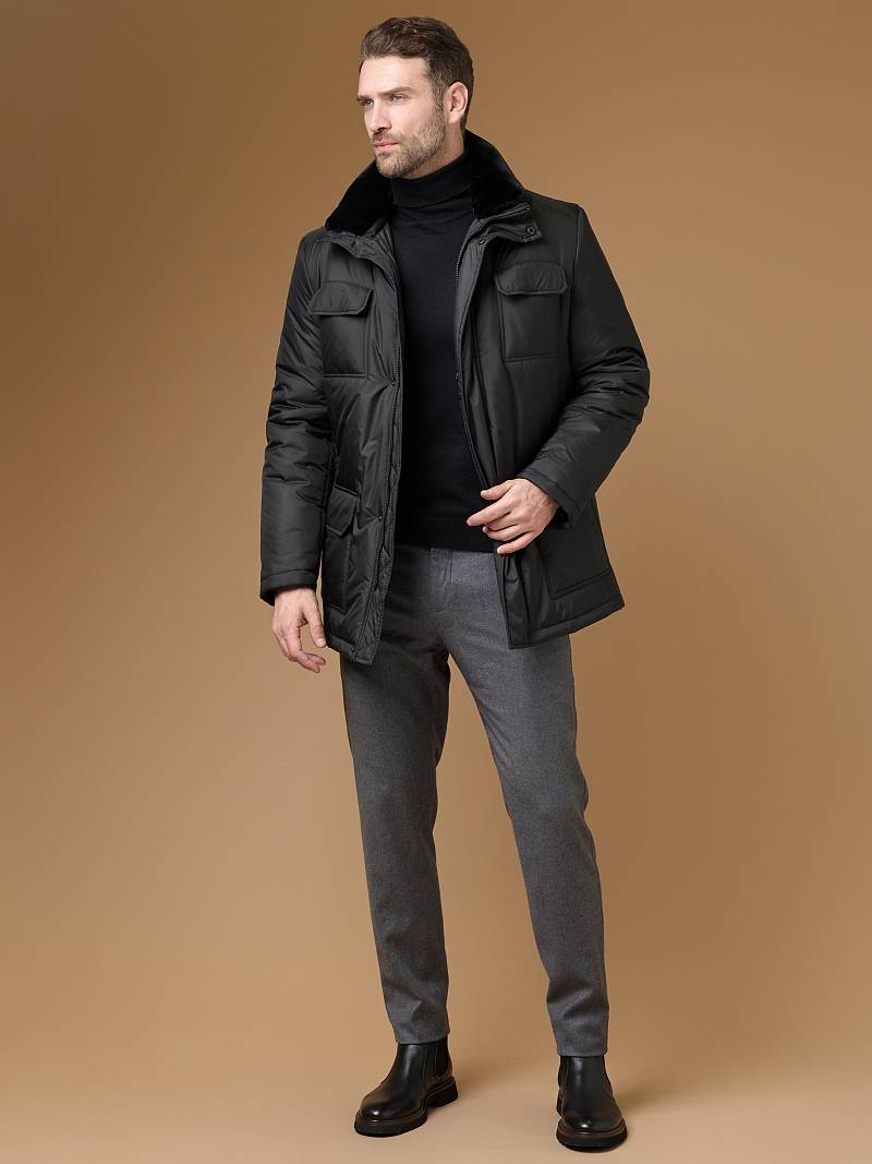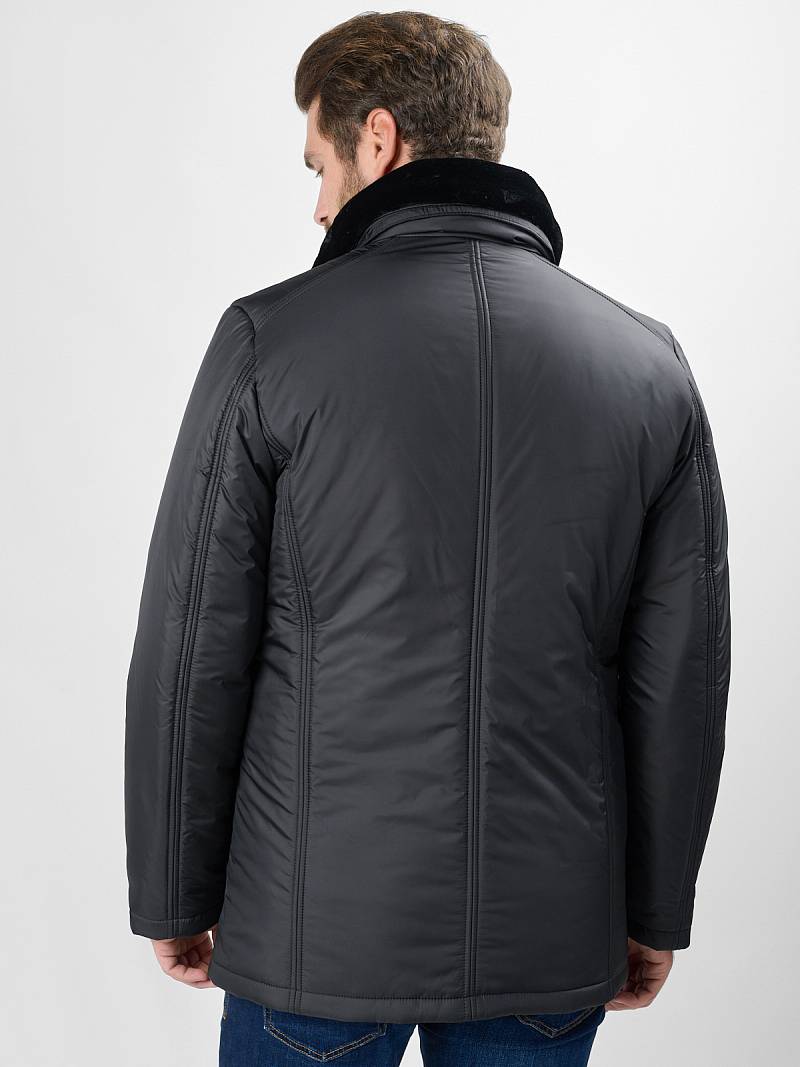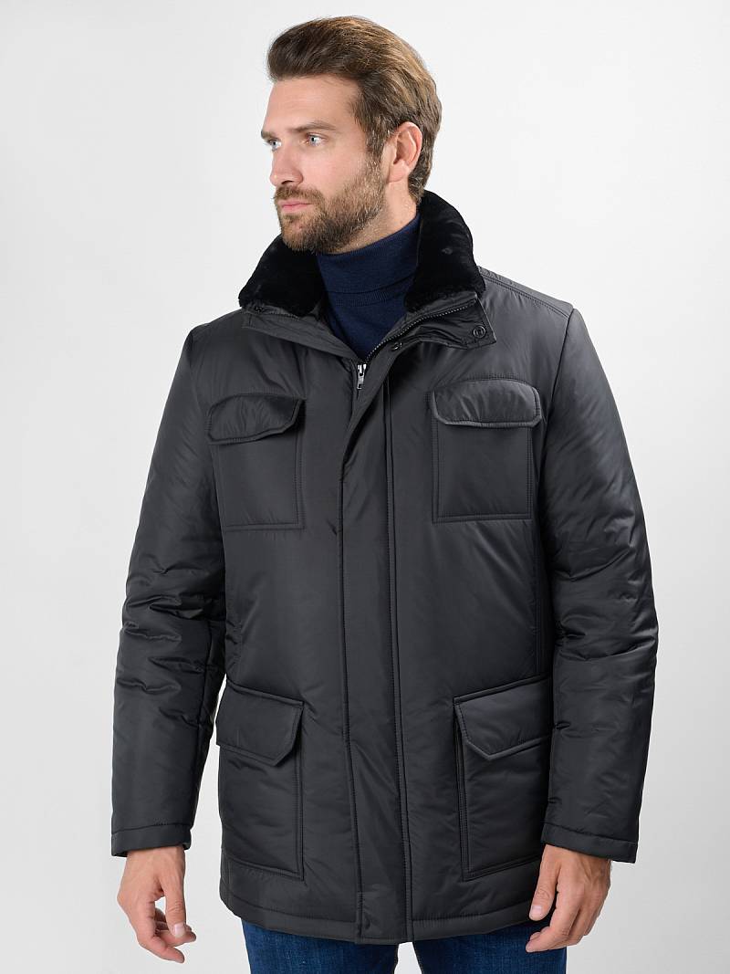 Куртка мужская утепленная с отстегивающимся меховым воротником-стойка, застежка на молнию и 5 потайных кнопок. На полочке - два верхних кармана с клапанами- имитирующих накладные и два нижних накладных кармана с клапанами. Спинка со средним швом. Рукава втачные с локтевыми швами. Длина по спинке-80см. Ткань верха: 100%полиэстер. Подкладка: 100%полиэстер. Утеплитель: термоплюс 260гр/200гр. Воротник: мех.