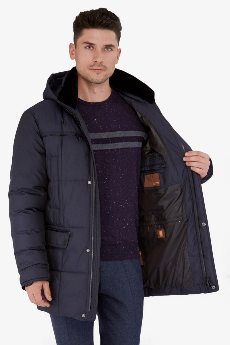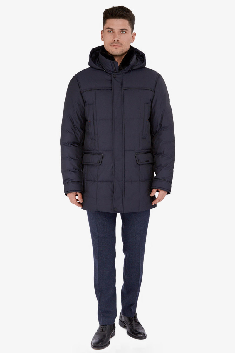 Куртка мужская утепленная с капюшоном из плащевой ткани, со съемным натуральным меховым воротником из мутона, воротник - стойка. с центральной застежкой на молнию и ветрозащитную планку на 4 кнопки. Простеганные полочки и спинка- с кокетками и бочками. На полочках - верхние карманы с листочками на молниях и два нижних боковых кармана: 1- с клапаном, 2-ой - с листочкой. Спинка -в нижней части срежнего шва спинки- шлица на 2-х кнопках. По талии спинки-притачная кулиса. Рукава втачные с локтевыми швами. По швам притачивания кокеток, краю листочек, клапанов, по низу рукавов, по кулисе на спинке - объемный отделочный кант. На подкладке - два внутренних кармана с листочками. Длина по спинке для размера 50/176 - 80см Ткань верха: 100% полиэстер. Подкладка: 100% полиэстер. Утеплитель: Био-пух 100% (250гр). Воротник-мех натуральный "мутон"