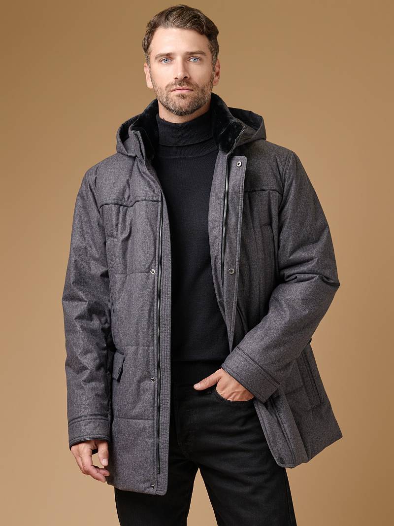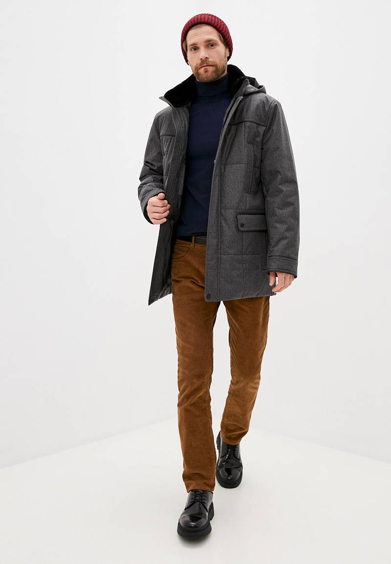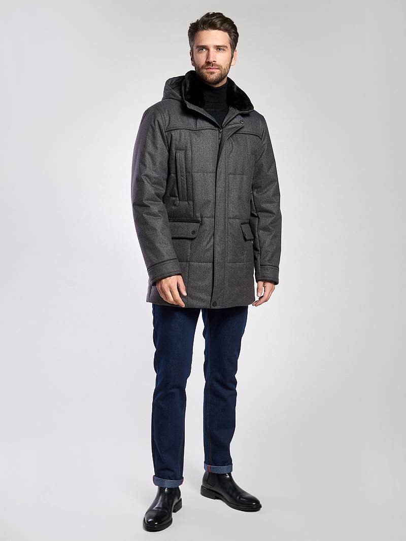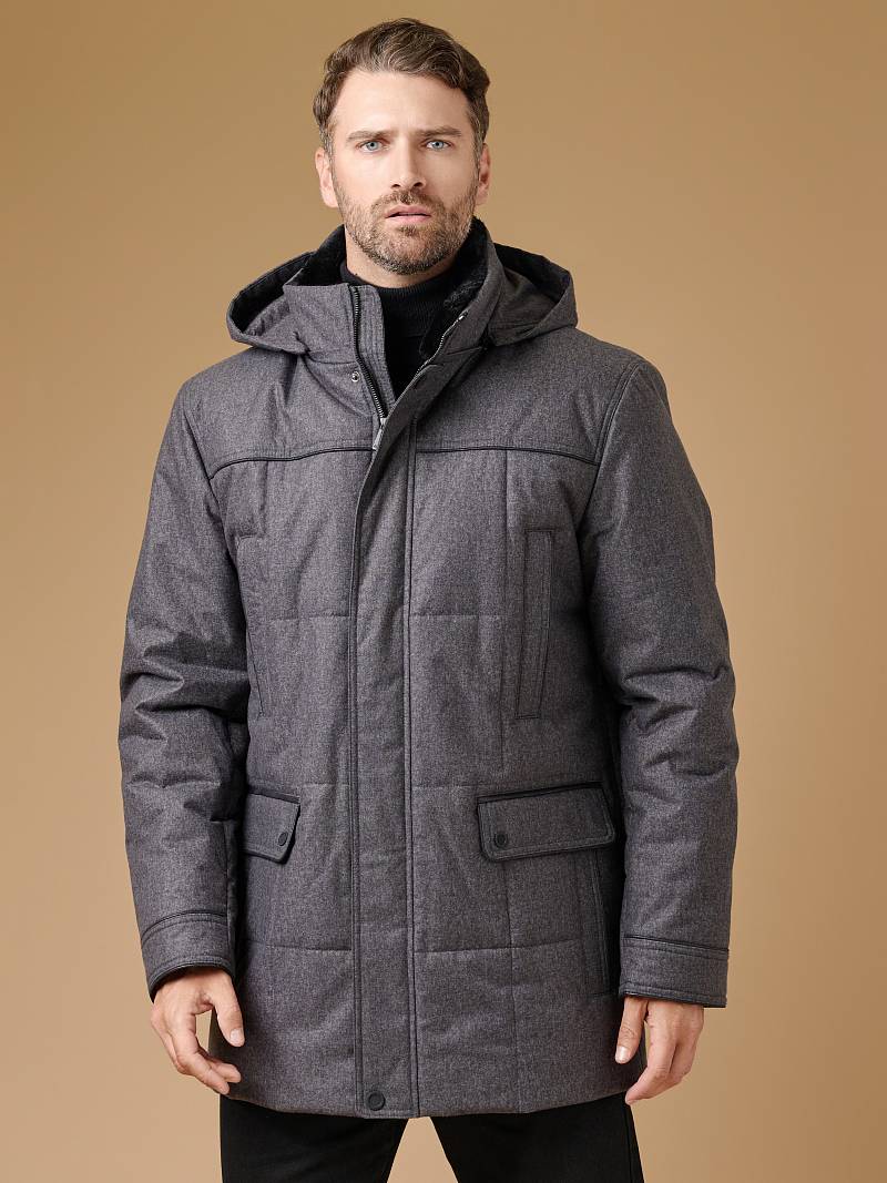 Куртка мужская утепленная с капюшоном из плащевой ткани с центральной застежкой на молнию и ветрозащитную планку на 4 кнопки. Воротник - стойка, также есть меховой пристегивающийся воротник. Простеганные полочки и спинка- с кокетками и бочками. На полочках - верхние карманы с листочками на молниях и два нижних боковых кармана: 1- с клапаном, 2-ой - с листочкой. В нижней части средlнего шва спинки- шлица на 2-х кнопках. По талии спинки-притачная кулиса, регулирующая кнопками. Рукава втачные с локтевыми швами. По швам притачивания кокеток, краю листочек, клапанов, по низу рукавов, по кулисе на спинке - объемный отделочный кант. На подкладке - два внутренних кармана с листочками. Длина по спинке-80см. Ткань верха: 60%шерсть, 40%полиэстер. Подкладка: 100%полиэстер. Утеплитель: термоплюс 200гр/200гр.. Воротник: мех