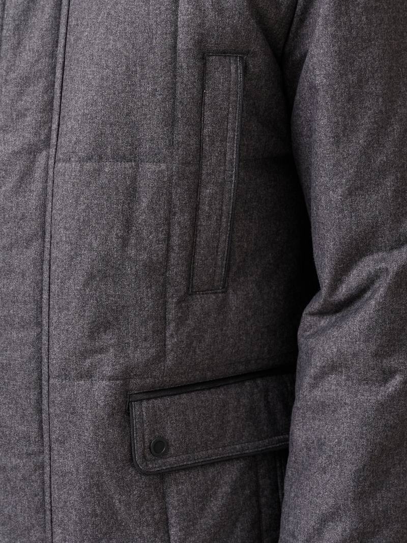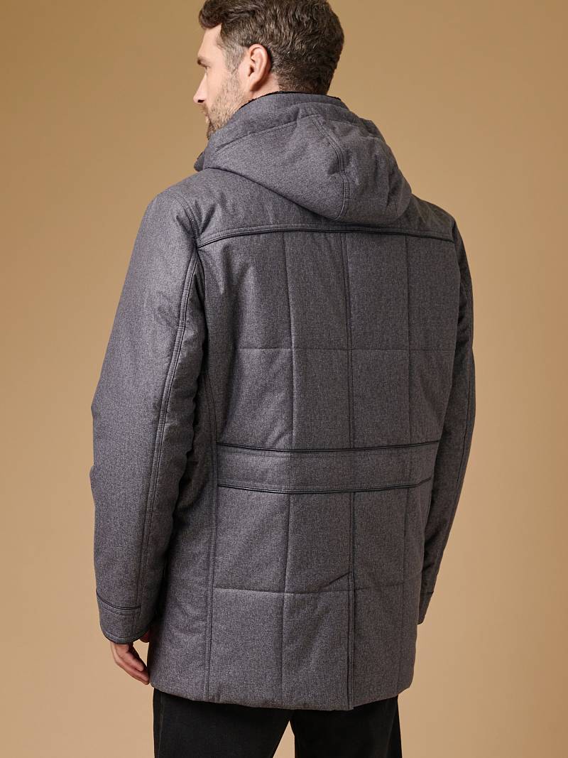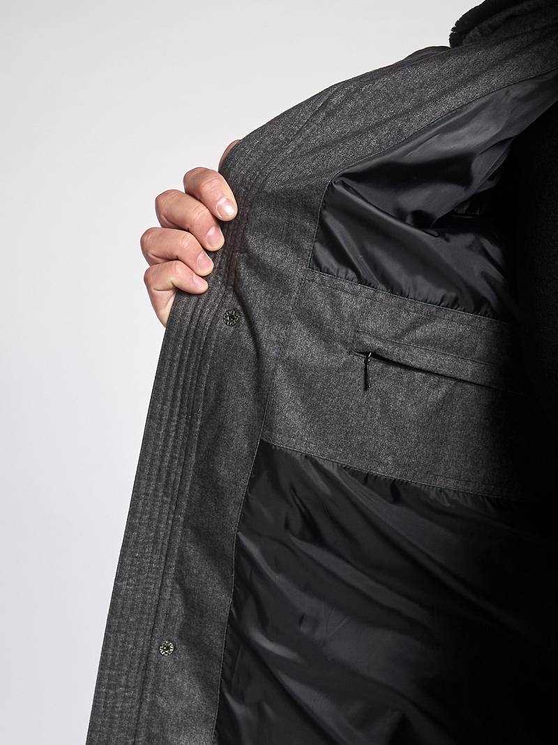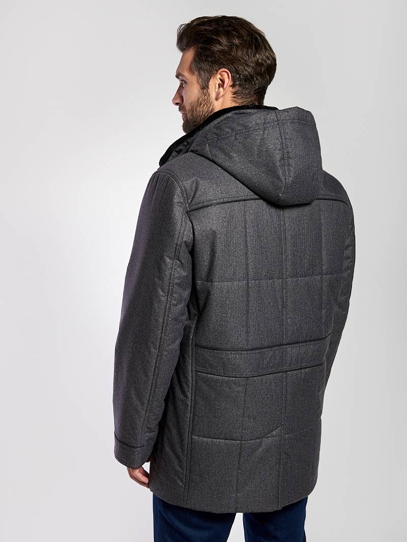 Куртка мужская утепленная с капюшоном из плащевой ткани с центральной застежкой на молнию и ветрозащитную планку на 4 кнопки. Воротник - стойка, также есть меховой пристегивающийся воротник. Простеганные полочки и спинка- с кокетками и бочками. На полочках - верхние карманы с листочками на молниях и два нижних боковых кармана: 1- с клапаном, 2-ой - с листочкой. В нижней части средlнего шва спинки- шлица на 2-х кнопках. По талии спинки-притачная кулиса, регулирующая кнопками. Рукава втачные с локтевыми швами. По швам притачивания кокеток, краю листочек, клапанов, по низу рукавов, по кулисе на спинке - объемный отделочный кант. На подкладке - два внутренних кармана с листочками. Длина по спинке-80см. Ткань верха: 60%шерсть, 40%полиэстер. Подкладка: 100%полиэстер. Утеплитель: термоплюс 200гр/200гр.. Воротник: мех