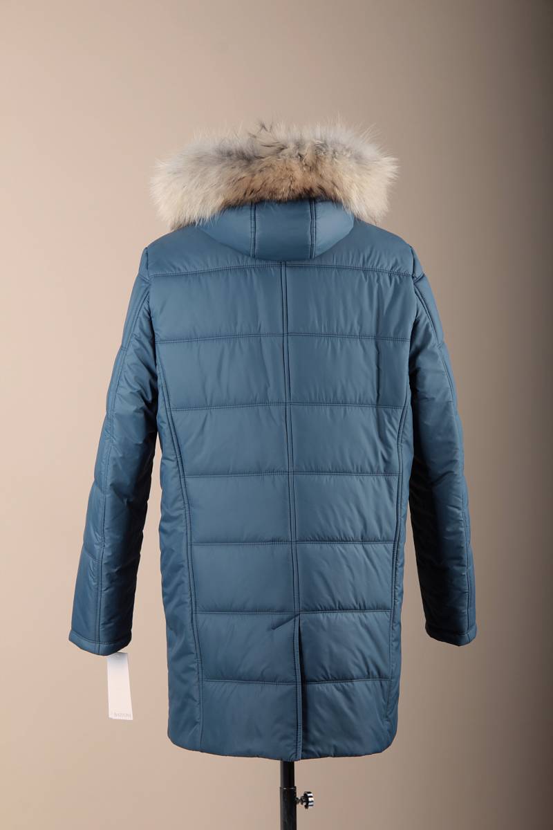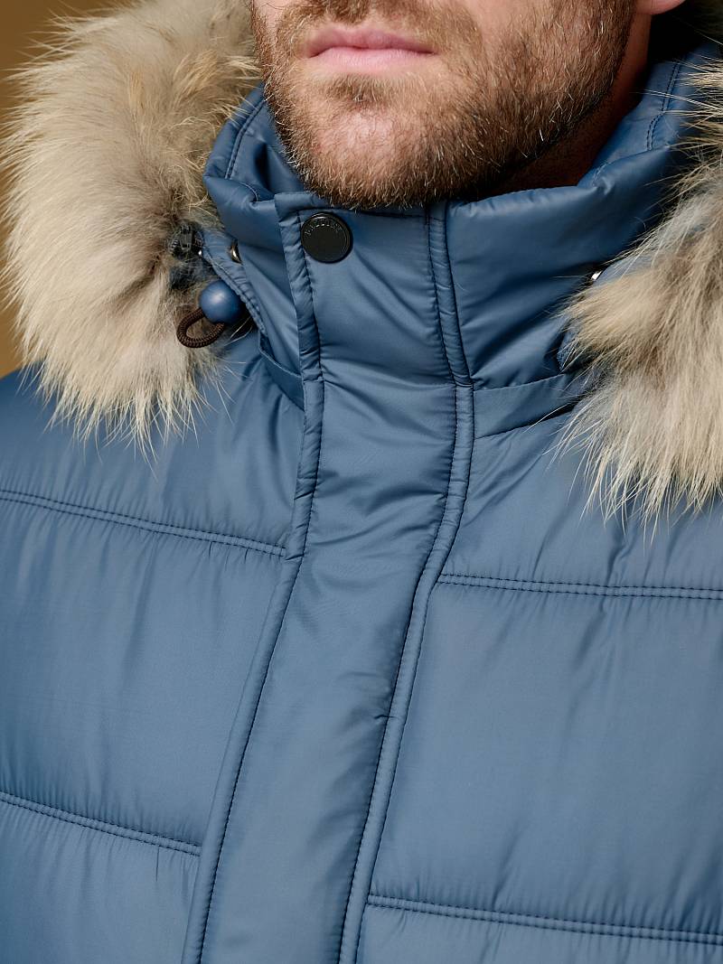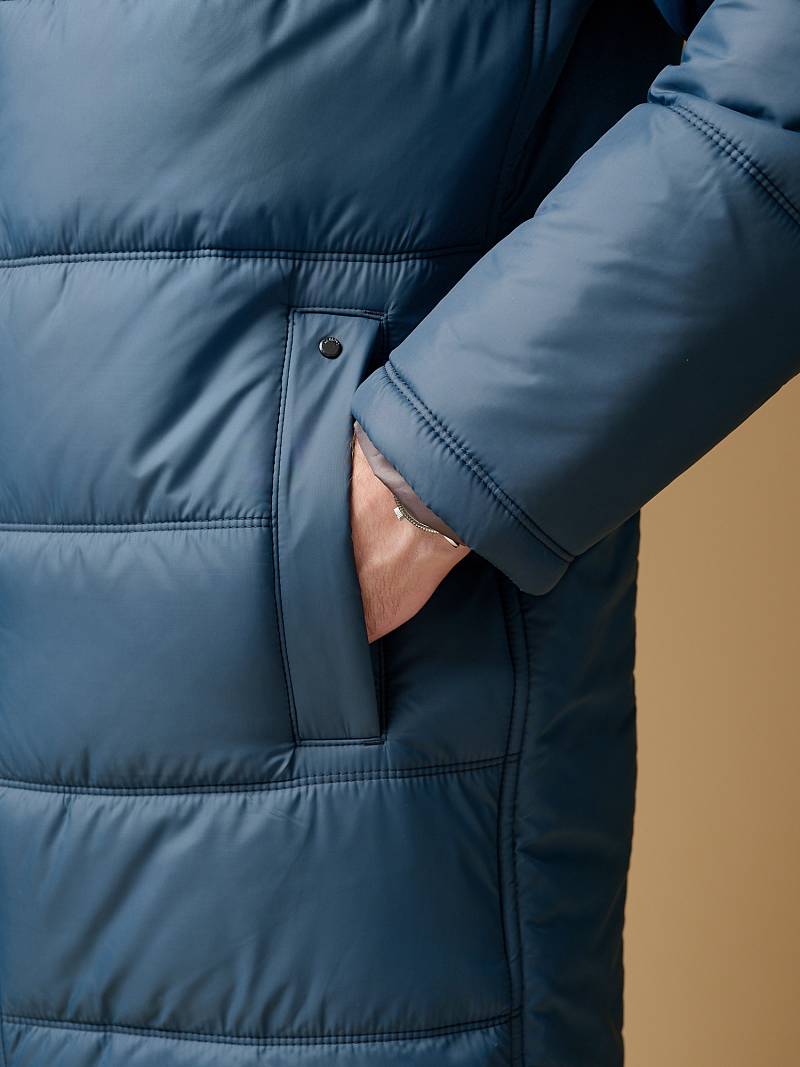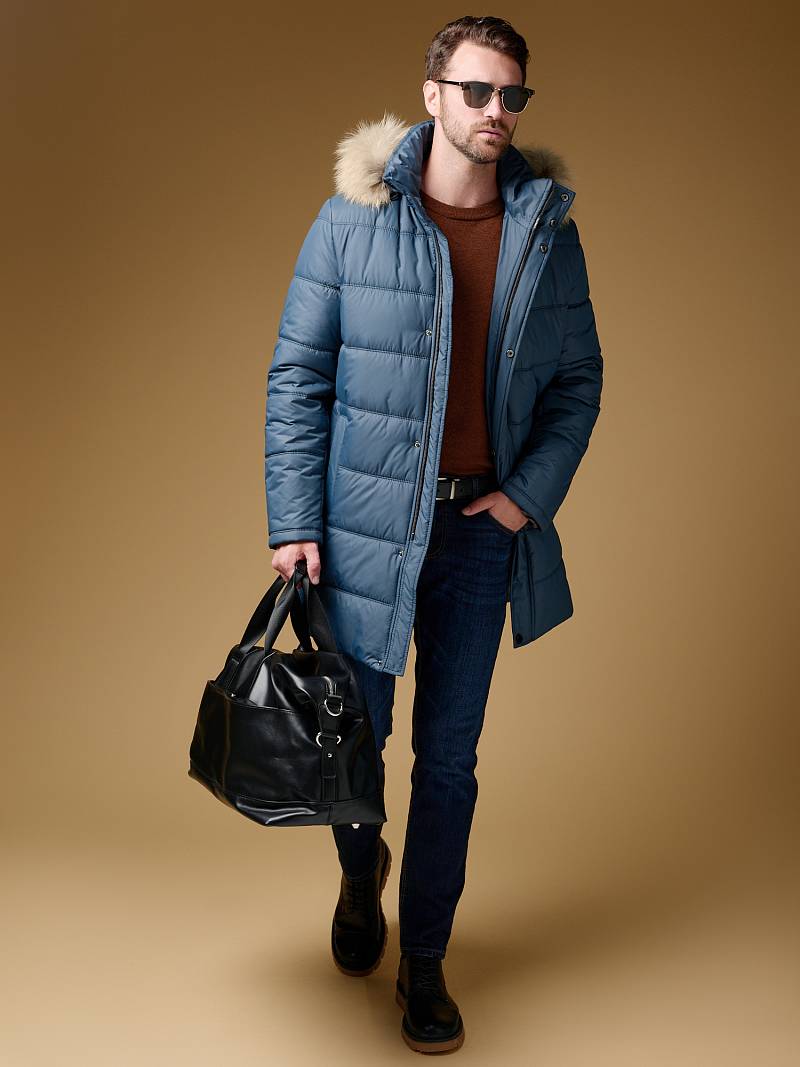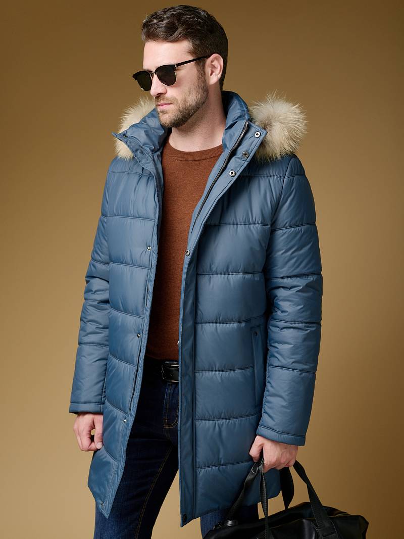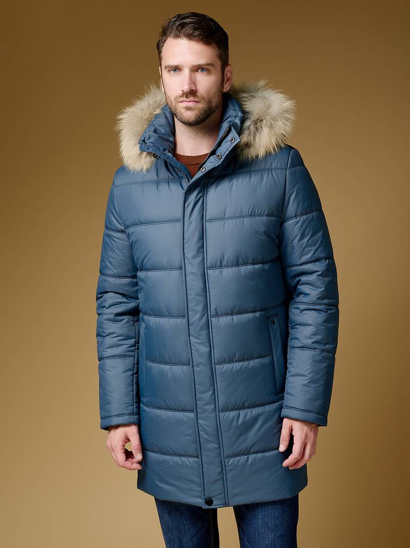 Стеганая утепленная мужская куртка-пальто из плащевой ткани со съемным капюшоном, пристегивающимся на молнию. Воротник - стойка. Застежка изделия - центральная на молнию и ветрозащитную планку с потайными кнопками. Полочки, спинка и рукава простеганы горизонтальной двойной строчкой. На полочках - прорезные карманы с листочками на магнитах. Спинка со средним швом и шлицей. На левом рукаве - отделочная деталь - нашивка. На подкладке полочек - прорезные карманы с листочкой на молнию. Длина изделия для размера 50/176 - 93см. Ткань верха: 100%полиэстер. Подкладка: 100%полиэстер. Утеплитель: термоплюс 200гр/200гр. Опушка капюшона- мех натуральный