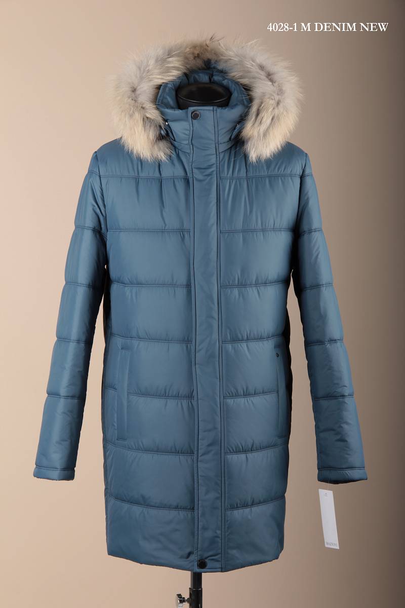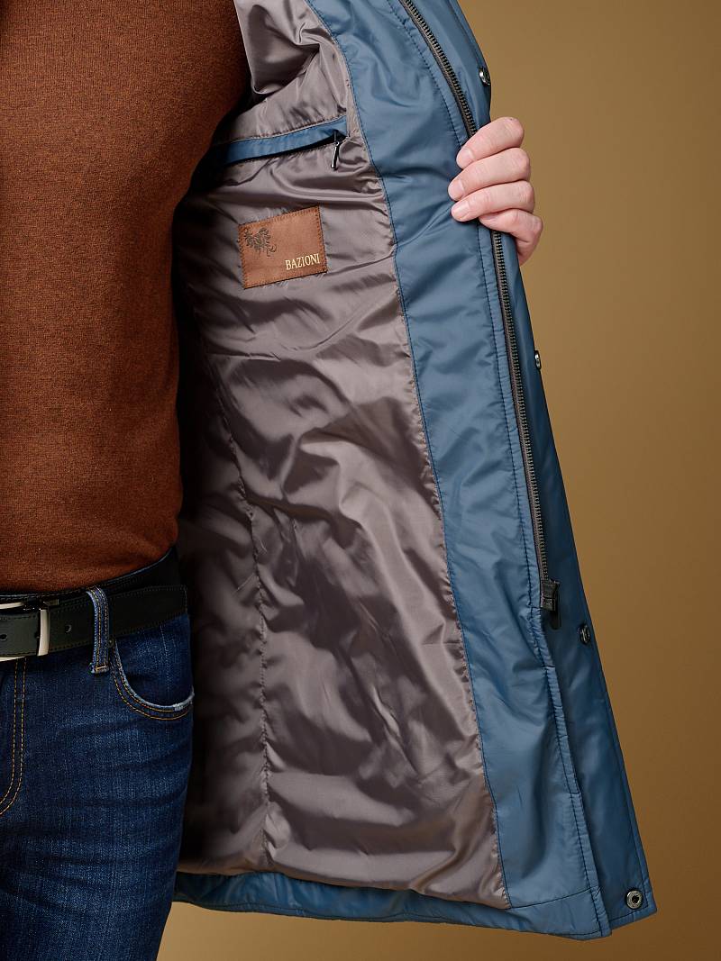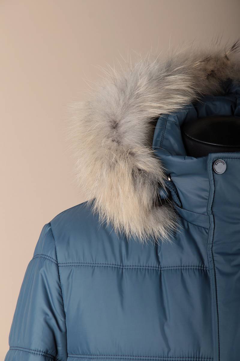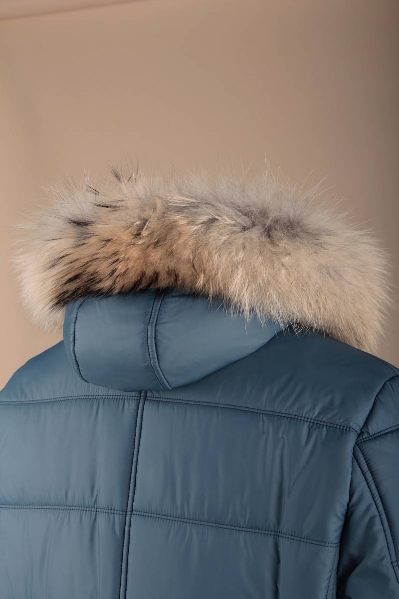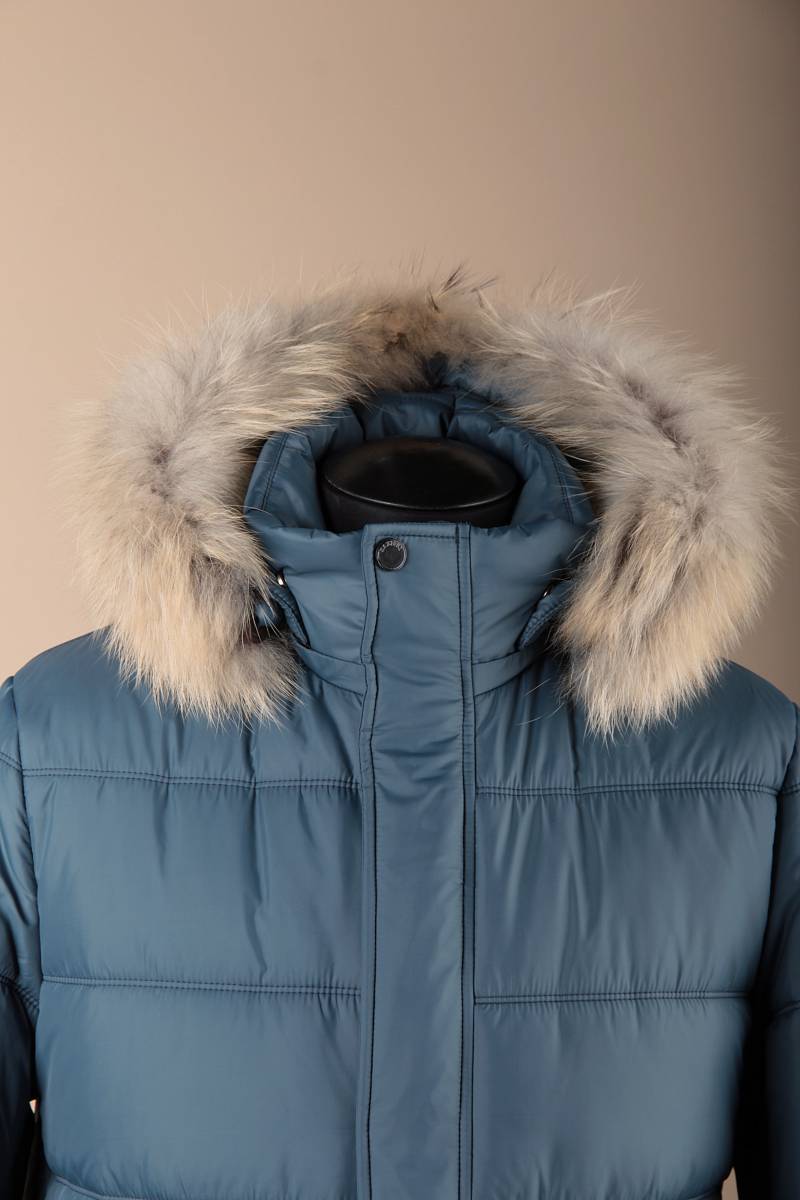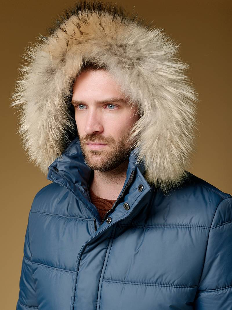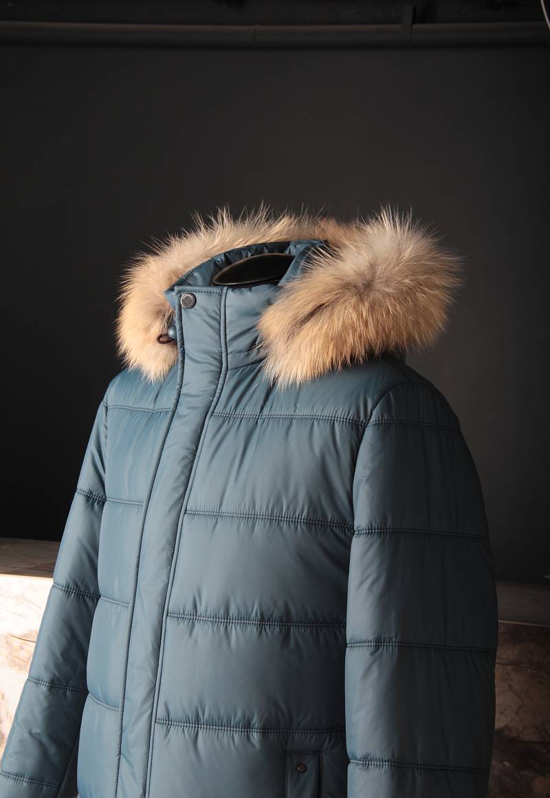 Стеганая утепленная мужская куртка-пальто из плащевой ткани со съемным капюшоном, пристегивающимся на молнию. Воротник - стойка. Застежка изделия - центральная на молнию и ветрозащитную планку с потайными кнопками. Полочки, спинка и рукава простеганы горизонтальной двойной строчкой. На полочках - прорезные карманы с листочками на магнитах. Спинка со средним швом и шлицей. На левом рукаве - отделочная деталь - нашивка. На подкладке полочек - прорезные карманы с листочкой на молнию. Длина изделия для размера 50/176 - 93см. Ткань верха: 100%полиэстер. Подкладка: 100%полиэстер. Утеплитель: термоплюс 200гр/200гр. Опушка капюшона- мех натуральный