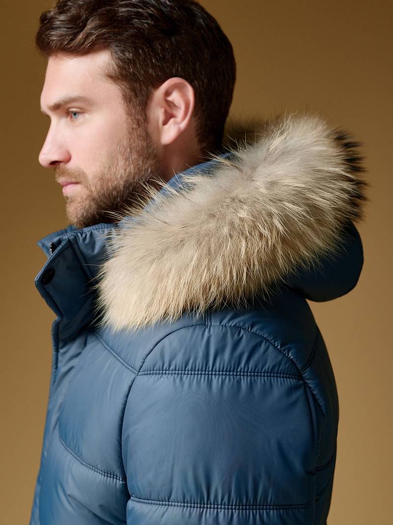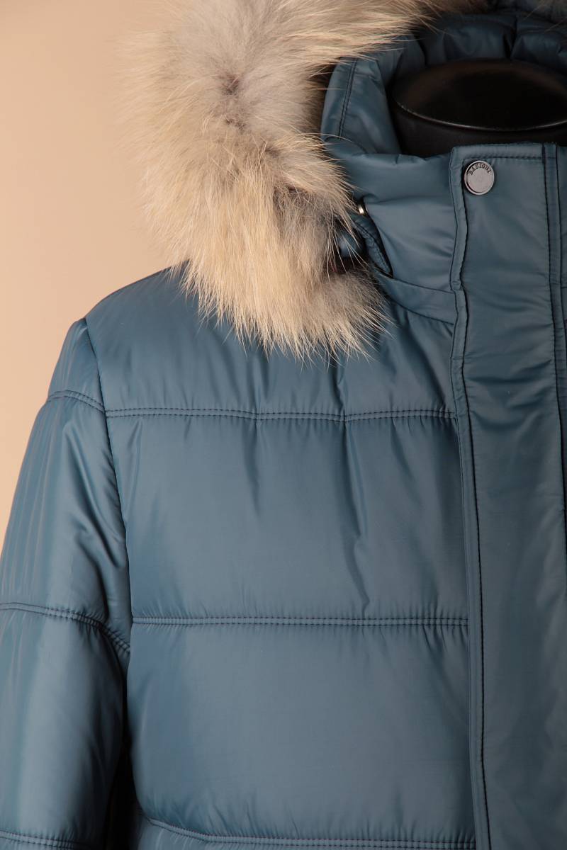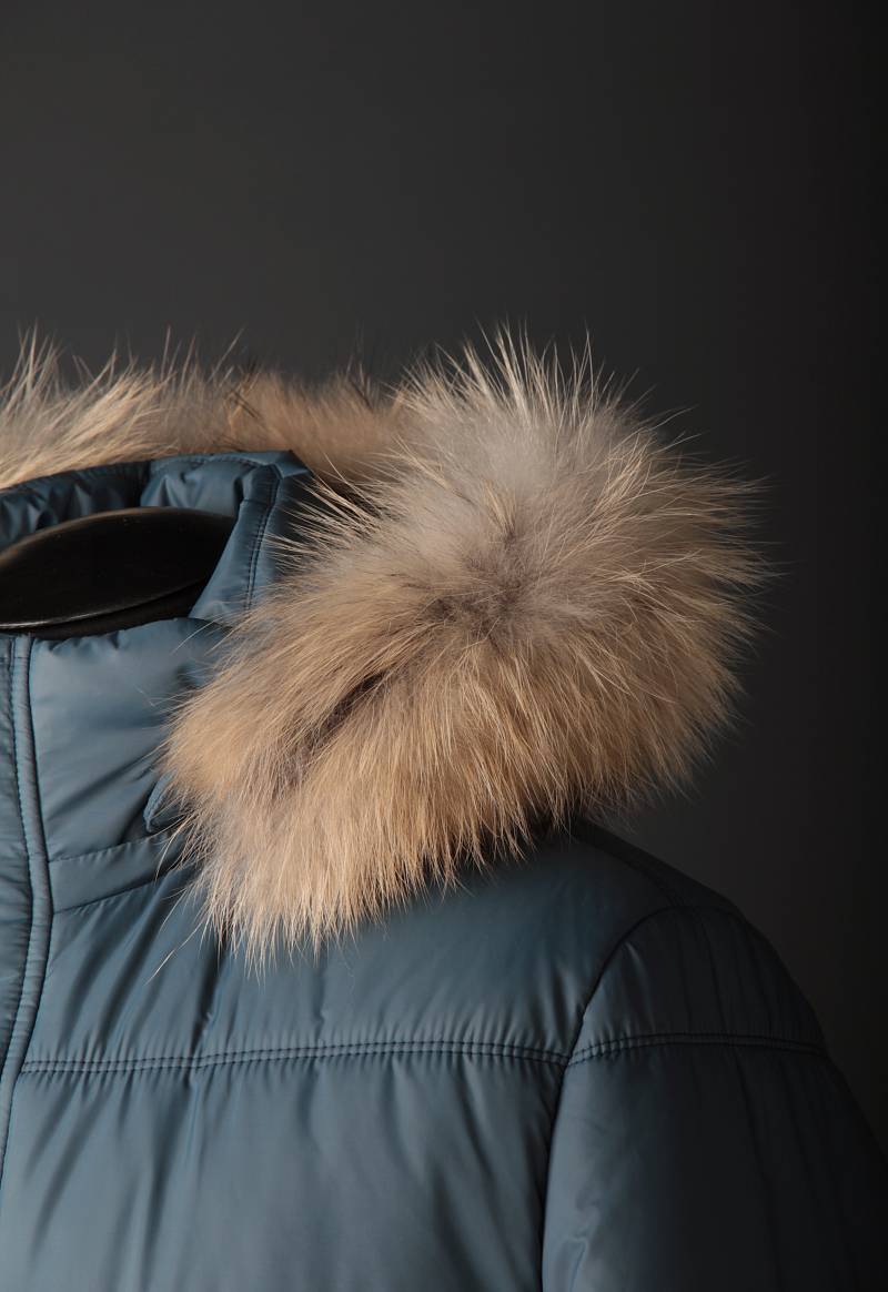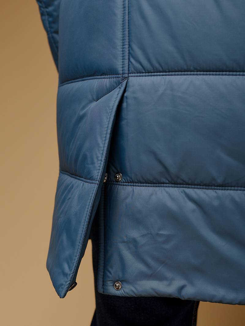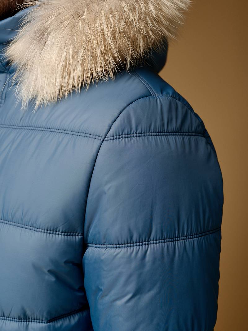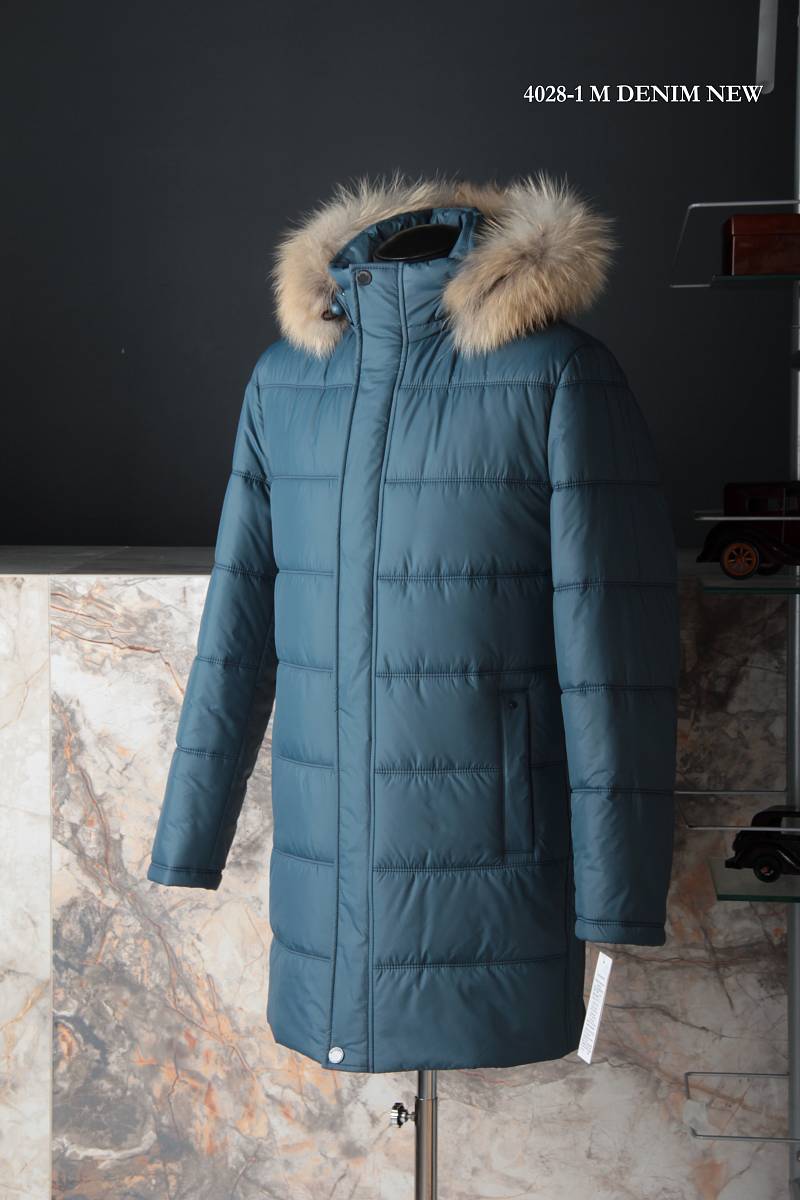 Стеганая утепленная мужская куртка-пальто из плащевой ткани со съемным капюшоном, пристегивающимся на молнию. Воротник - стойка. Застежка изделия - центральная на молнию и ветрозащитную планку с потайными кнопками. Полочки, спинка и рукава простеганы горизонтальной двойной строчкой. На полочках - прорезные карманы с листочками на магнитах. Спинка со средним швом и шлицей. На левом рукаве - отделочная деталь - нашивка. На подкладке полочек - прорезные карманы с листочкой на молнию. Длина изделия для размера 50/176 - 93см. Ткань верха: 100%полиэстер. Подкладка: 100%полиэстер. Утеплитель: термоплюс 200гр/200гр. Опушка капюшона- мех натуральный