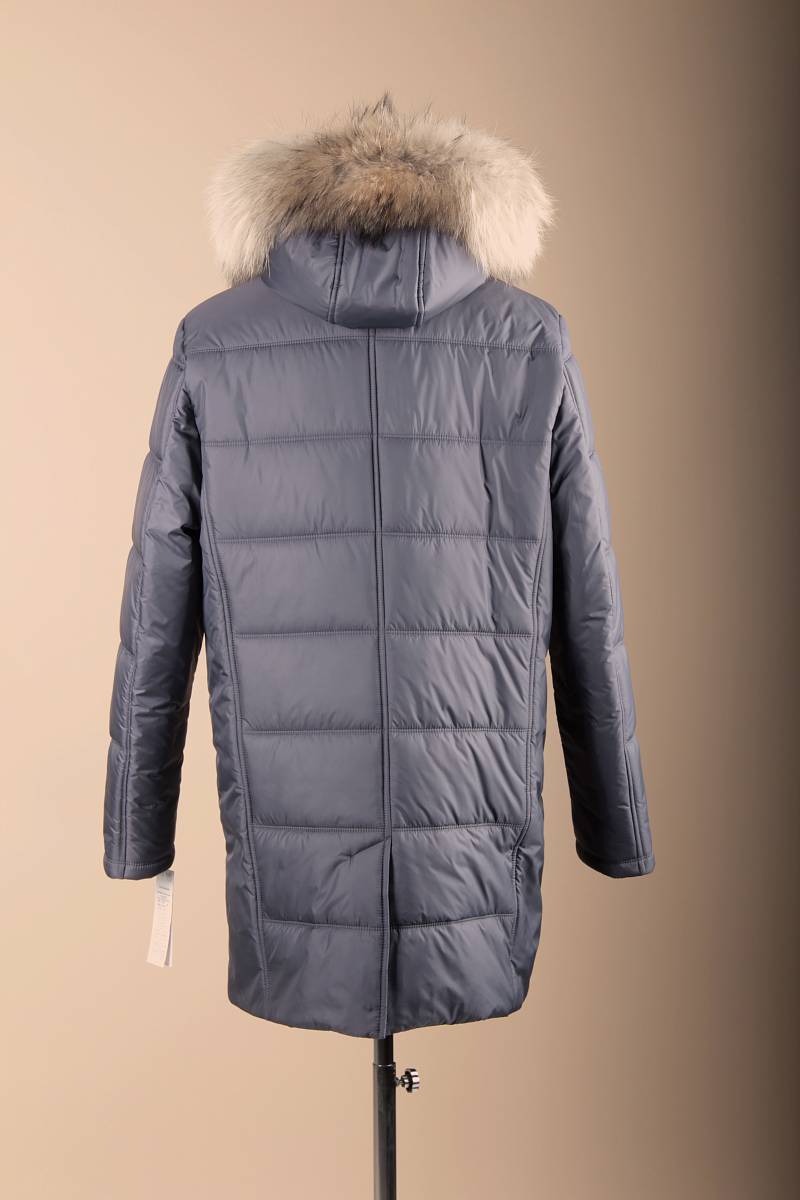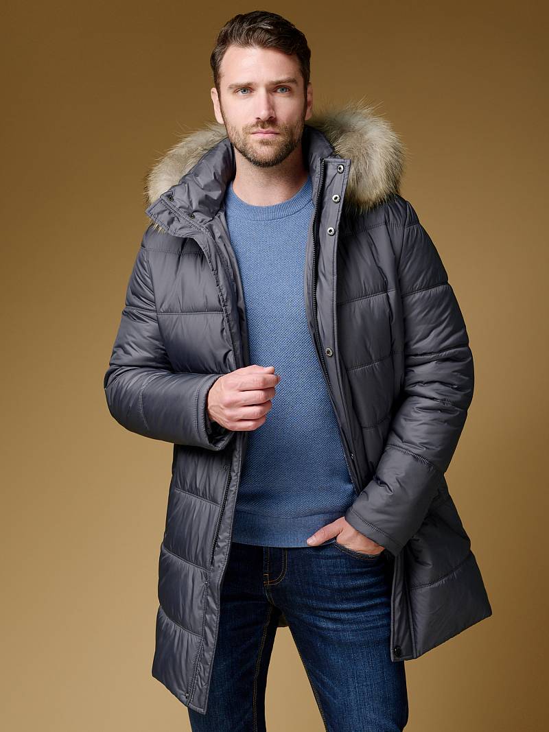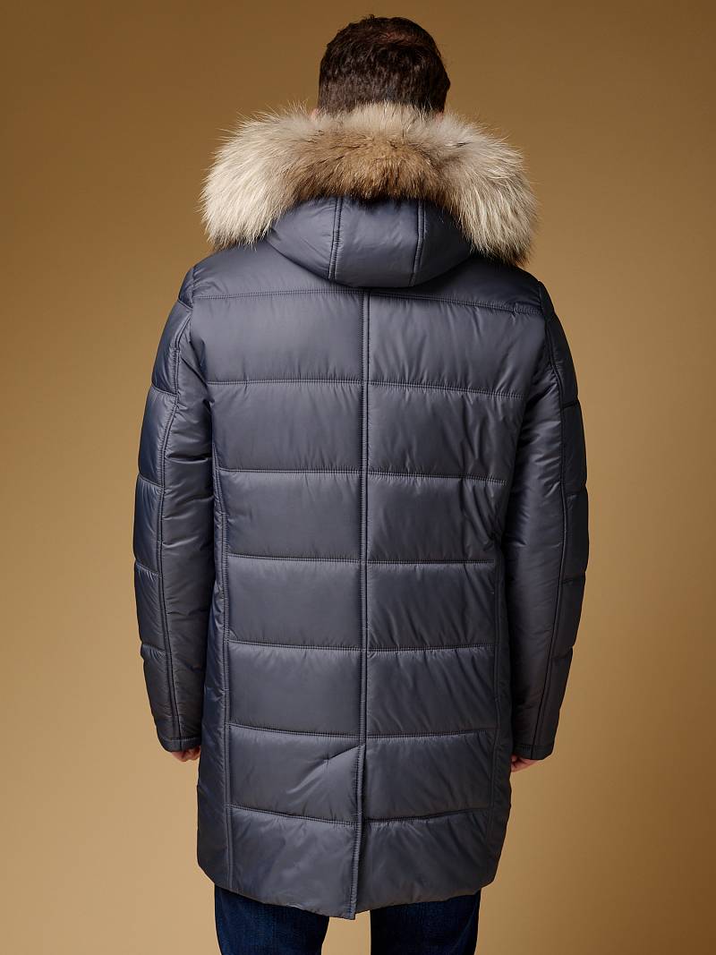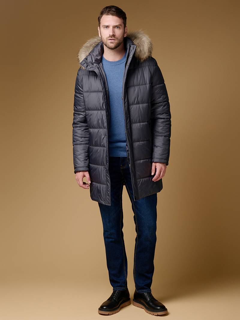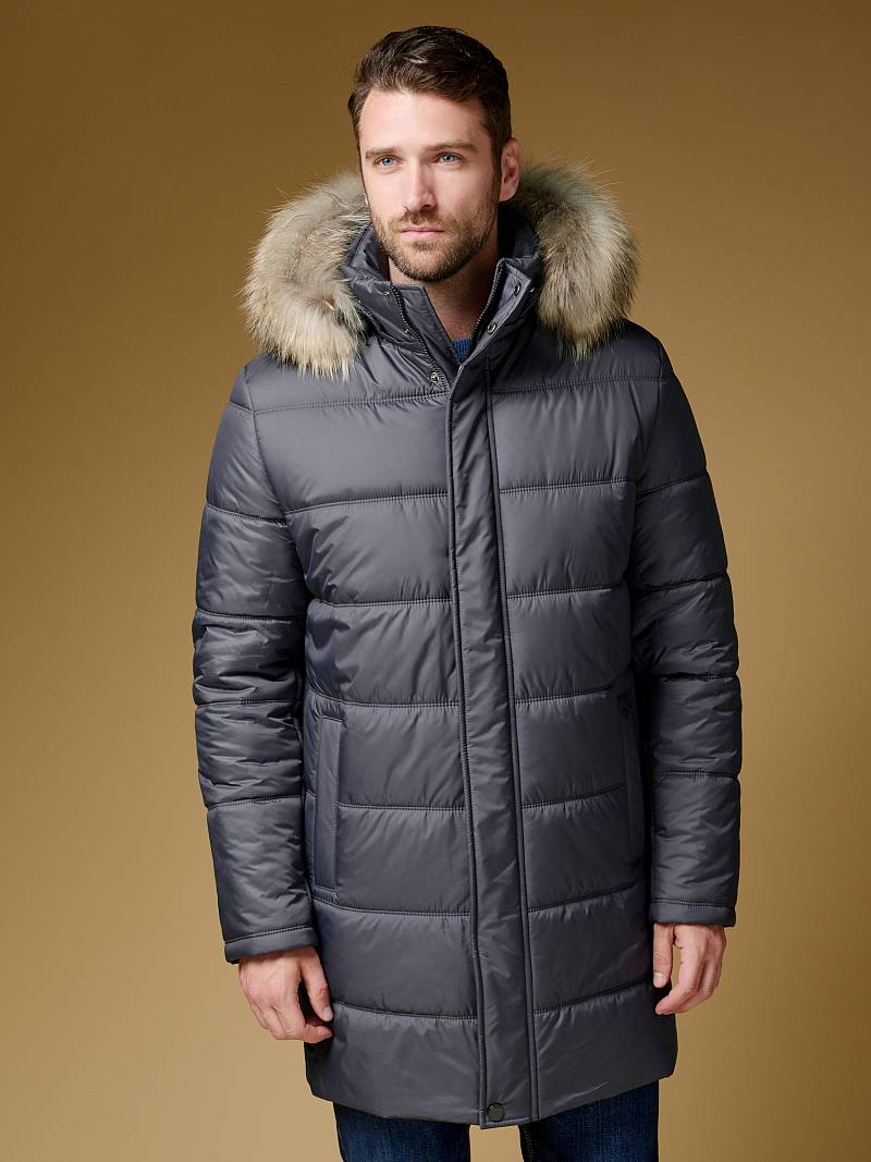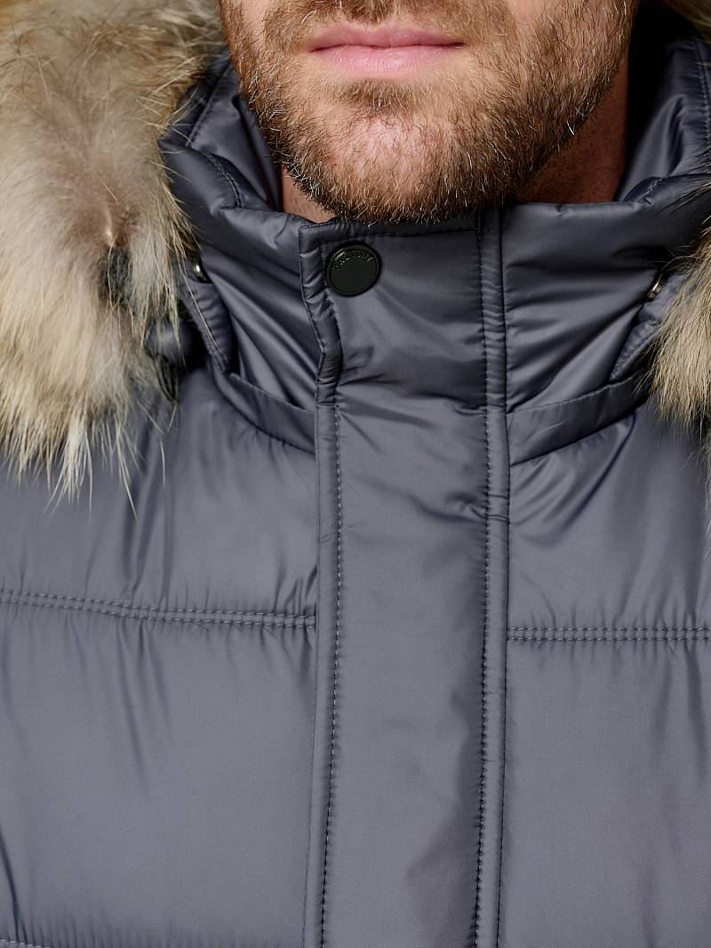 Стеганая утепленная мужская куртка-пальто из плащевой ткани со съемным капюшоном, пристегивающимся на молнию. Воротник - стойка. Застежка изделия - центральная на молнию и ветрозащитную планку с потайными кнопками. Полочки, спинка и рукава простеганы горизонтальной двойной строчкой. На полочках - прорезные карманы с листочками на магнитах. Спинка со средним швом и шлицей. На левом рукаве - отделочная деталь - нашивка. На подкладке полочек - прорезные карманы с листочкой на молнию. Длина изделия для размера 50/176 - 93см. Ткань верха: 100%полиэстер. Подкладка: 100%полиэстер. Утеплитель: термоплюс 200гр/200гр. Опушка капюшона- мех натуральный
