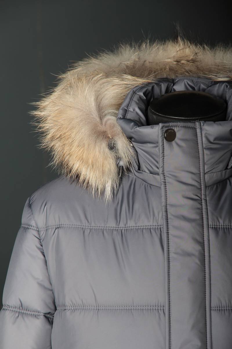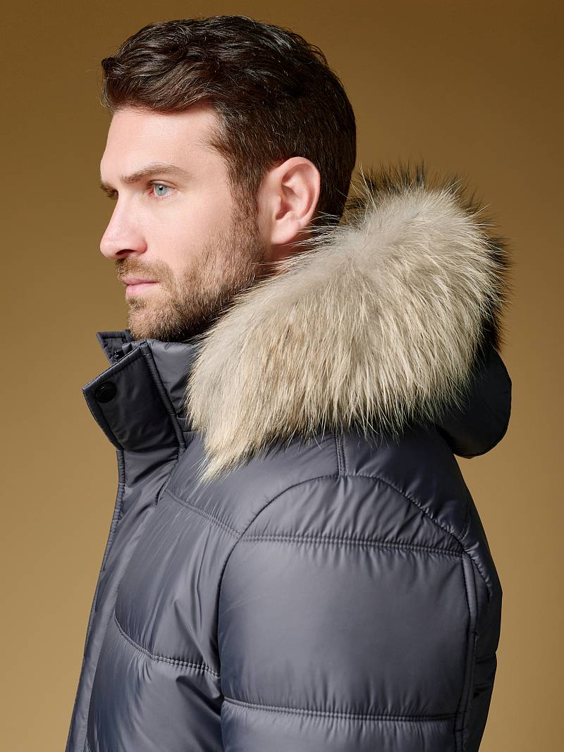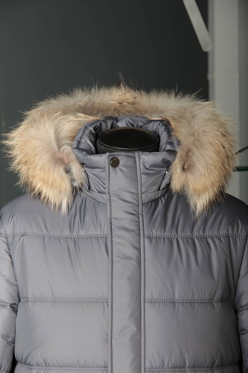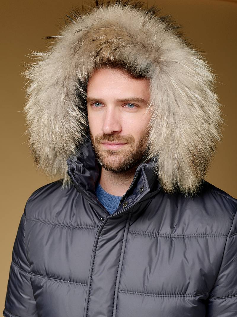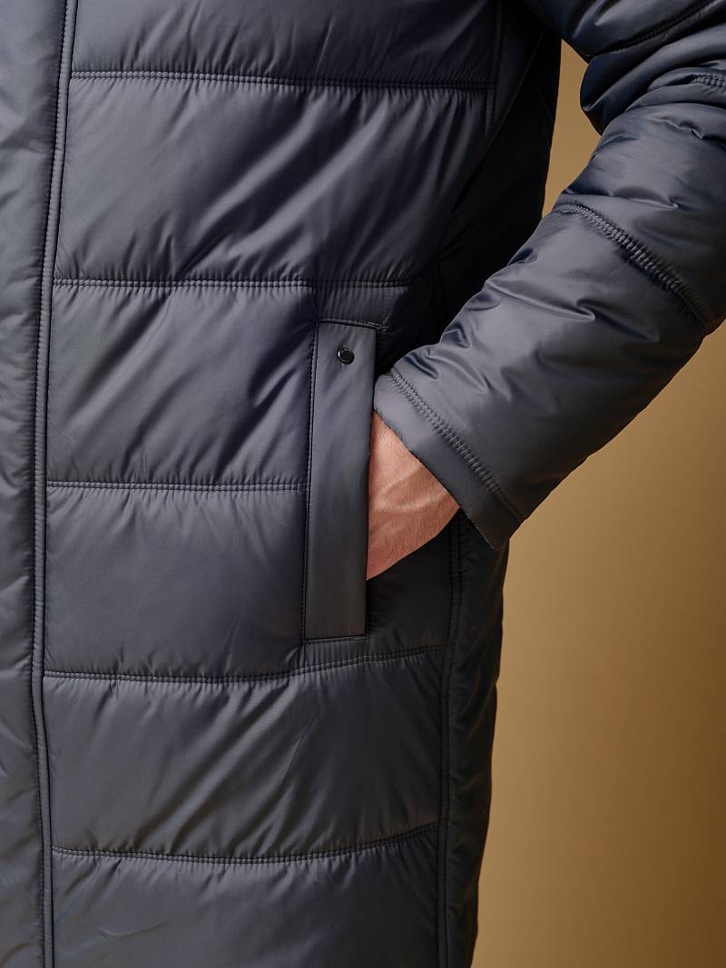 Стеганая утепленная мужская куртка-пальто из плащевой ткани со съемным капюшоном, пристегивающимся на молнию. Воротник - стойка. Застежка изделия - центральная на молнию и ветрозащитную планку с потайными кнопками. Полочки, спинка и рукава простеганы горизонтальной двойной строчкой. На полочках - прорезные карманы с листочками на магнитах. Спинка со средним швом и шлицей. На левом рукаве - отделочная деталь - нашивка. На подкладке полочек - прорезные карманы с листочкой на молнию. Длина изделия для размера 50/176 - 93см. Ткань верха: 100%полиэстер. Подкладка: 100%полиэстер. Утеплитель: термоплюс 200гр/200гр. Опушка капюшона- мех натуральный