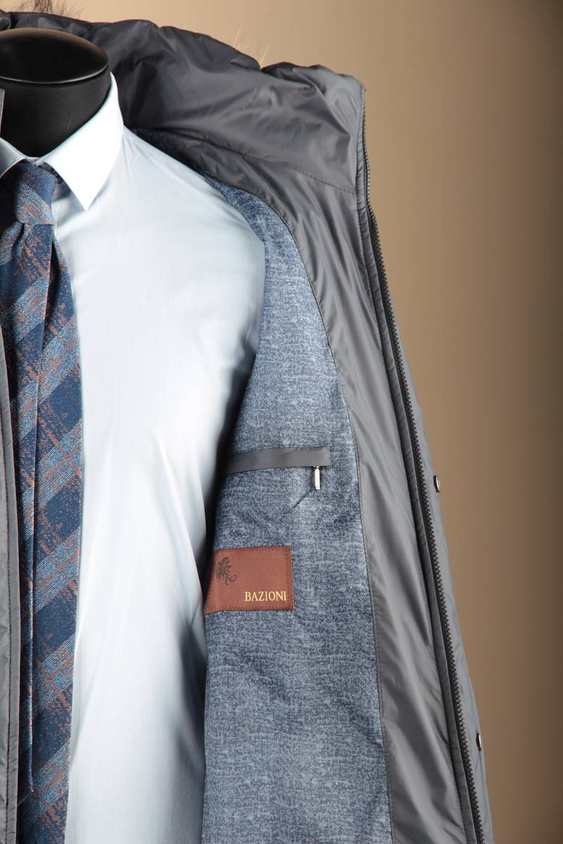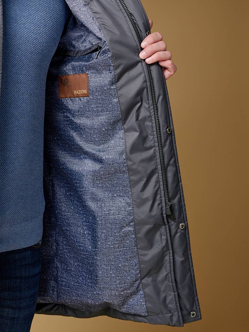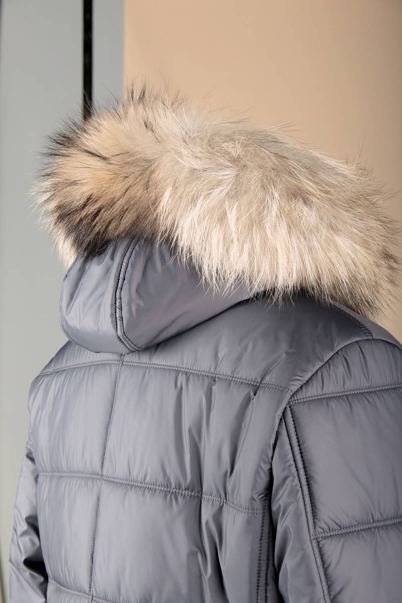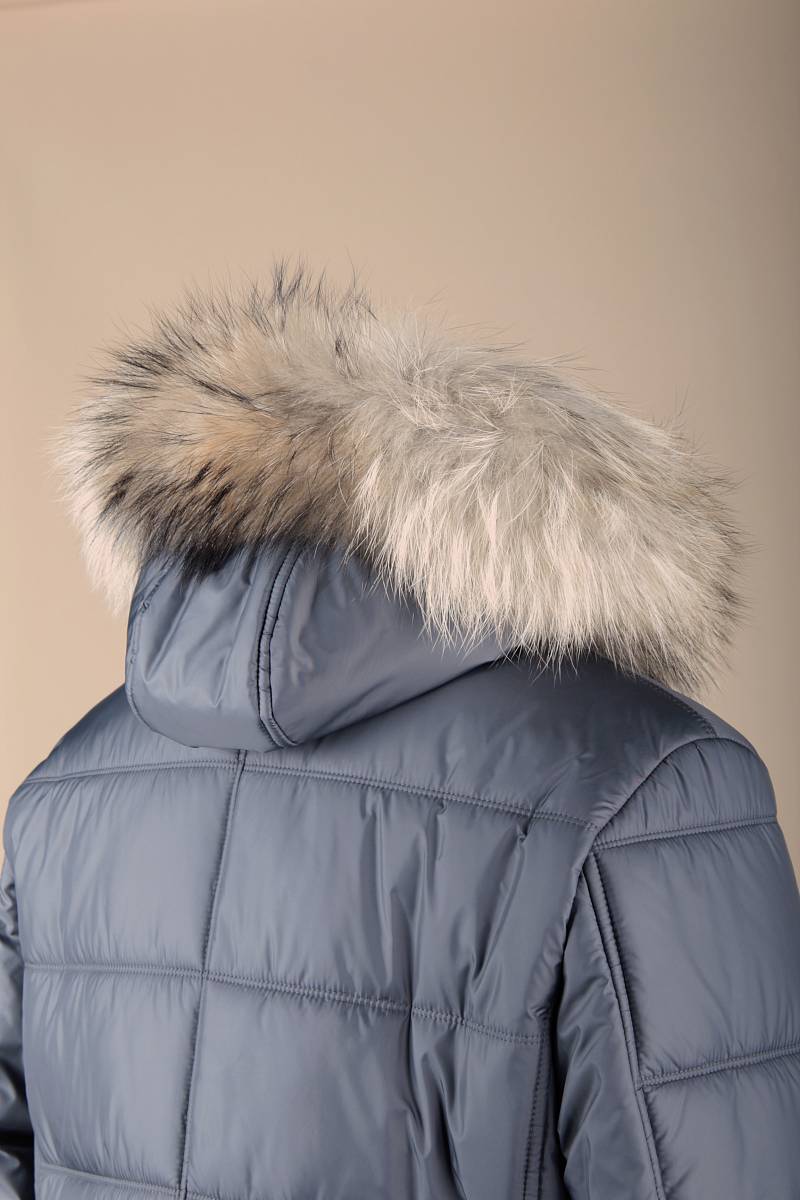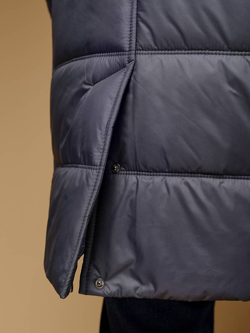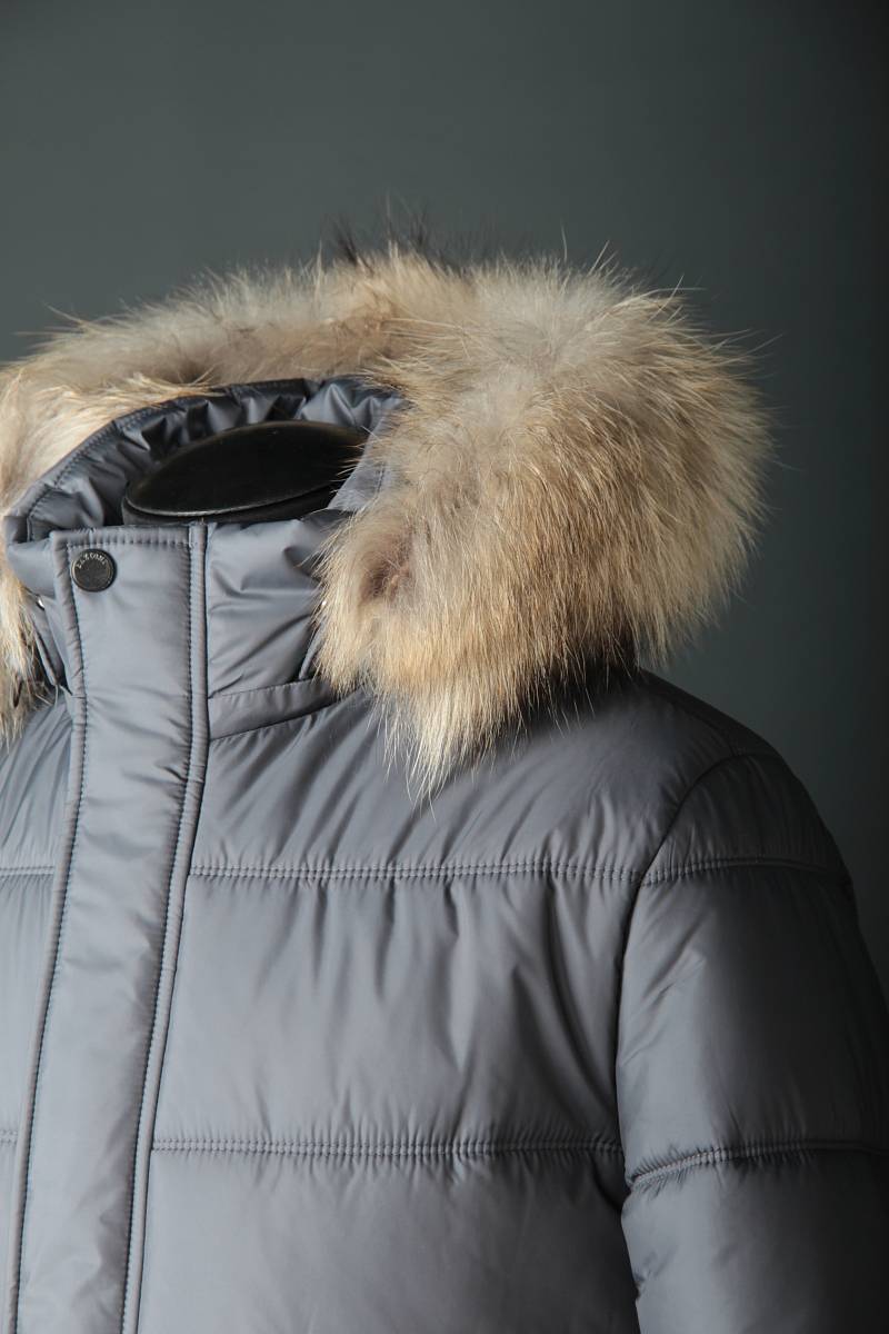 Стеганая утепленная мужская куртка-пальто из плащевой ткани со съемным капюшоном, пристегивающимся на молнию. Воротник - стойка. Застежка изделия - центральная на молнию и ветрозащитную планку с потайными кнопками. Полочки, спинка и рукава простеганы горизонтальной двойной строчкой. На полочках - прорезные карманы с листочками на магнитах. Спинка со средним швом и шлицей. На левом рукаве - отделочная деталь - нашивка. На подкладке полочек - прорезные карманы с листочкой на молнию. Длина изделия для размера 50/176 - 93см. Ткань верха: 100%полиэстер. Подкладка: 100%полиэстер. Утеплитель: термоплюс 200гр/200гр. Опушка капюшона- мех натуральный