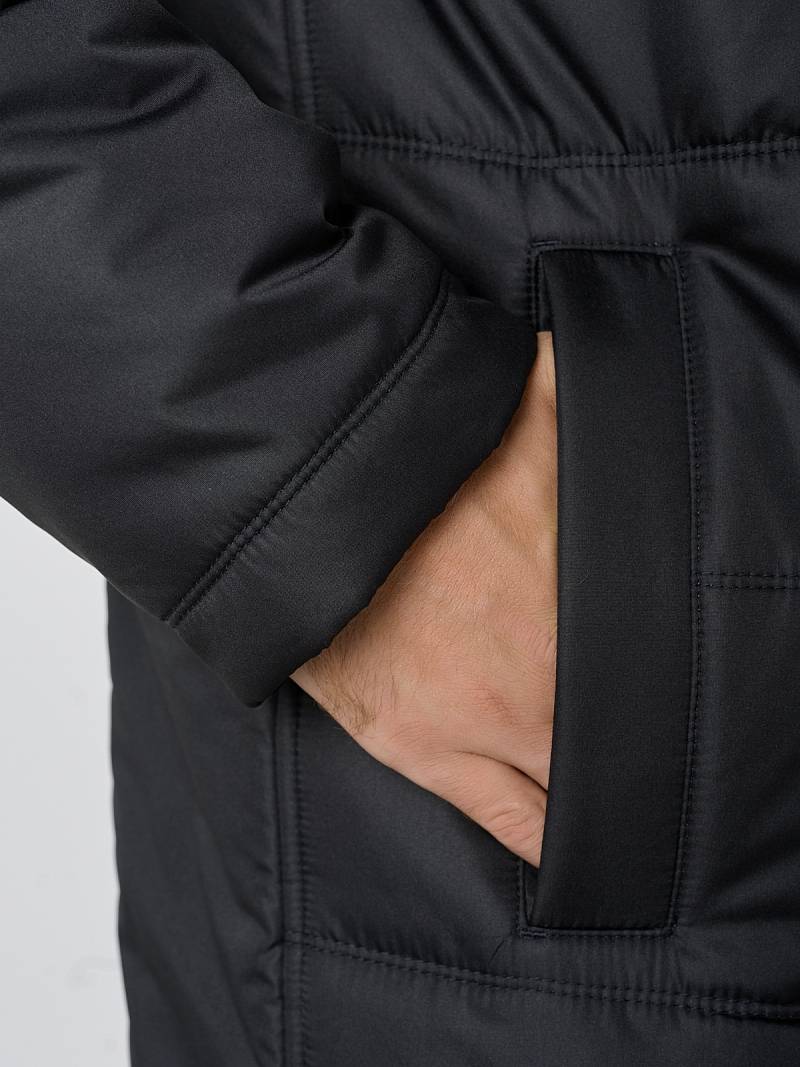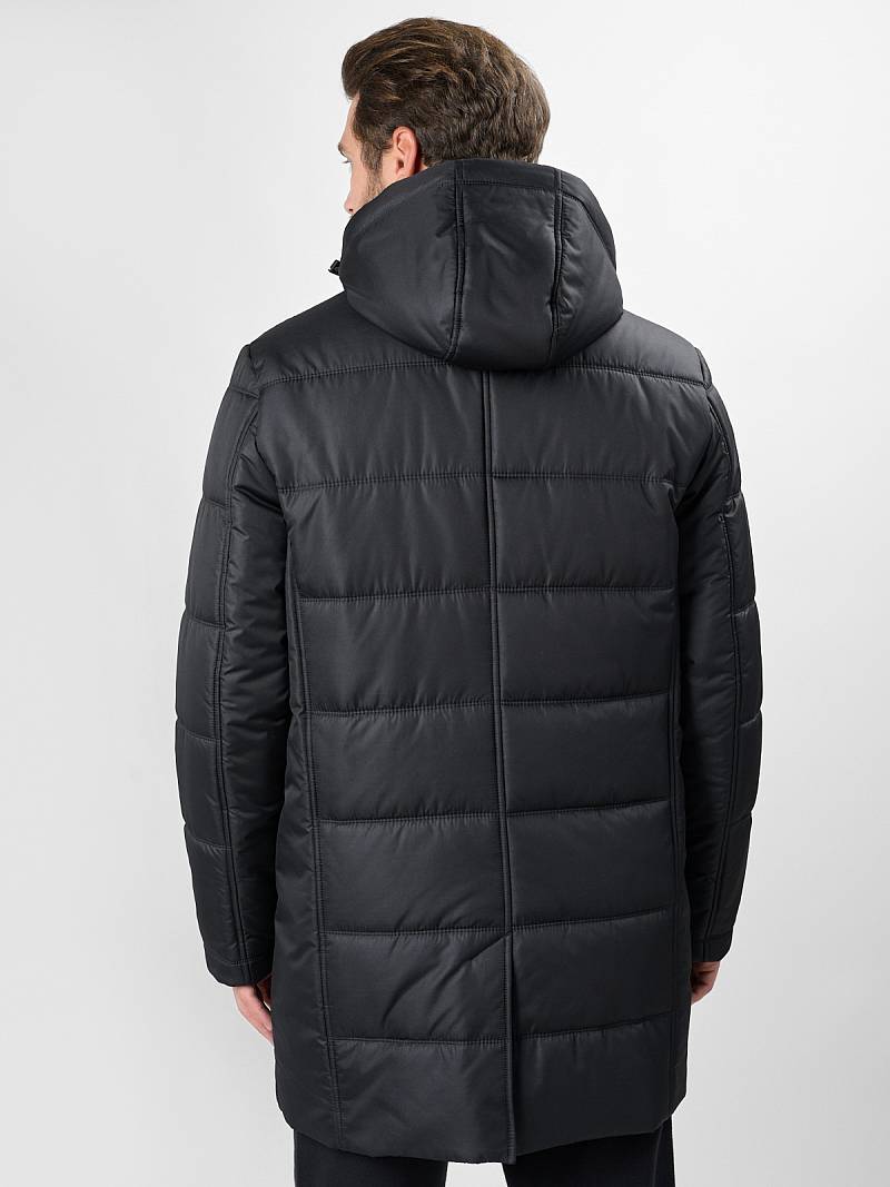 Стеганая утепленная мужская куртка-пальто из плащевой ткани со съемным капюшоном, пристегивающимся на молнию. Воротник - стойка. Застежка изделия - центральная на молнию и ветрозащитную планку с потайными кнопками. Полочки, спинка и рукава простеганы горизонтальной двойной строчкой. На полочках - прорезные карманы с листочками на магнитах. Спинка со средним швом и шлицей. На левом рукаве - отделочная деталь - нашивка. На подкладке полочек - прорезные карманы с листочкой на молнию. Длина изделия для размера 50/176 - 93см. Ткань верха: 100%полиэстер. Подкладка: 100%полиэстер. Утеплитель: термоплюс 200гр/200гр