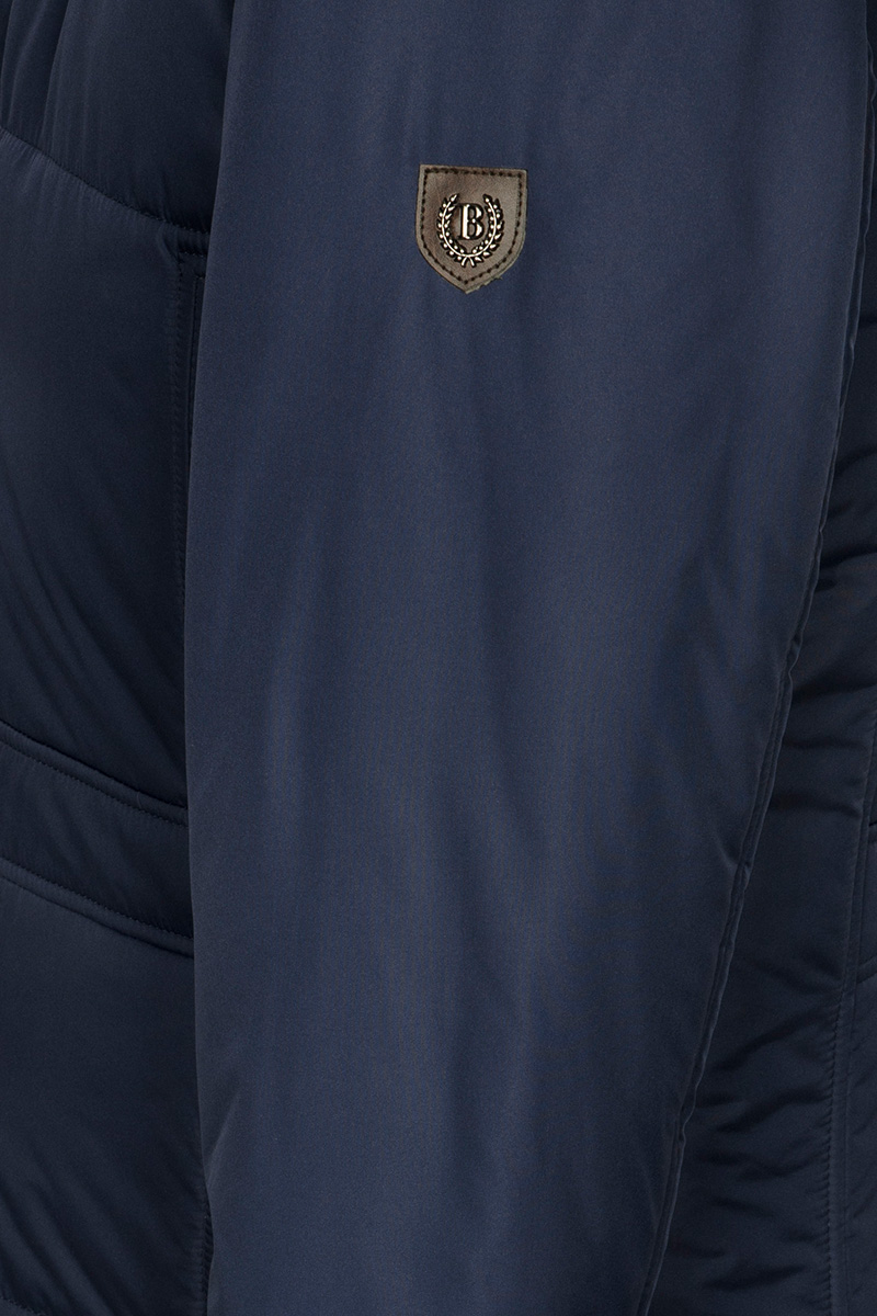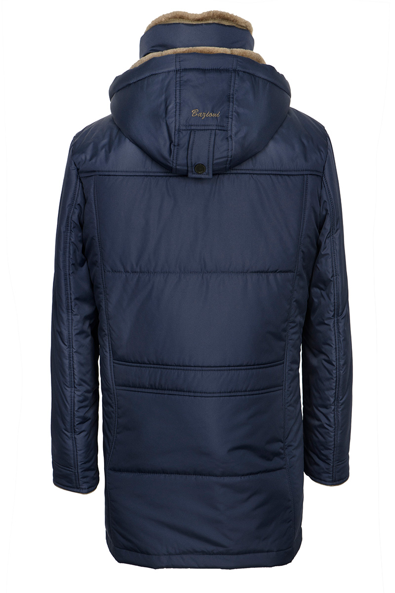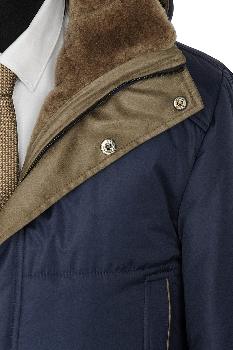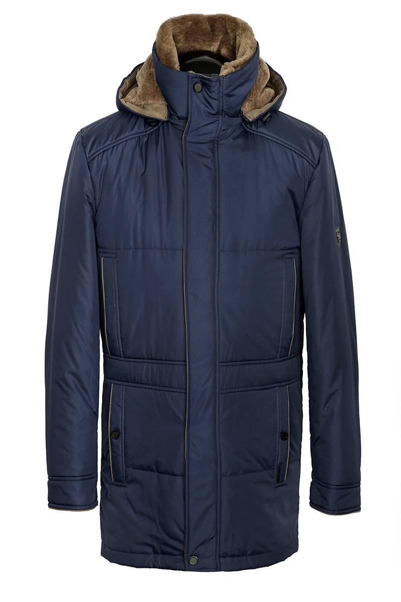 Куртка мужская утепленная с капюшоном и с меховой подстежкой из полушерстяного меха. Капюшон пристегивается на молнию, подкладка капюшона- полушерстяной мех. Застежка куртки - центральная на молнию и планку с 5 кнопками. На полочках - кокетки, верхние и нижние вертикальные карманы с листочками, расположены друг под другом. По линии талии полочек - деталь-пояс. Спинка с кокеткой, бочками и средней частью. На средней части спинки - по талии расположена деталь-пояс. Рукава состоят из двух деталей, на левом рукаве - нашивка-герб, по низу рукавов- трикотажные манжеты. На подкладке - внутренние карманы на молнии. Меховая пристежка пристегивается к изделию на пуговицы: по плечевым швам, по горловине изделия, в нижней части проймы, а также в боковых швах по низу.