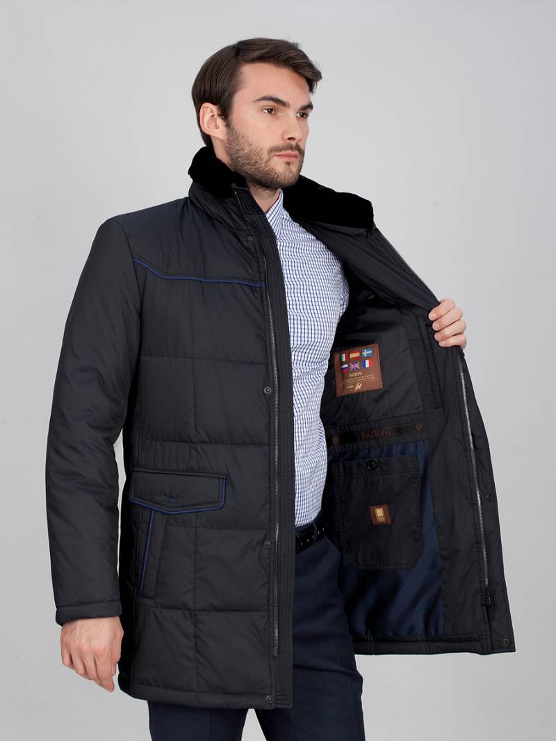 Куртка мужская утепленная со съемным натуральным меховым воротником, воротник - стойка. Центральная застежка изделия на молнию и ветрозащитную планку на 5 потайных кнопок. Полочки, спинка- с фигурными кокетками. Рукава, полочки и спинка - простеганы стежкой "квадрат". На полочках - четыре нижних прорезных кармана: 1-й-с фигурными клапанами, 2-ой - наклонный с листочками. также имеется верхний прорезной карман на молнии. На подкладке по линии талии - настрочная фирменная тесьма. Также на подкладке два внутренних кармана на молниях и один накладной карман на пуговице. Длина изделия по спинке для роста 176 - 84см. Ткань верха: 100% полиэстер. Подкладка: 50% вискоза, 50% полиэстер. Утеплитель: Био-пух 100% (220гр)