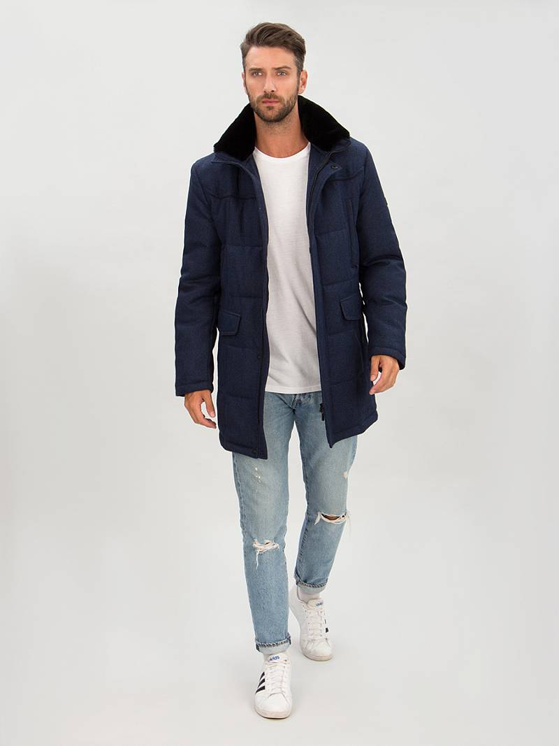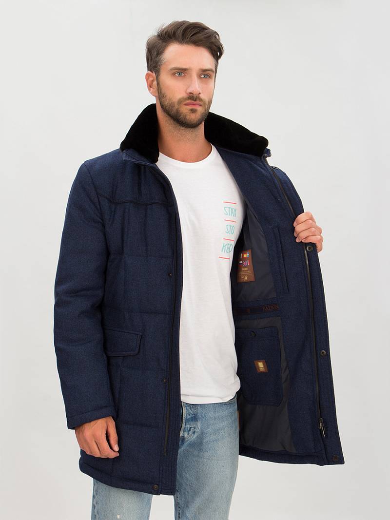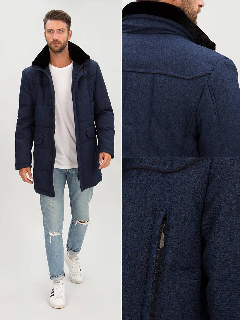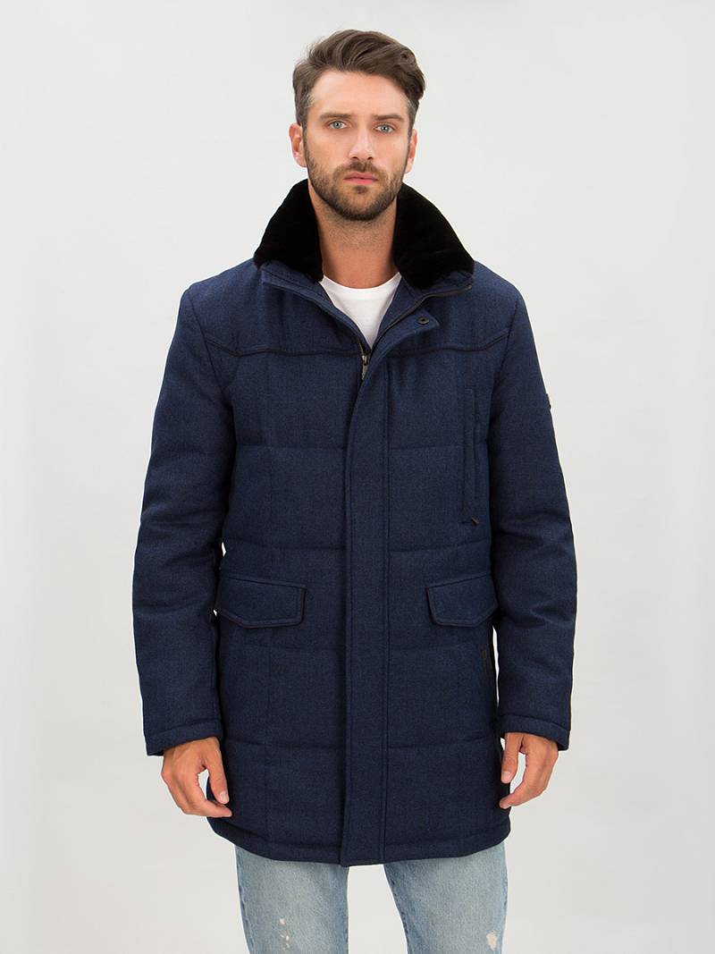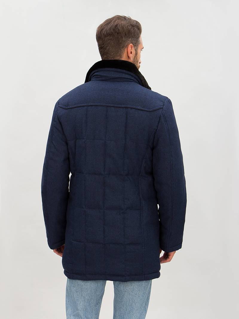 Куртка мужская утепленная со съемным натуральным меховым воротником, воротник - стойка. Центральная застежка изделия на молнию и ветрозащитную планку на 5 потайных кнопок. Полочки, спинка- с фигурными кокетками. Рукава, полочки и спинка - простеганы стежкой "квадрат". На полочках - четыре нижних прорезных кармана: 1-й-с фигурными клапанами, 2-ой - наклонный с листочками. также имеется верхний прорезной карман на молнии. На подкладке по линии талии - настрочная фирменная тесьма. Также на подкладке два внутренних кармана на молниях и один накладной карман на пуговице. Длина изделия по спинке для роста 176 - 84см. Ткань верха: 100% шерсть. Подкладка: 50% вискоза, 50% полиэстер. Утеплитель: био-пух 100% (250 гр). Воротник-мех натуральный "мутон"