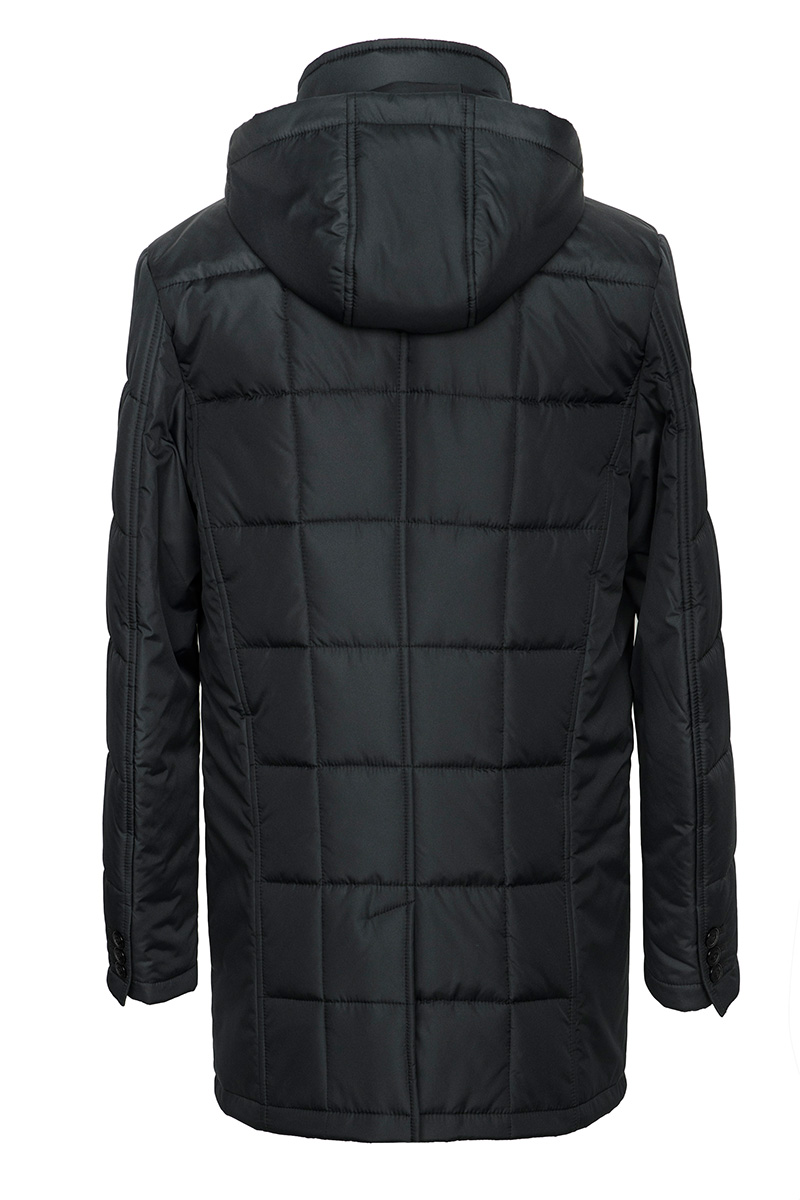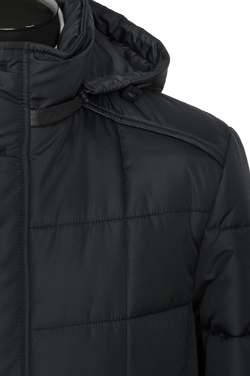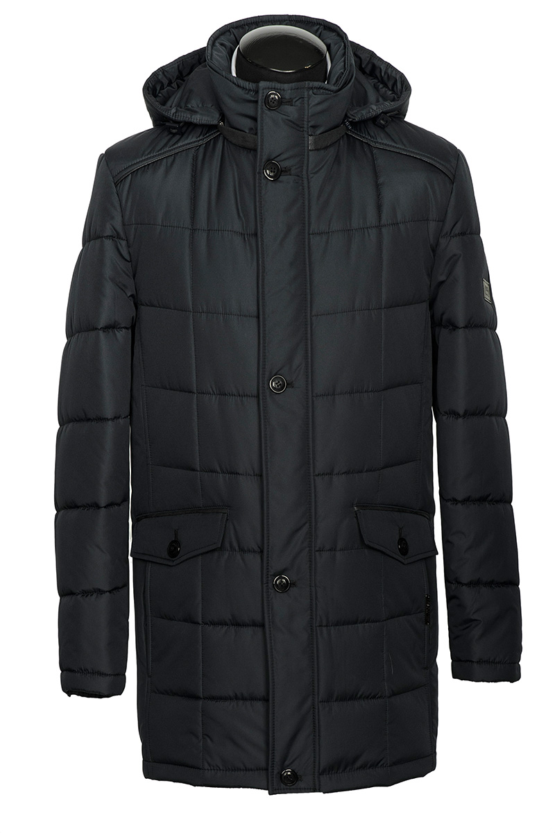 Куртка мужская утепленная со съемным капюшоном, воротник - стойка. Центральная застежка изделия на молнию и ветрозащитную планку на 5 пуговиц. Полочки, спинка и рукава - простеганы стежкой "квадрат". На полочках - нижние прорезные карманы с фигурными клапанами на пуговицу, также имеются карманы внизу рельефных швов. На спинке - шлица, застегивается на 2 потайные кнопки. На подкладке по линии талии - настрочная фирменная тесьма. Длина изделия по спинке для роста 176 - 85см. Ткань верха: 100%полиэстер. Подкладка: 50% вискоза, 50% полиэстер. Утеплитель: термоплюс 200 гр.