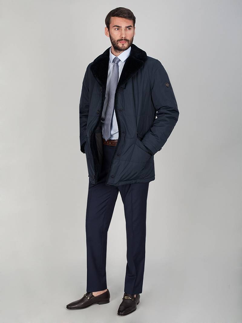 Куртка мужская утепленная с английским воротником из плащевой ткани с центральной застежкой на 5 пуговиц. Меховые полушерстяные воротник и подборт - не съемные. На нижней стойке воротника-вышивка BAZIONI. По полочке и спинке - горизонтальная стежка и отделочные строчки по рельефам. На полочках два наклонных кармана с листочками и 2 наклонных кармана с молниями. Спинка с двумя шлицами в боковых рельефах. Рукава с локтевыми швами, по которым проложены отделочные строчки. Низ рукавов оформлен меховой обтачкой. На левом рукаве - фирменная нашивка. Подкладка изделия состоит из двух частей: верхняя и нижняя части. По талии - отделочная фирменная тесьма. Полочки подкладки изделия с внутренними прорезными карманами с листочками. Длина изделия по спинке для роста 176 - 82см. Ткань верха: 100%полиэстер. Подкладка: 50% вискоза, 50% полиэстер Утеплитель: термофин 200 гр.