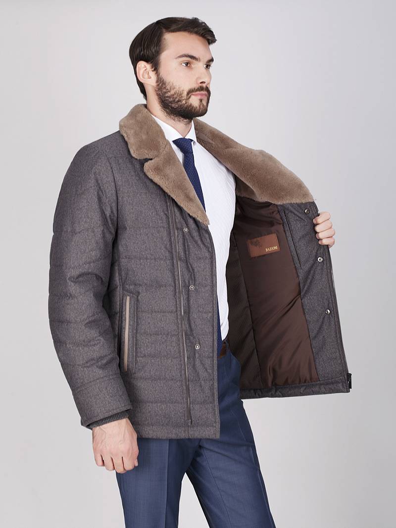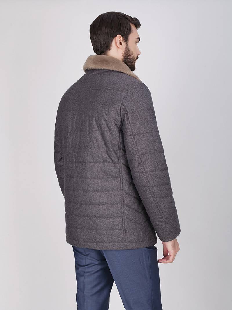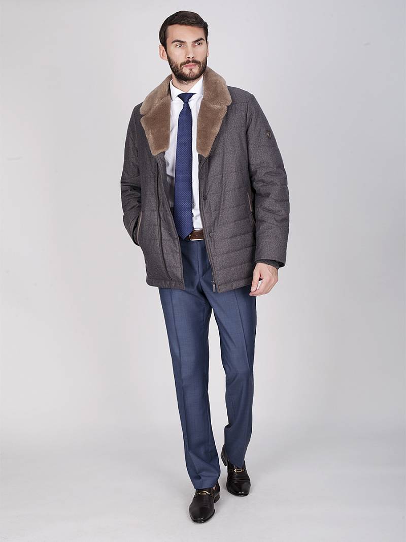 Куртка мужская утепленная с несъемным меховым воротником и смещенной застежкой на молнию и кнопки. Отложной воротник с лацканами и верхняя часть подкладки изделия - из полушерстяного меха. Спинка и полочки простеганы горизонтальной стежкой. На полочках и спинке - горизонтальные кокетки. Боковые карманы с листочками расположены в рельефных швах. Рукава простеганы V-образной стежкой, по низу рукавов - трикотажный манжет, на левом рукаве - герб-нашивка. По рельефным швам, плечевым, по швам притачивания кокеток, по локтевым швам и по шву притачивания паты - проложена двойная отделочная строчка. Подкладка изделия - комбинированная. Состоит из меховой подкладки и подкладочных тканей двух видов. На полочках подкладки - внутренние карманы с листочками на молнии. По талии подкладки - фирменная тесьма. Длина изделия по спинке для роста 176 - 78см. Ткань верха: 100%полиэстер. Подкладка: 100%полиэстер. Утеплитель: термоплюс 200гр