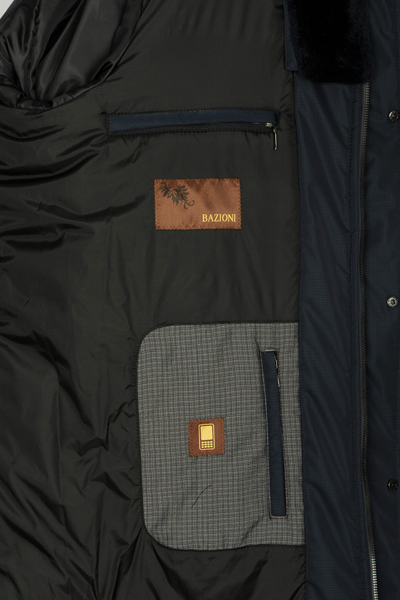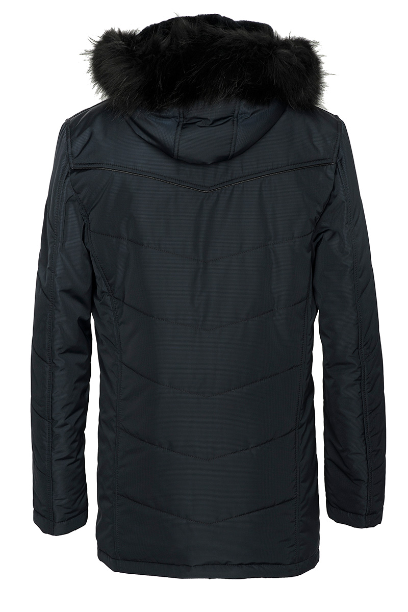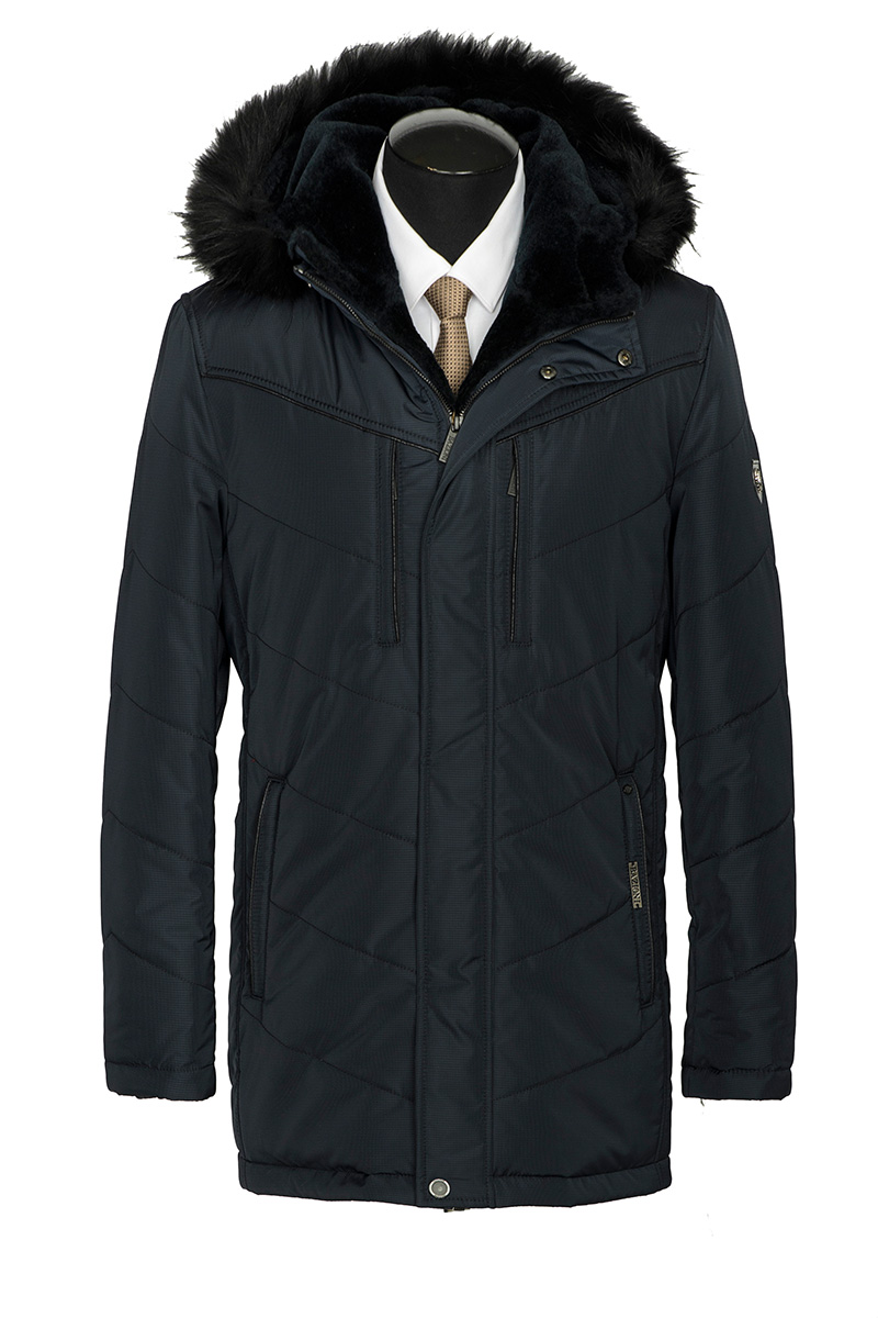 Куртка мужская утепленная с капюшоном с застежкой на молнию и ветрозащитную планку на 6 кнопок. Капюшон с опушкой из натурального енота- съемный, пристегивающийся на молнию, меховая опушка также съемная на кнопках. Внутренняя часть капюшона из полушерстянного меха. Воротник - стойка. Полочки и спинка с наклонными кокетками. На полочках, спинке и рукавах - стежка, линии которой простеганы паралельно линиям кокеток. Полочки с двумя нагрудными карманами с листочками на молнию и двумя нижними боковыми карманами с листочками на молнию. Рукава втачные состоят из двух частей, по низу рукавов - трикотажный манжет. В швах притачивания кокеток, по краю листочек - отделочный объемный кант. На полочках подкладки изделия - два нагрудных внутренних кармана с листочками на молнии и один нижний внутренний карман также на молнию. По спинке на линии талии - отделочная фирменная тесьма. Длина изделия по спинке для роста 176 - 84см. Ткань верха: 100%полиэстер. Подкладка: 100%полиэстер. Утеплитель: термоплюс 250гр