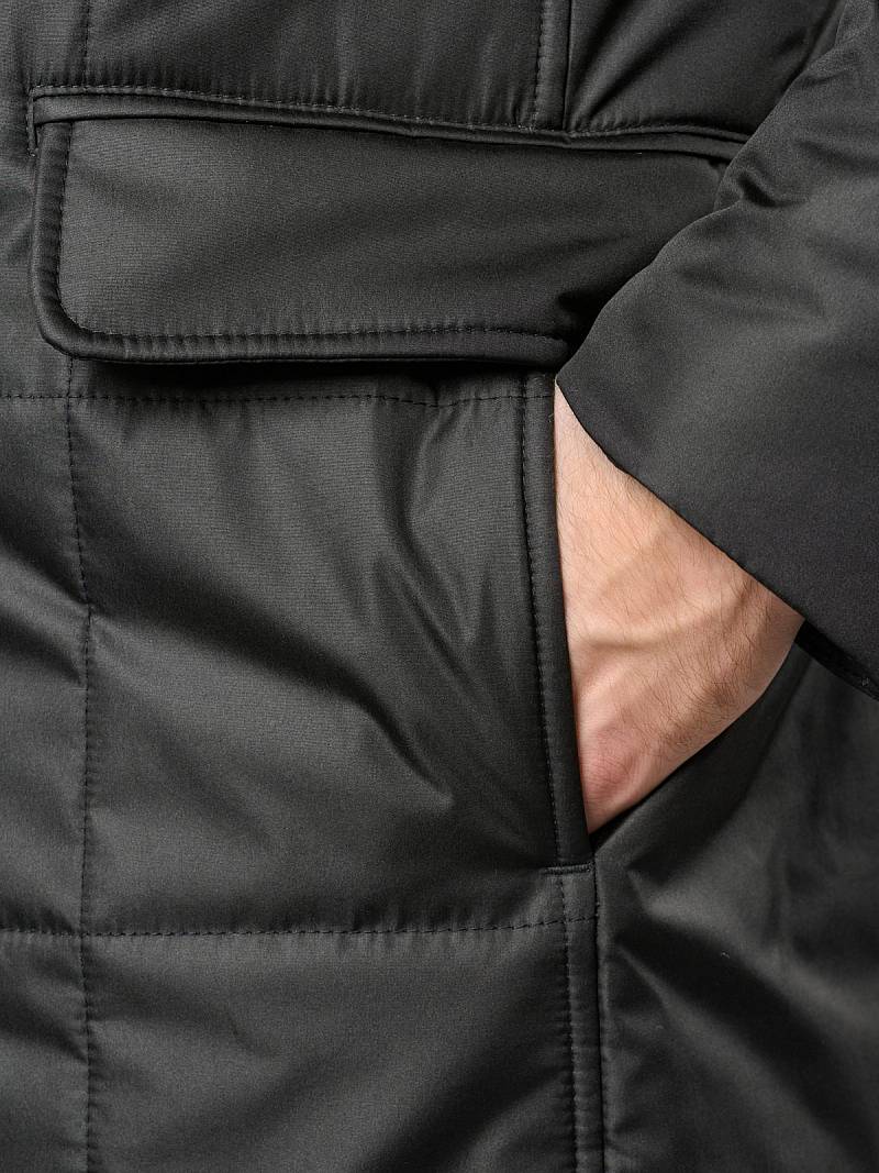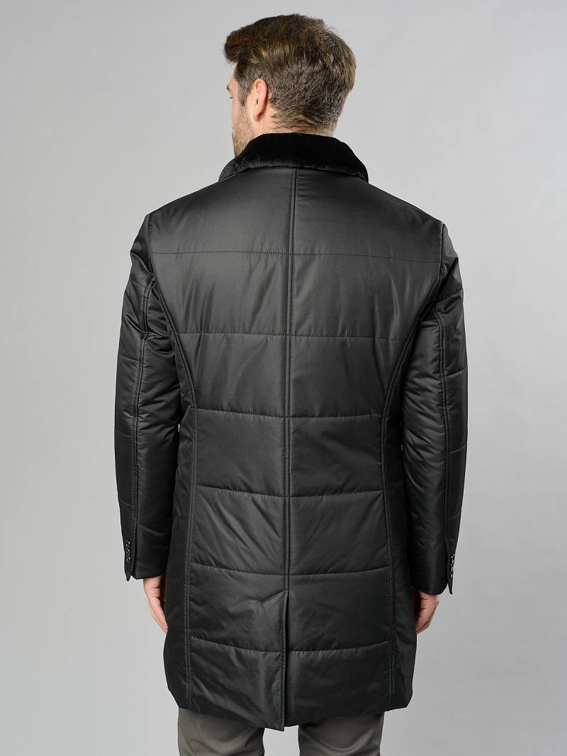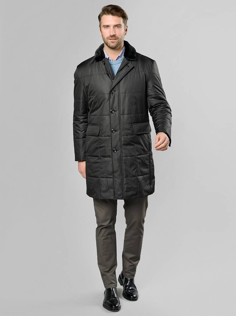 Мужская куртка-пальто утепленная с застежкой на молнию и 4 пуговицы. Воротник - меховой вшивной . Спинка, полочки и передняя часть рукавов простеганы стежкой "квадрат". Спинка со шлицей в среднем шве. Полочки с бочками, на полочках - два нижних боковых кармана с клапанами на магнитах. На левом рукаве нашивка герб. На подкладке- два внутренних кармана на пуговицах. Длина изделия по спинке для роста 176 - 95см. Ткань верха: 100%полиэстер. Подкладка: 100%полиэстер. Утеплитель: термоплюс 200гр/160гр. Воротник: мех