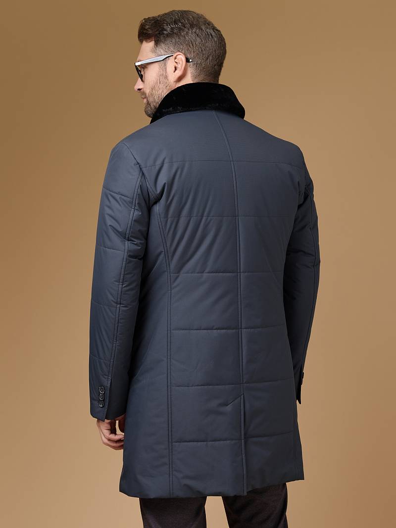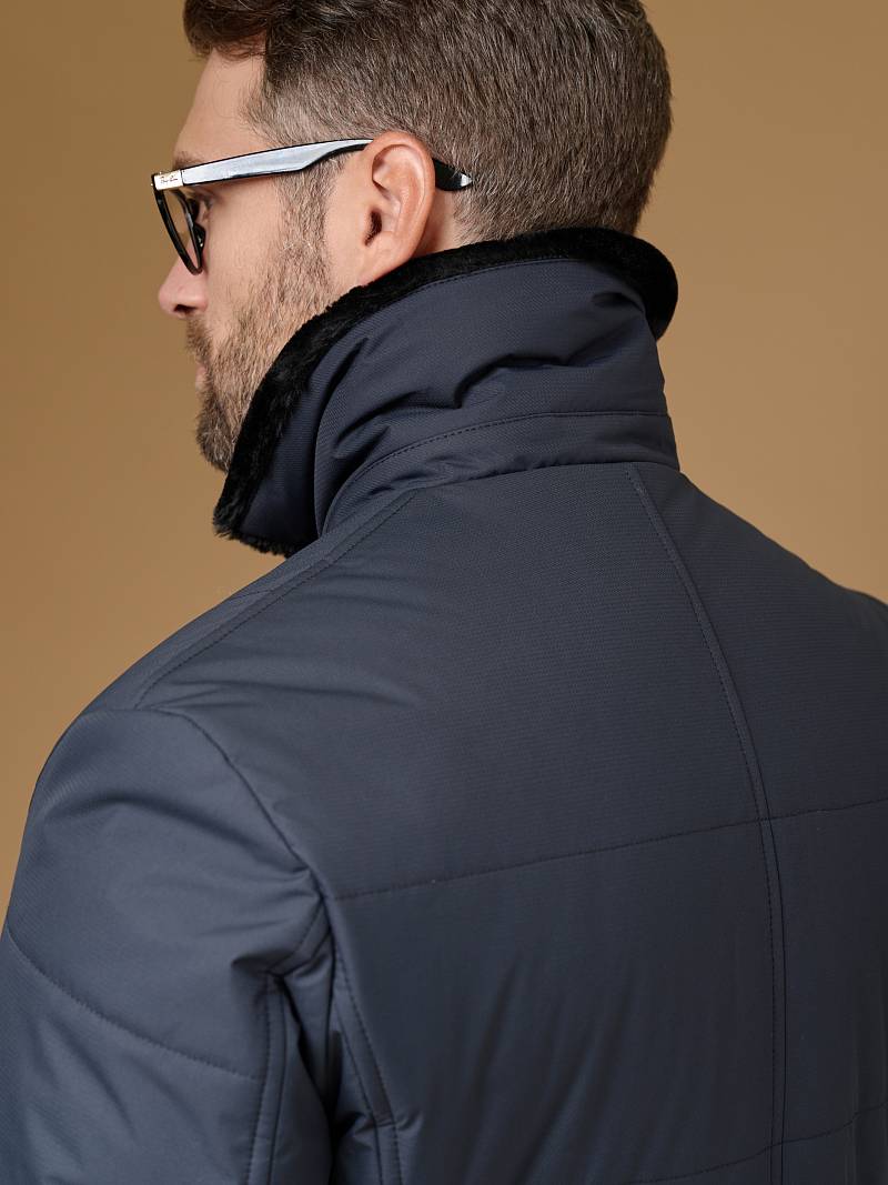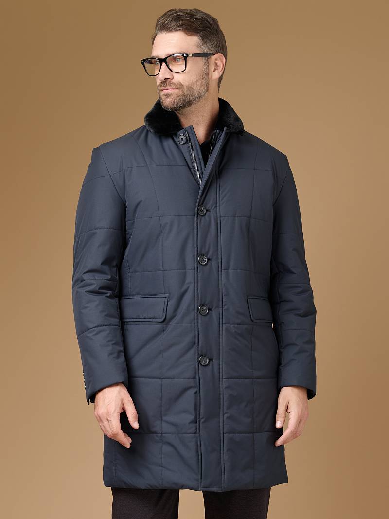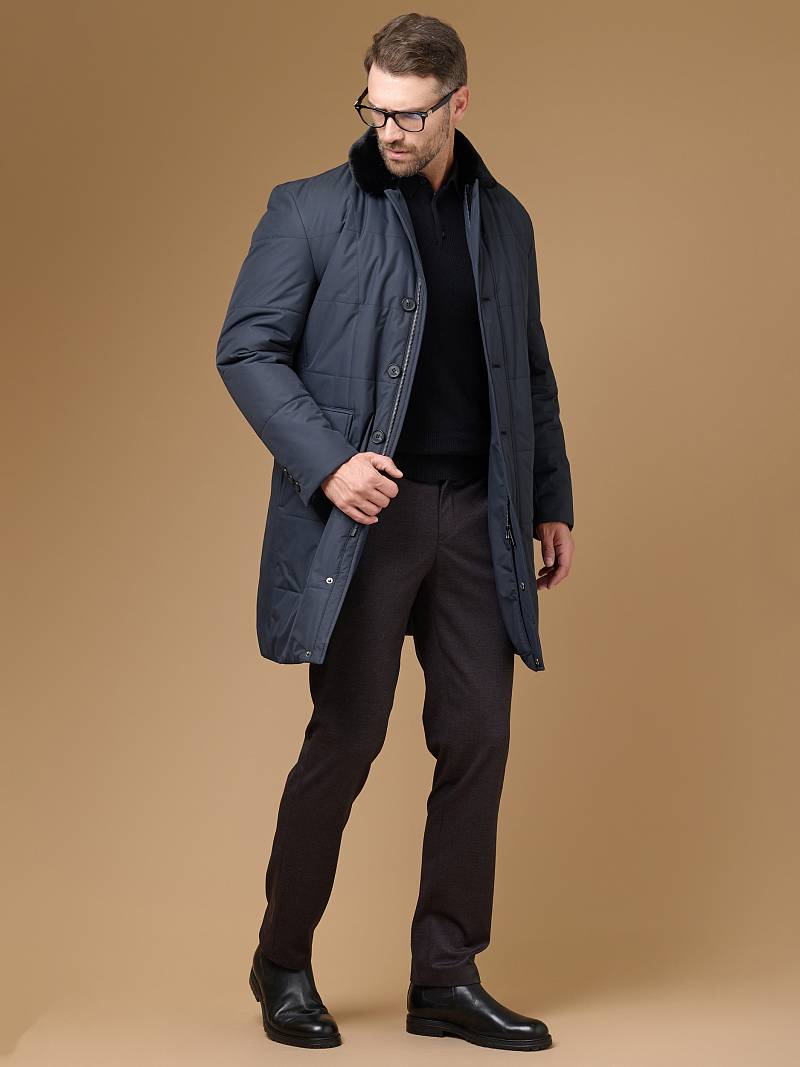 Мужская куртка-пальто утепленная с застежкой на молнию и 4 пуговицы. Воротник - меховой вшивной . Спинка, полочки и передняя часть рукавов простеганы стежкой "квадрат". Спинка со шлицей в среднем шве. Полочки с бочками, на полочках - два нижних боковых кармана с клапанами на магнитах. На левом рукаве нашивка герб. На подкладке- два внутренних кармана на пуговицах. Длина изделия по спинке для роста 176 - 95см. Ткань верха: 100%полиэстер. Подкладка: 100%полиэстер. Утеплитель: термоплюс 200гр/160гр. Воротник: мех
