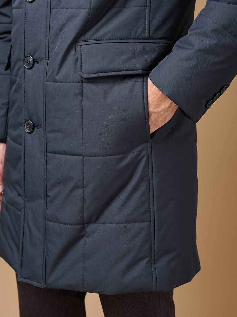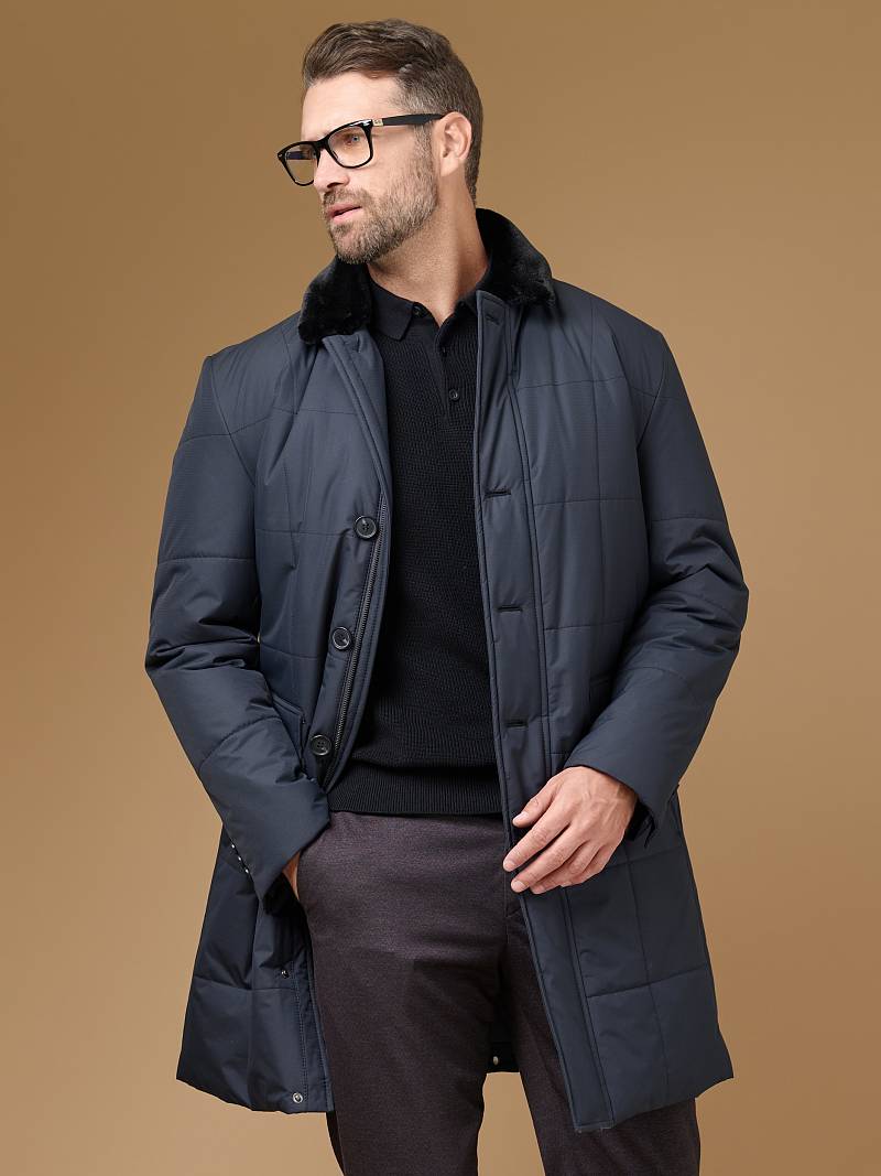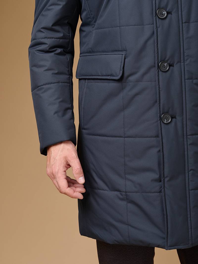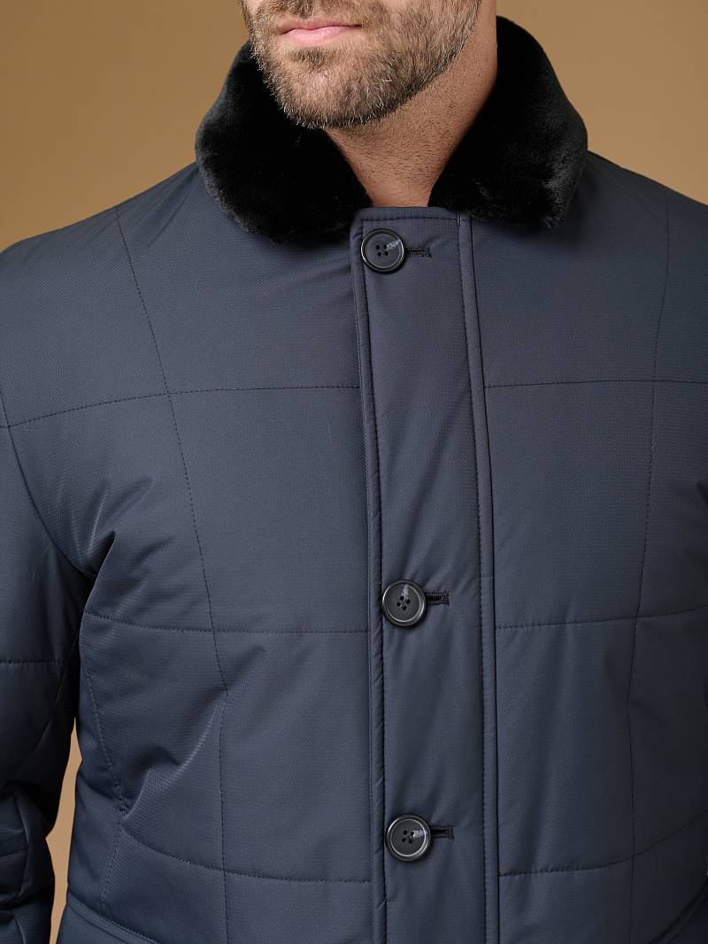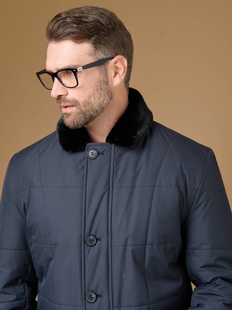 Мужская куртка-пальто утепленная с застежкой на молнию и 4 пуговицы. Воротник - меховой вшивной . Спинка, полочки и передняя часть рукавов простеганы стежкой "квадрат". Спинка со шлицей в среднем шве. Полочки с бочками, на полочках - два нижних боковых кармана с клапанами на магнитах. На левом рукаве нашивка герб. На подкладке- два внутренних кармана на пуговицах. Длина изделия по спинке для роста 176 - 95см. Ткань верха: 100%полиэстер. Подкладка: 100%полиэстер. Утеплитель: термоплюс 200гр/160гр. Воротник: мех