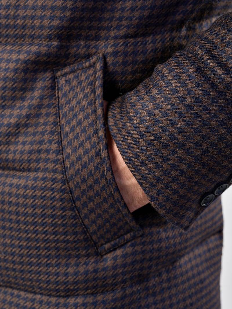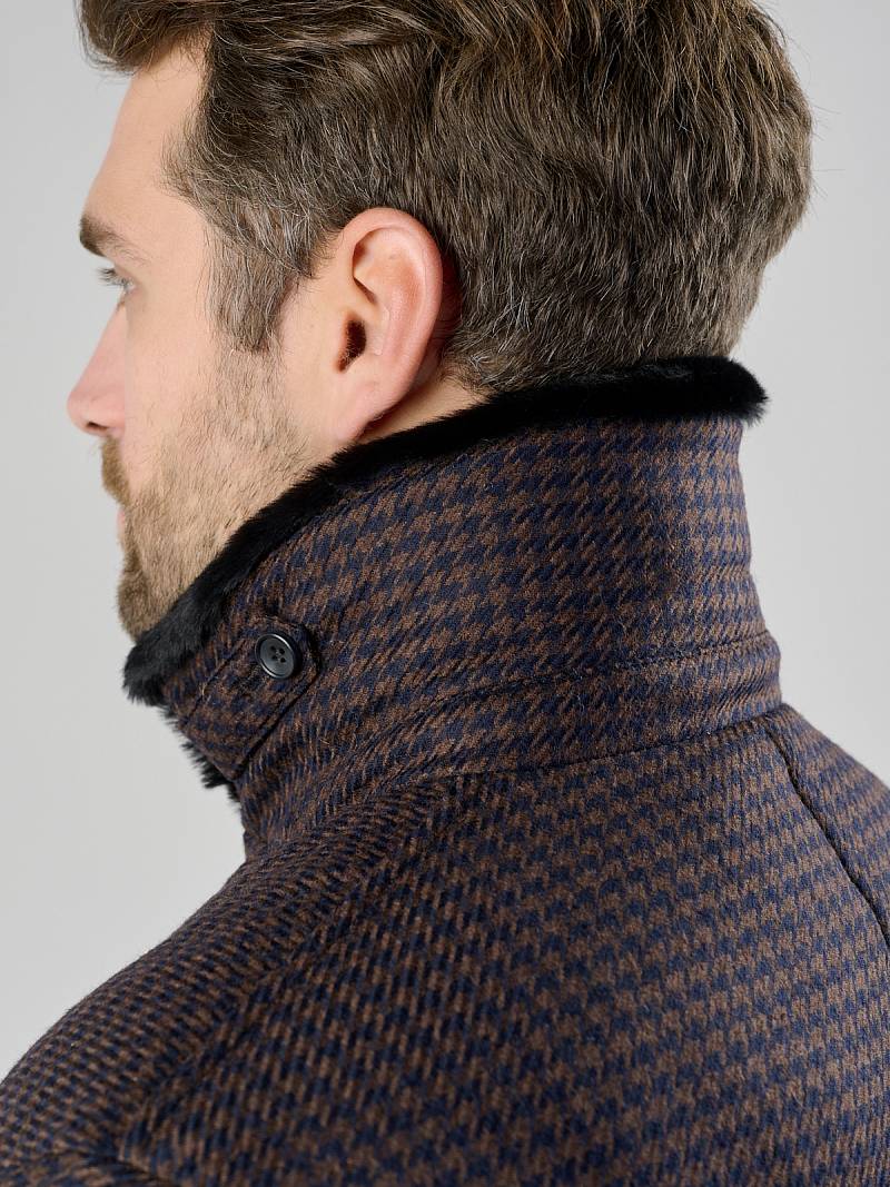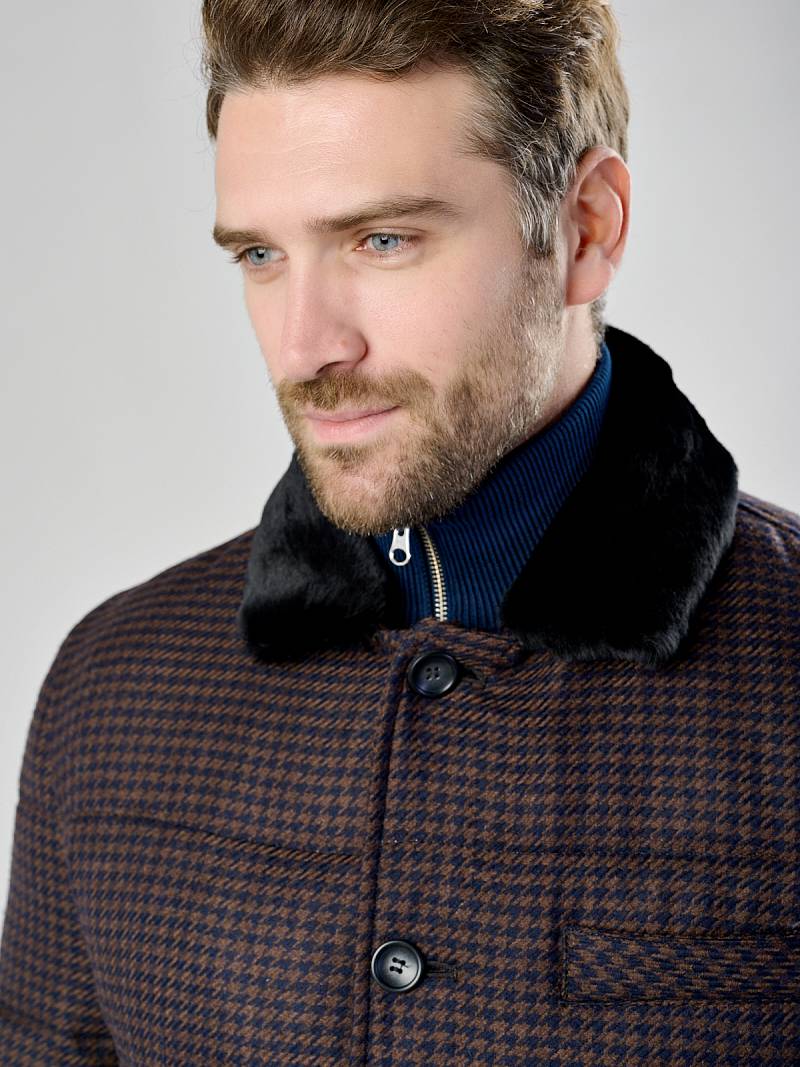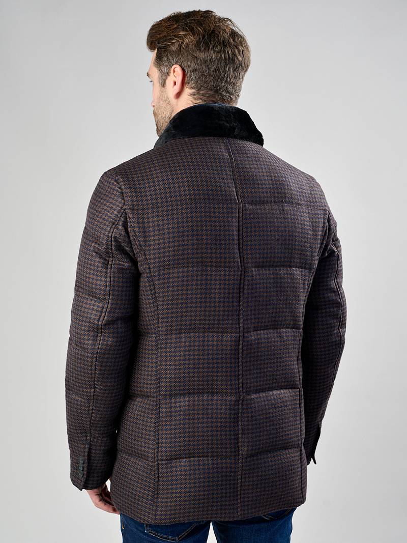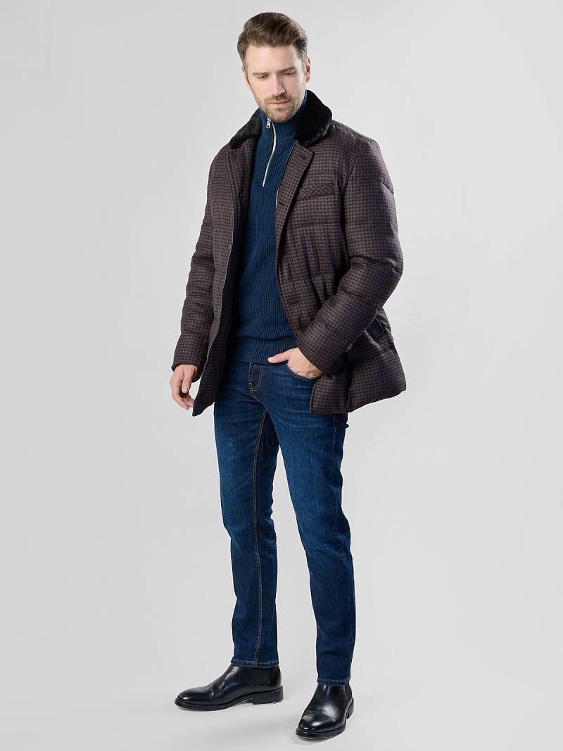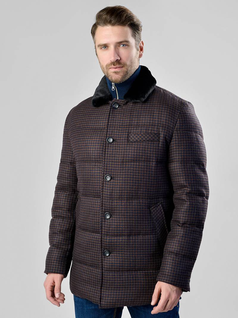 Куртка мужская утепленная укороченная с меховым отложным воротником. Застежка изделия центральная на молнию и 5 пуговиц. Спинка, полочка и передние части рукавов простеганы стежкой. На полочке боковые прорезные карманы с листочками на магнитах. Спинка со средним швом. По низу рукавов - иммитация шлицы на пуговицах. На подкладке - два внутренних прорезных кармана на молниях. Рекомендуется обработать изделие водонепроницаемым аэрозолем для защиты от неблагоприятных погодных условий. Длина изделия по спинке для роста 176 - 81см. Ткань верха: 100% шерсть. Подкладка: 100% полиэстер. Утеплитель: био- пух 180гр/160гр. Воротник: мех натуральный