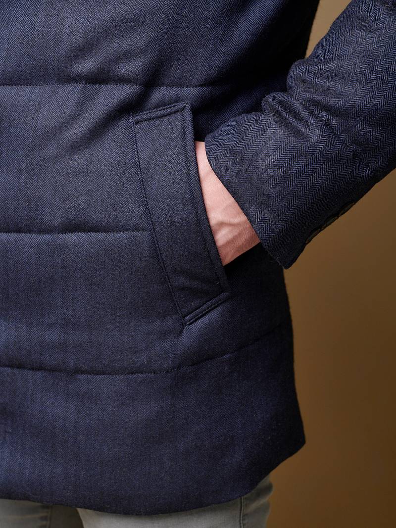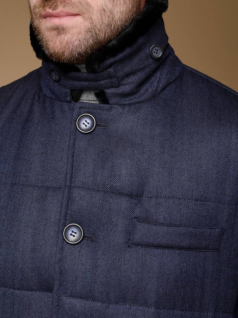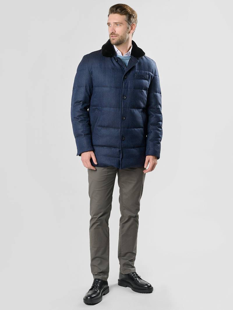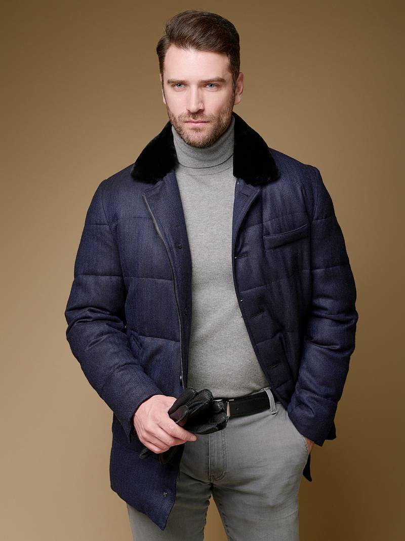 Куртка мужская утепленная укороченная с меховым отложным воротником. Застежка изделия центральная на молнию и 5 пуговиц. Спинка, полочка и передние части рукавов простеганы стежкой. На полочке боковые прорезные карманы с листочками на магнитах. Спинка со средним швом. По низу рукавов - иммитация шлицы на пуговицах. На подкладке - два внутренних прорезных кармана на молниях. Рекомендуется обработать изделие водонепроницаемым аэрозолем для защиты от неблагоприятных погодных условий. Длина изделия по спинке для роста 176 - 81см. Ткань верха: 100% шерсть. Подкладка: 100% полиэстер. Утеплитель: био- пух 180гр/160гр. Воротник: мех натуральный