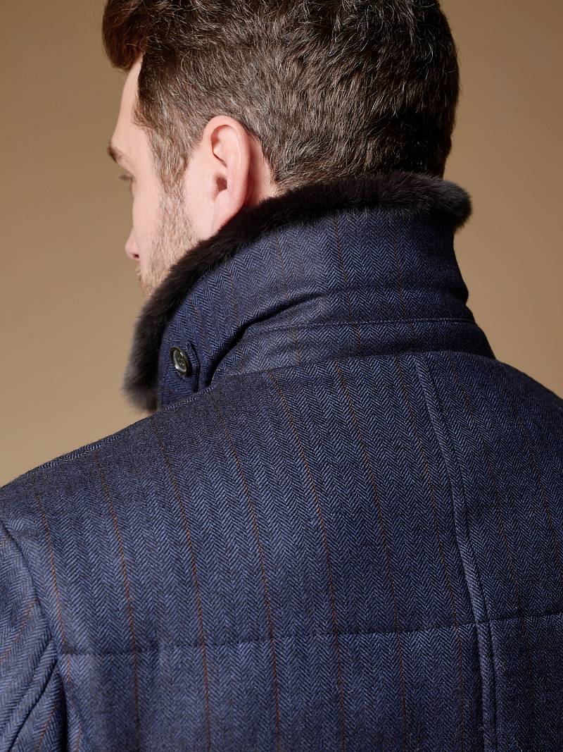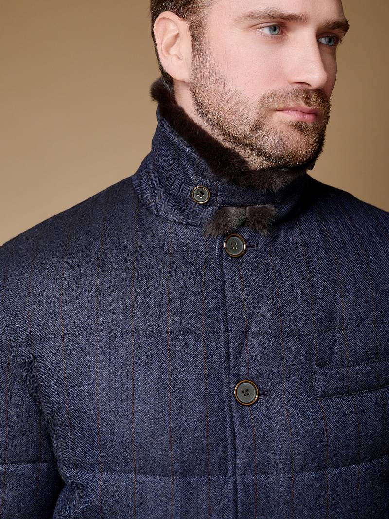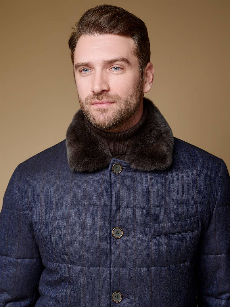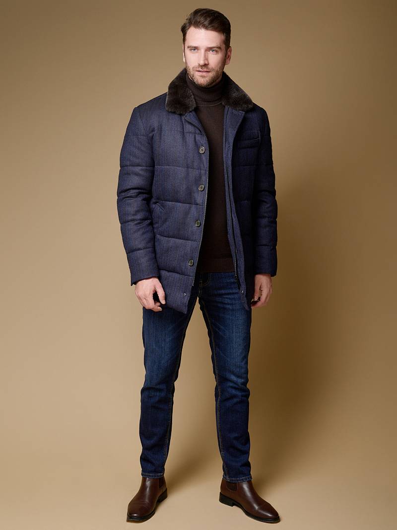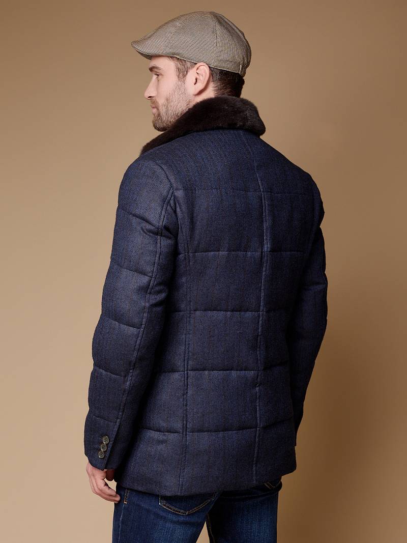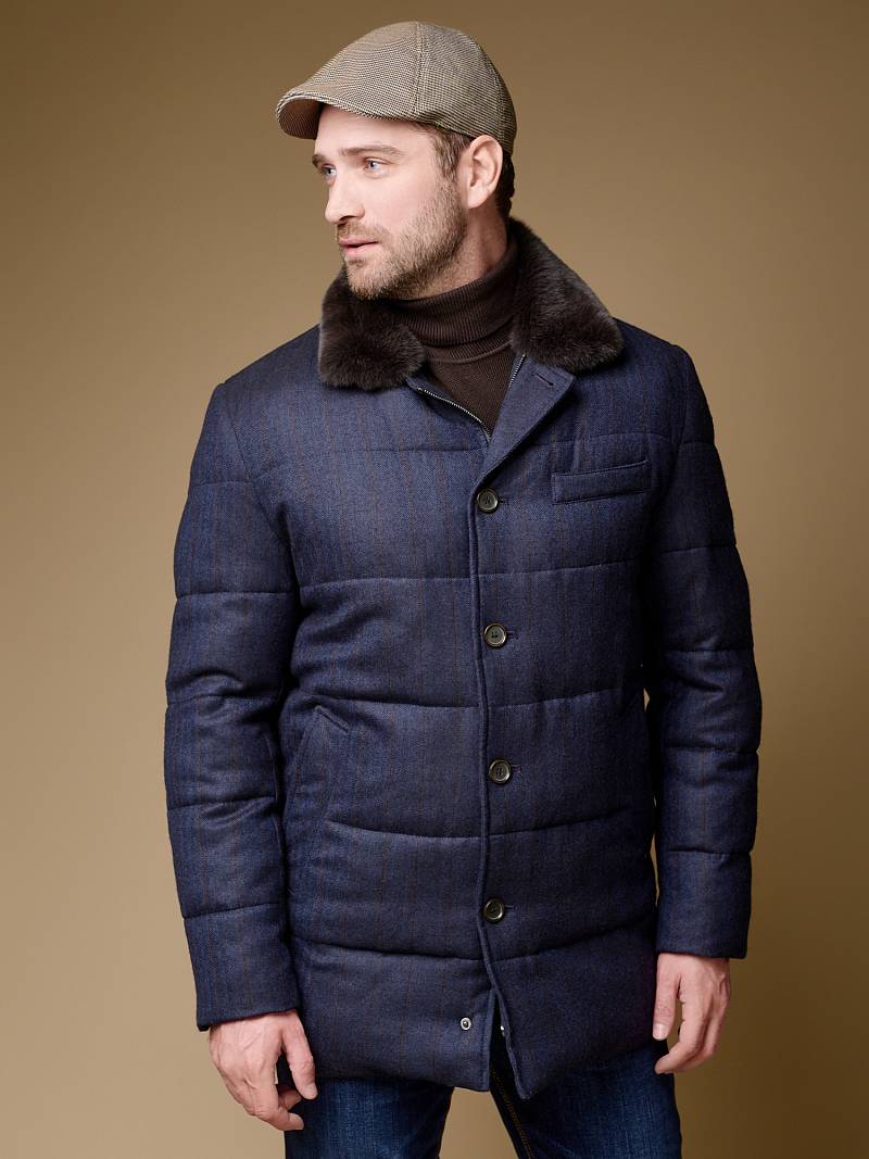 Куртка мужская утепленная укороченная с меховым отложным воротником. Застежка изделия центральная на молнию и 5 пуговиц. Спинка, полочка и передние части рукавов простеганы стежкой. На полочке боковые прорезные карманы с листочками на магнитах. Спинка со средним швом. По низу рукавов - иммитация шлицы на пуговицах. На подкладке - два внутренних прорезных кармана на молниях. Рекомендуется обработать изделие водонепроницаемым аэрозолем для защиты от неблагоприятных погодных условий. Длина изделия по спинке для роста 176 - 81см. Ткань верха: 100% шерсть. Подкладка: 100% полиэстер. Утеплитель: био- пух 180гр/160гр. Воротник: мех натуральный