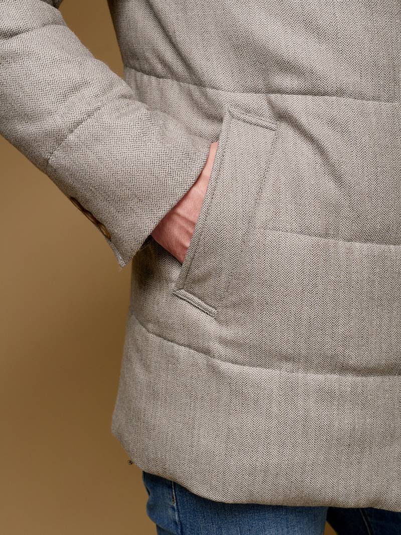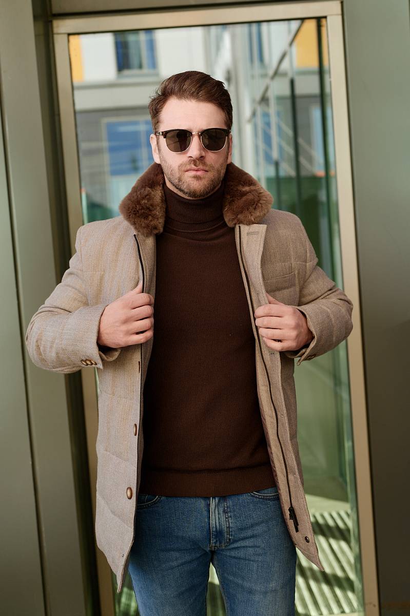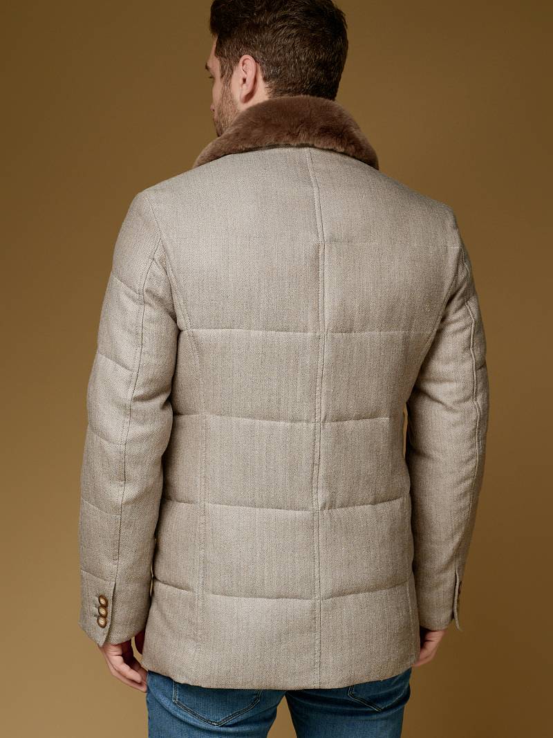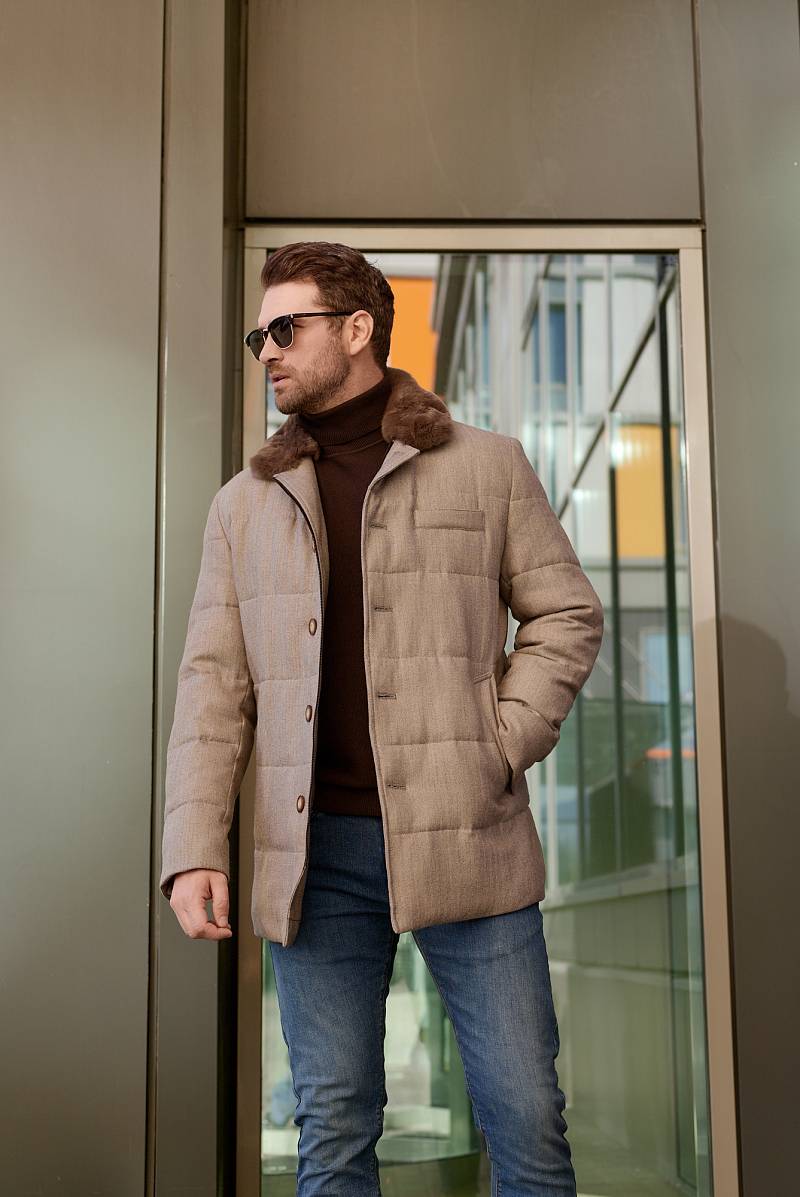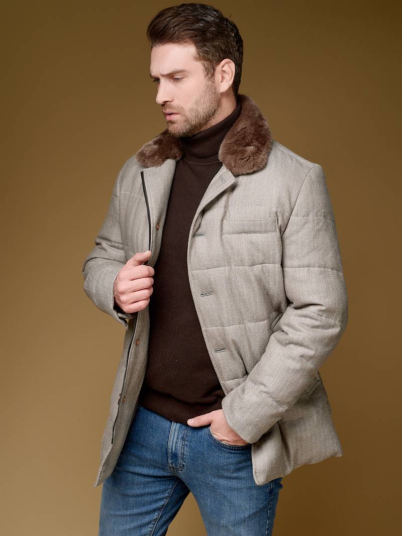 Куртка мужская утепленная укороченная с меховым отложным воротником. Застежка изделия центральная на молнию и 5 пуговиц. Спинка, полочка и передние части рукавов простеганы стежкой. На полочке боковые прорезные карманы с листочками на магнитах. Спинка со средним швом. По низу рукавов - иммитация шлицы на пуговицах. На подкладке - два внутренних прорезных кармана на молниях. Рекомендуется обработать изделие водонепроницаемым аэрозолем для защиты от неблагоприятных погодных условий. Длина изделия по спинке для роста 176 - 81см. Ткань верха: 100% шерсть. Подкладка: 100% полиэстер. Утеплитель: био- пух 180гр/160гр. Воротник: мех натуральный