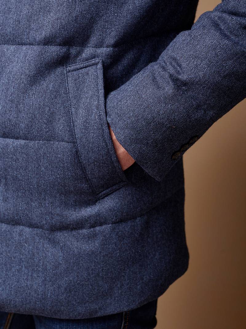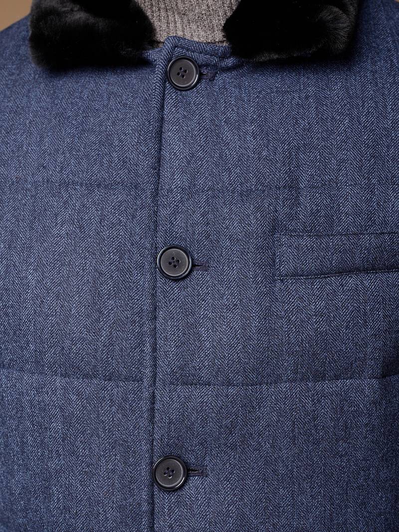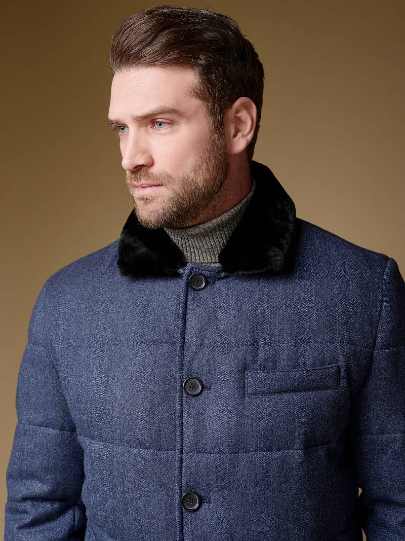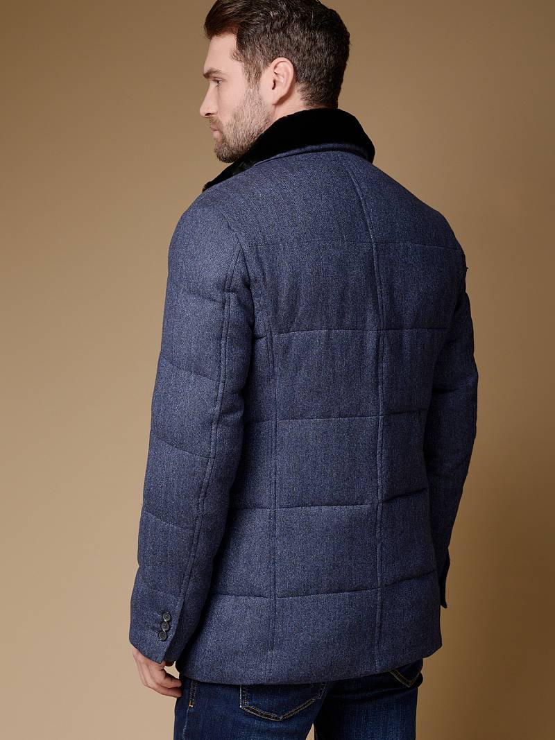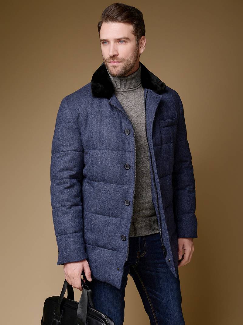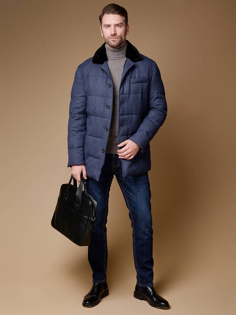 Куртка мужская утепленная укороченная с меховым отложным воротником. Застежка изделия центральная на молнию и 5 пуговиц. Спинка, полочка и передние части рукавов простеганы стежкой. На полочке боковые прорезные карманы с листочками на магнитах. Спинка со средним швом. По низу рукавов - иммитация шлицы на пуговицах. На подкладке - два внутренних прорезных кармана на молниях. Рекомендуется обработать изделие водонепроницаемым аэрозолем для защиты от неблагоприятных погодных условий. Длина изделия по спинке для роста 176 - 81см. Ткань верха: 100% шерсть. Подкладка: 100% полиэстер. Утеплитель: био- пух 180гр/160гр. Воротник: мех натуральный