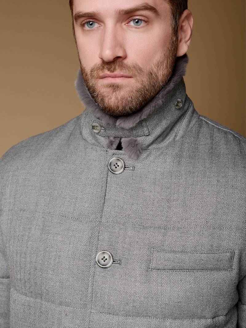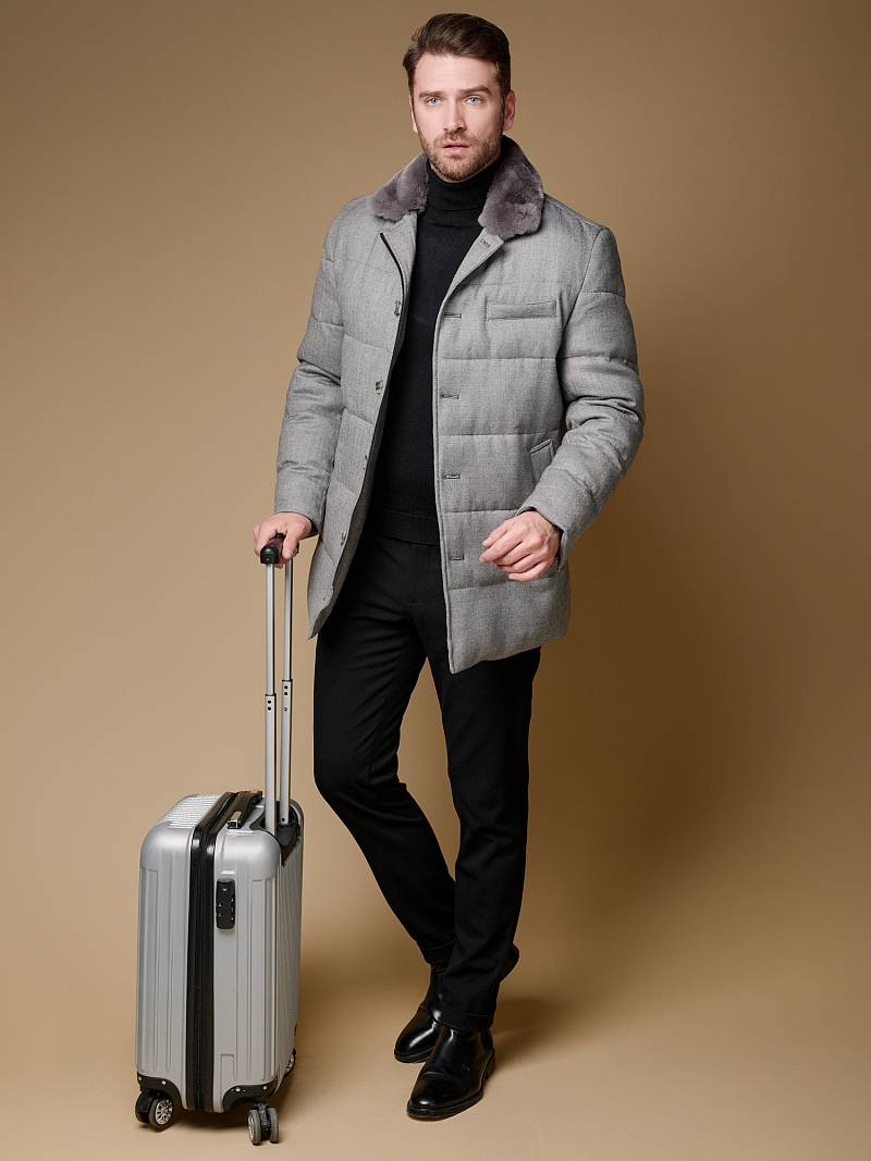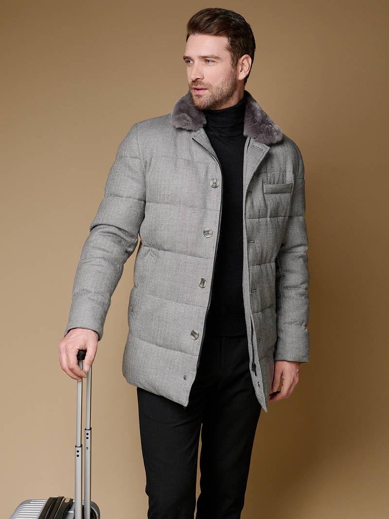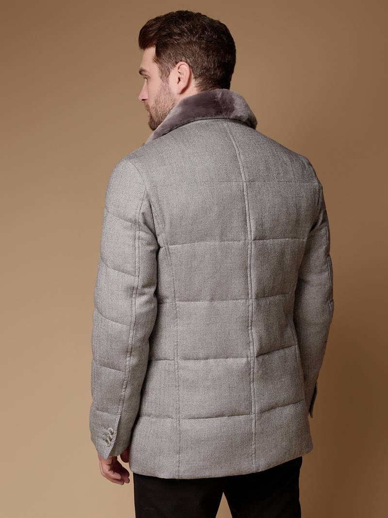 Куртка мужская утепленная укороченная с меховым отложным воротником. Застежка изделия центральная на молнию и 5 пуговиц. Спинка, полочка и передние части рукавов простеганы стежкой. На полочке боковые прорезные карманы с листочками на магнитах. Спинка со средним швом. По низу рукавов - иммитация шлицы на пуговицах. На подкладке - два внутренних прорезных кармана на молниях. Рекомендуется обработать изделие водонепроницаемым аэрозолем для защиты от неблагоприятных погодных условий. Длина изделия по спинке для роста 176 - 81см. Ткань верха: 100% шерсть. Подкладка: 100% полиэстер. Утеплитель: био- пух 180гр/160гр. Воротник: мех натуральный