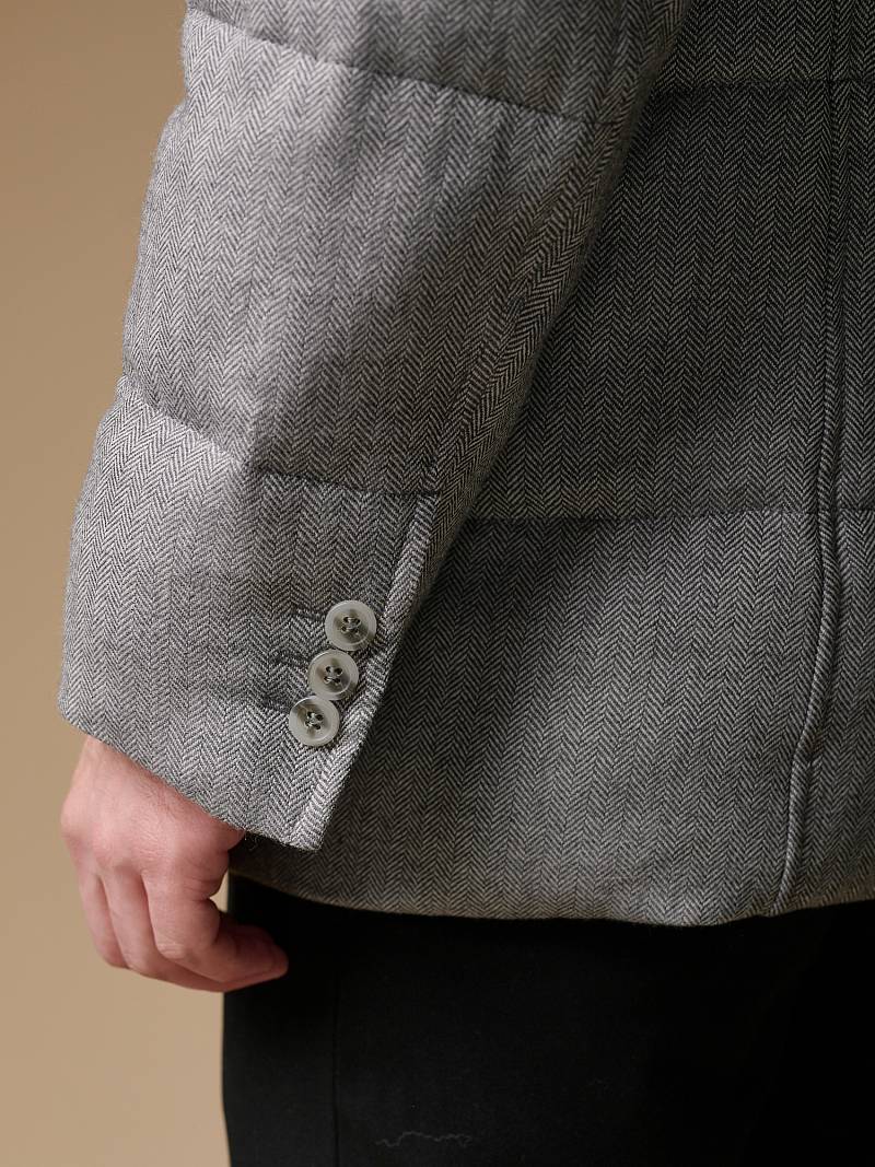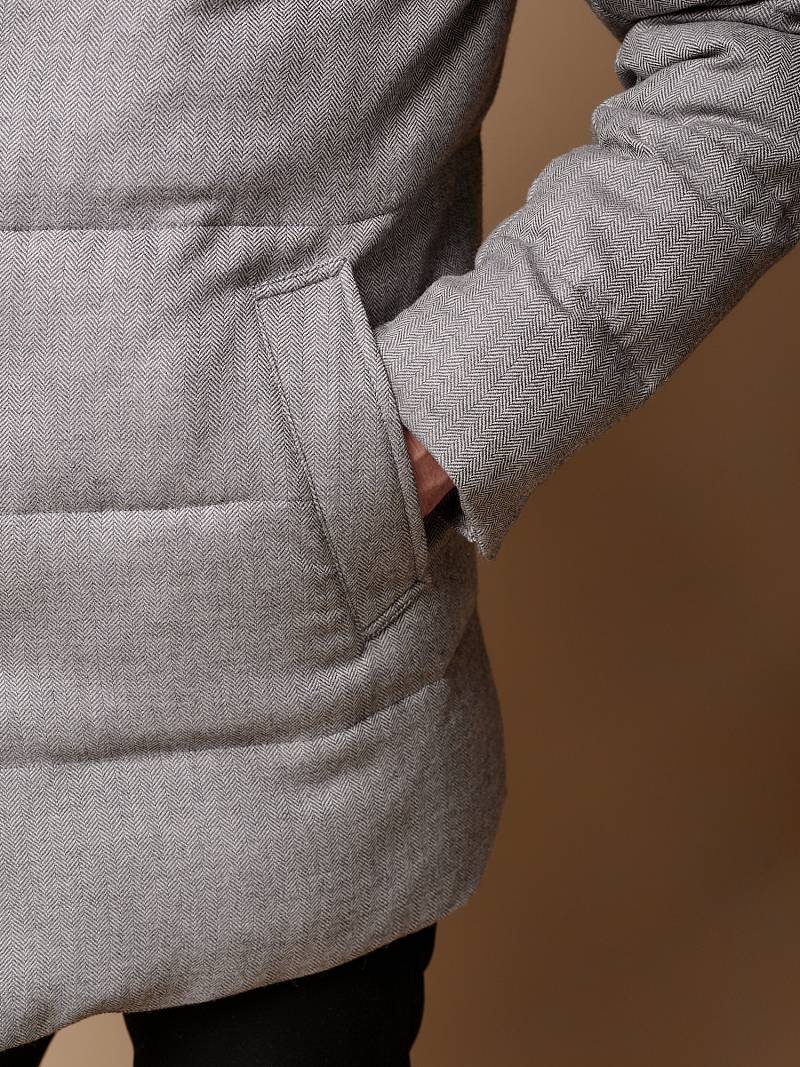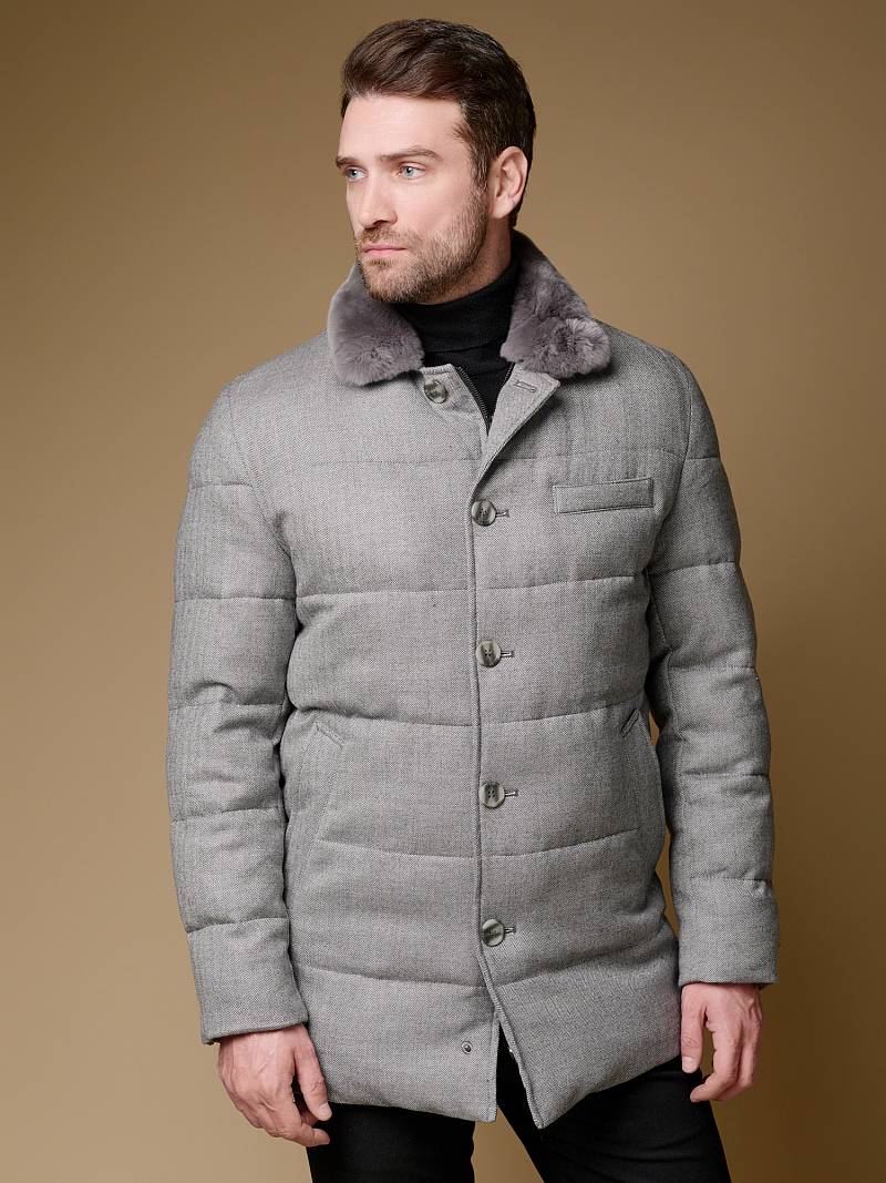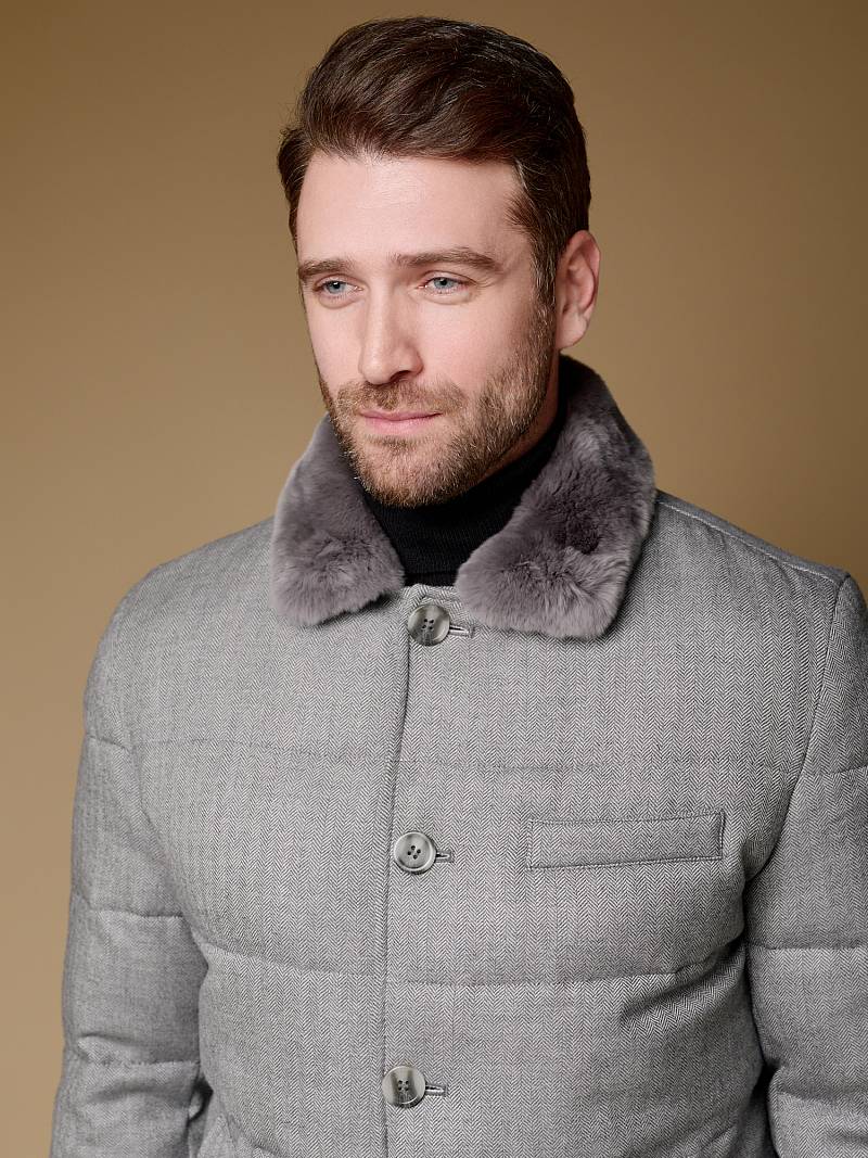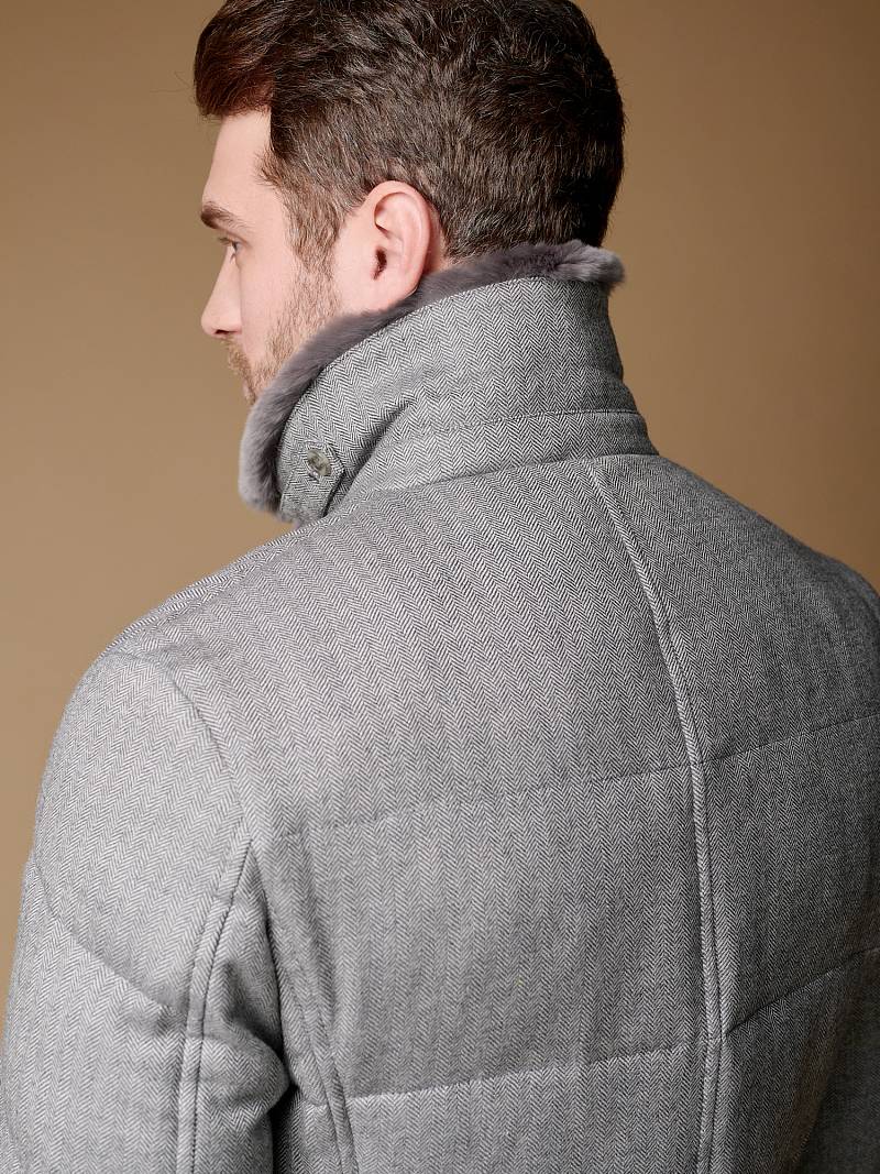 Куртка мужская утепленная укороченная с меховым отложным воротником. Застежка изделия центральная на молнию и 5 пуговиц. Спинка, полочка и передние части рукавов простеганы стежкой. На полочке боковые прорезные карманы с листочками на магнитах. Спинка со средним швом. По низу рукавов - иммитация шлицы на пуговицах. На подкладке - два внутренних прорезных кармана на молниях. Рекомендуется обработать изделие водонепроницаемым аэрозолем для защиты от неблагоприятных погодных условий. Длина изделия по спинке для роста 176 - 81см. Ткань верха: 100% шерсть. Подкладка: 100% полиэстер. Утеплитель: био- пух 180гр/160гр. Воротник: мех натуральный