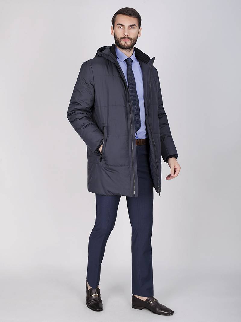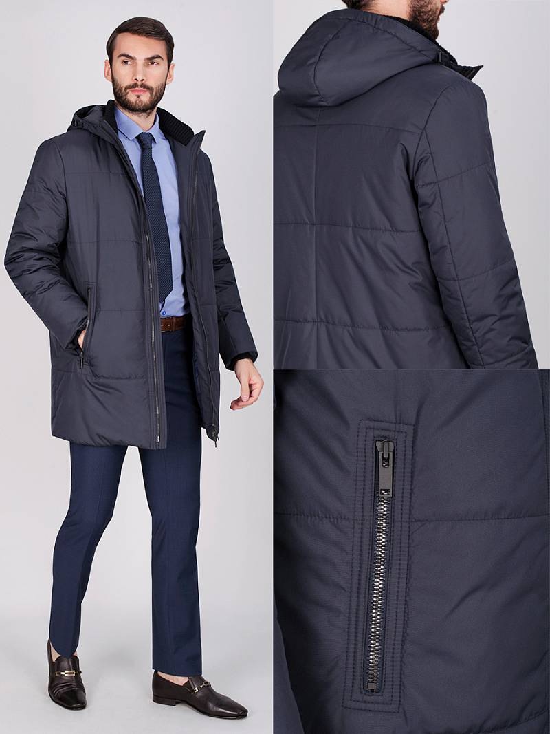 Куртка мужская утепленная с капюшоном из плащевой ткани на подкладке с центральной застежкой на двухзамковую молнию до низа изделия. Воротник стойка из трикотажного полотна. Несъемный капюшон. Передний край капюшона - оформлен кулисой, которая затягивается двумя фиксаторами. Полочки, спинка и рукава простеганы горизонтальной стежкой. Боковые карманы на молниях. В нижней части левого бокового кармана -металлическая нашивка с логотипом. Вдоль центральной застежки и вокруг боковых карманов- проложена тройная декоративная отделочная строчка, нитками в тон изделия. Рукава втачные состоят из двух частей, На верхней части левого рукава- фирменная нашивка. По низу рукавов- невидные ветрозащитные трикотажные манжеты. На подкладке спинки в области талии - отделочная тесьма с фирменным логотипом , на полочках подкладки- 2 внутренних прорезных кармана с втачной листочкой на молнии. Длина изделия по спинке для роста 176 - 90см. Ткань верха: 100%полиэстер. Подкладка: 100%полиэстер. Утеплитель: термоплюс 160гр