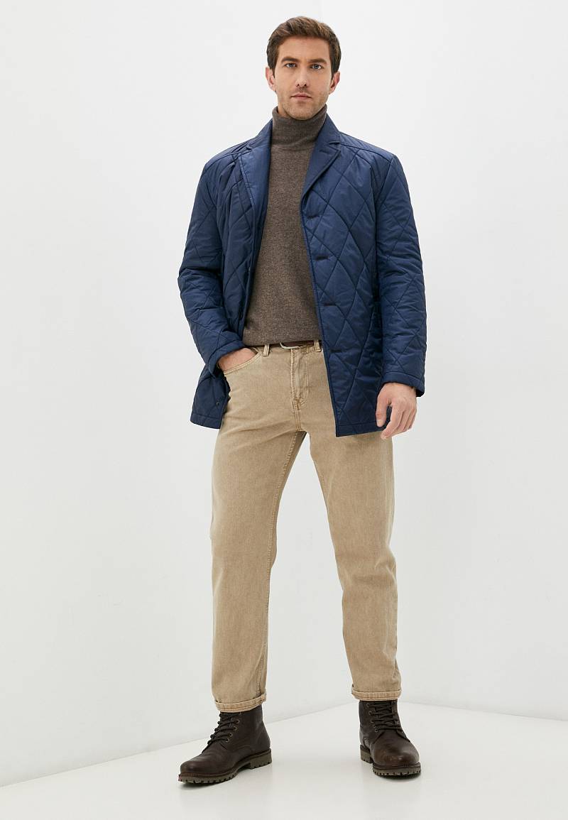 Куртка мужская утепленная c английским воротником с центральной застежкой на 4 пуговицы и одну потайную кнопку. Воротник - с лацканами из плащевой основной ткани, на лацкане - декоративная петля. Полочки, спинка и рукава простеганы одинарной стежкой "ромб". Полочки с кокетками, боковые карманы с листочками располагаются в рельефных швах. По спинке две шлицы, которые также расположены в рельефных швах. Рукава втачные состоят из двух частей, На полочках подкладки- 2 внутренних прорезных кармана с фигурным клапаном. Длина изделия по спинке для роста 176 - 80см. Ткань верха: 100%полиэстер. Подкладка: 100%полиэстер. Утеплитель: термоплюс 160 гр./140гр.