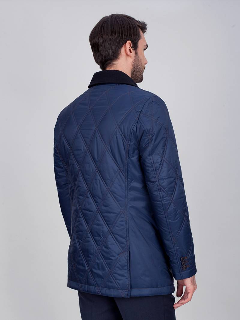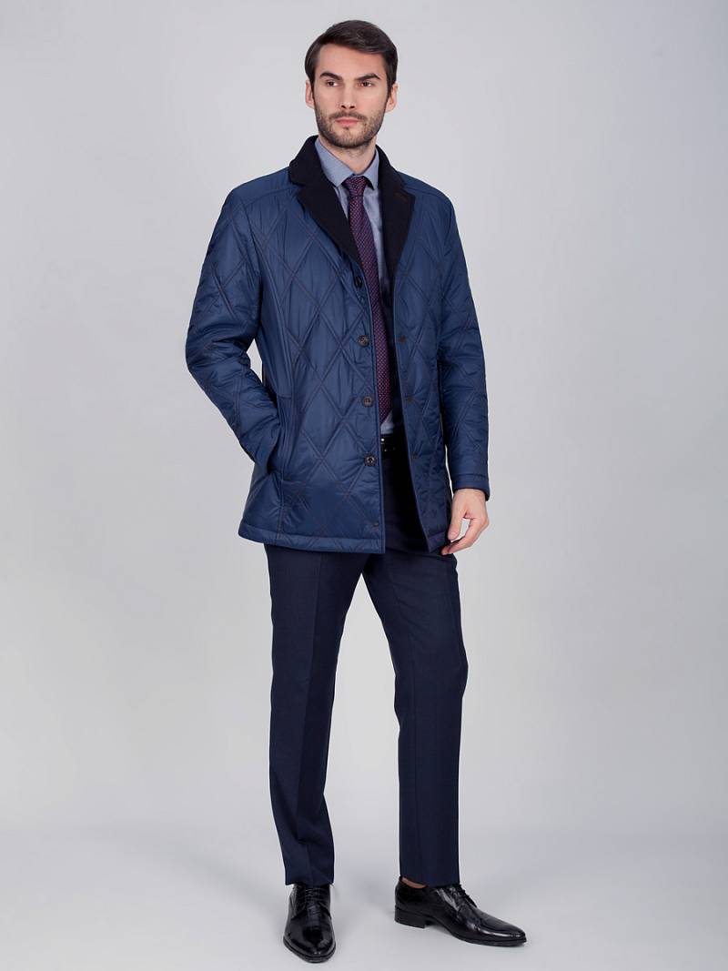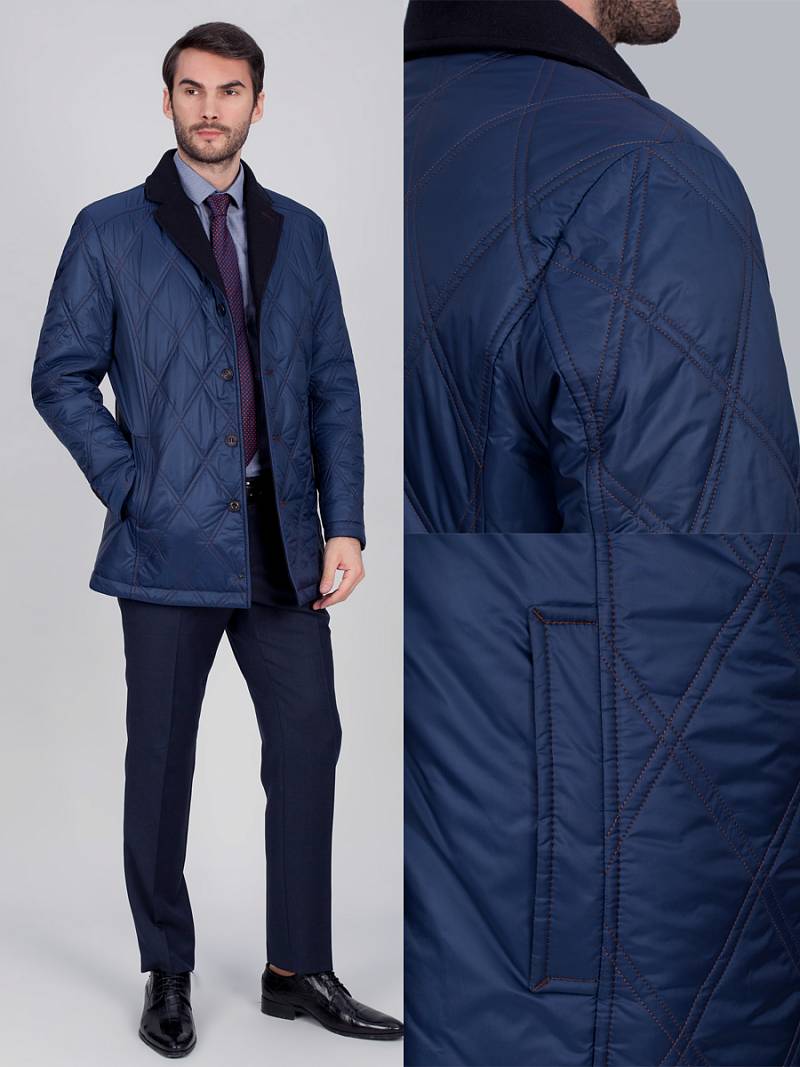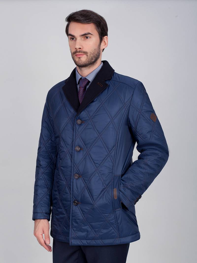 Куртка мужская утепленная c английским воротником с центральной застежкой на 4 пуговицы и одну потайную кнопку. Воротник - с лацканами из отделочной шерстяной ткани, на лацкане - декоративная петля. Полочки, спинка и рукава простеганы двойной стежкой "ромб". Полочки с кокетками, боковые карманы с листочками располагаются в рельефных швах. По спинке две шлицы, которые также расположены в рельефных швах. Рукава втачные состоят из двух частей, На верхней части левого рукава- фирменная нашивка. На подкладке спинки в области талии - отделочная тесьма с фирменным логотипом , на полочках подкладки- 2 внутренних прорезных кармана с фигурным клапаном. Длина изделия по спинке для роста 176 - 80см. Ткань верха: 100%полиэстер. Подкладка: 100%полиэстер. Утеплитель: термоплюс 160гр